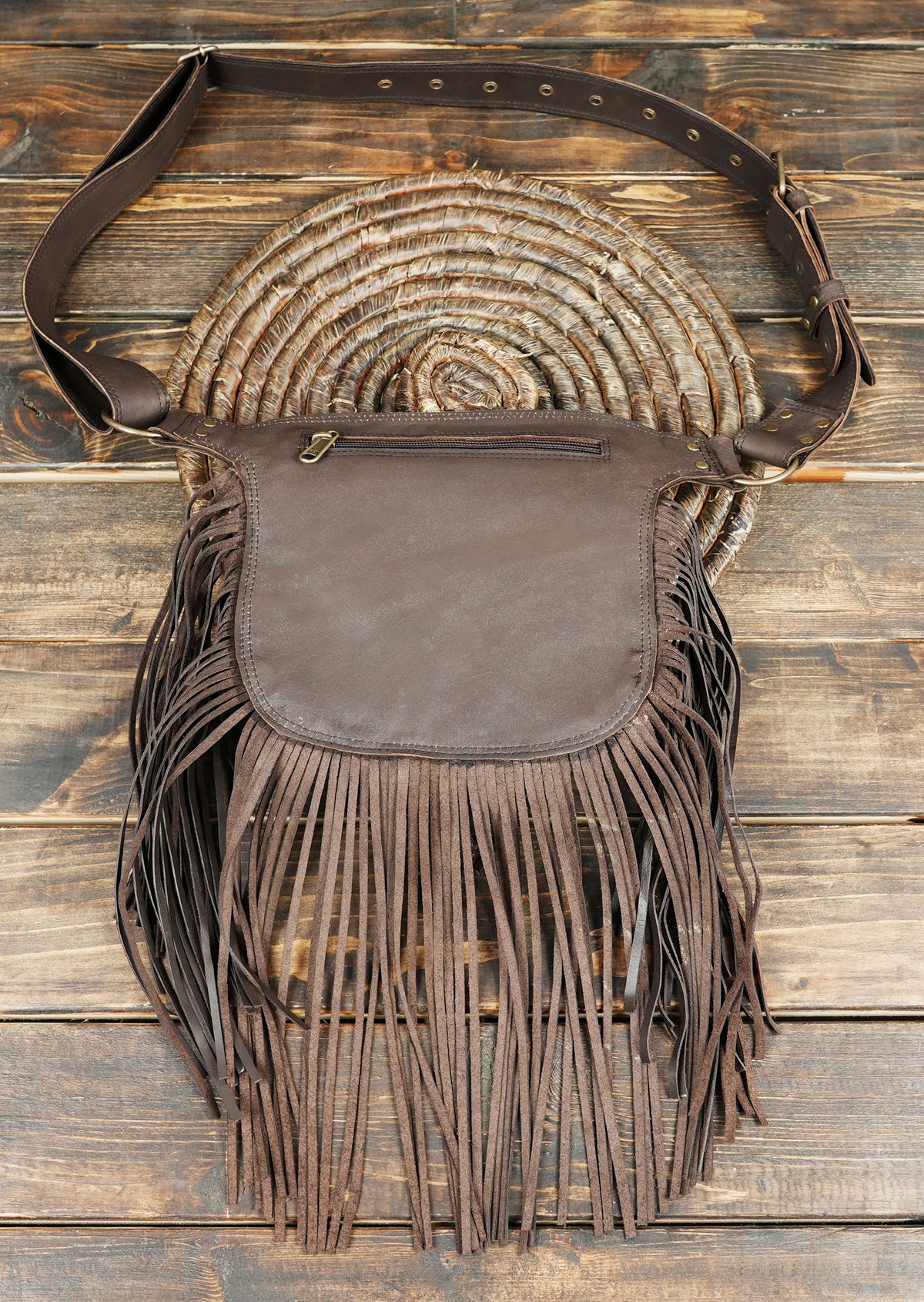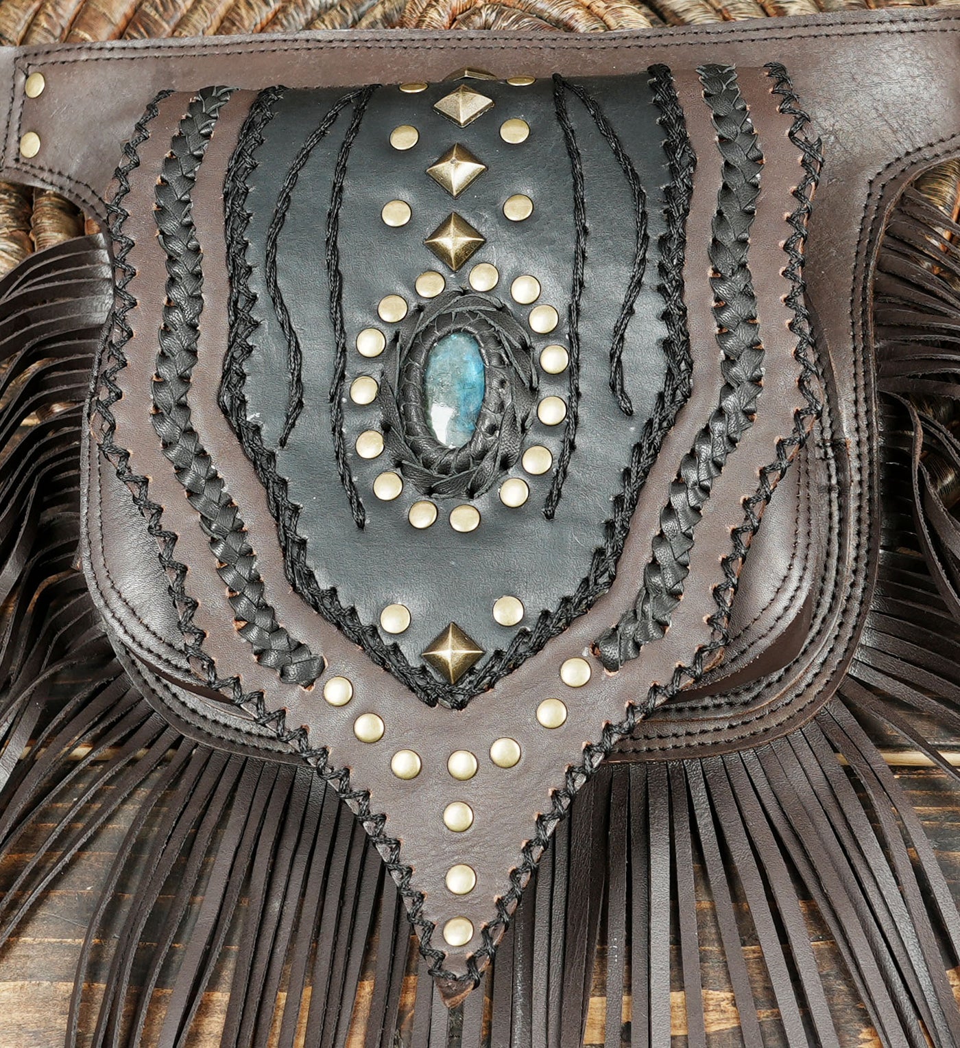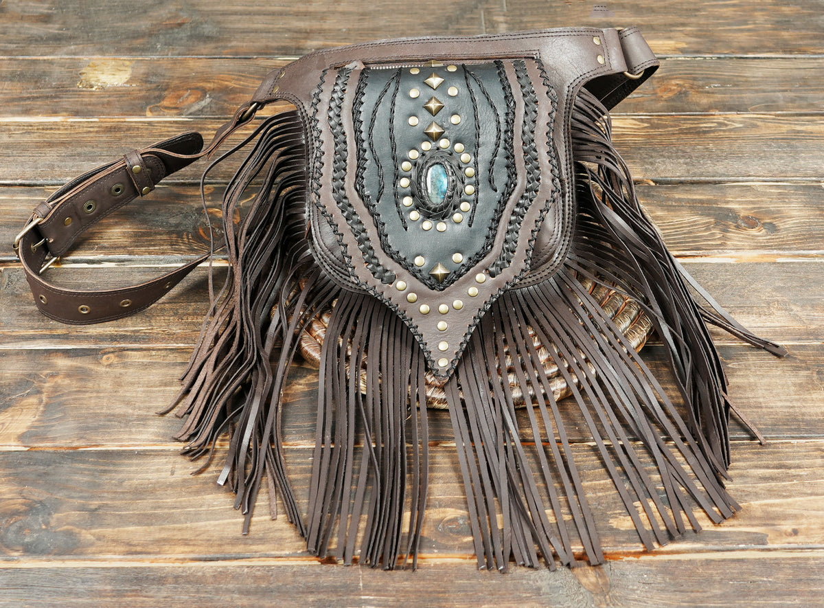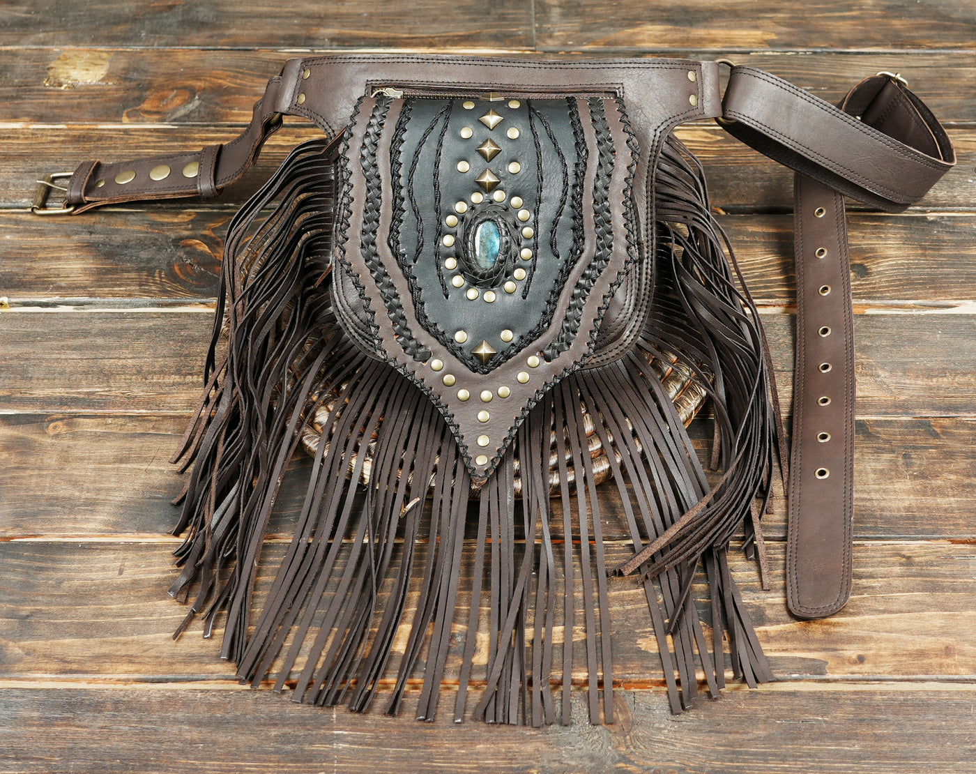 Handmade Fringe Leather Waist Belt Bag | Gemstone Festival Pouch | Boho Hip belt| Burning Man Belt (LT-AB-WB-6161) - Dark Brown / S - 28 TO 32