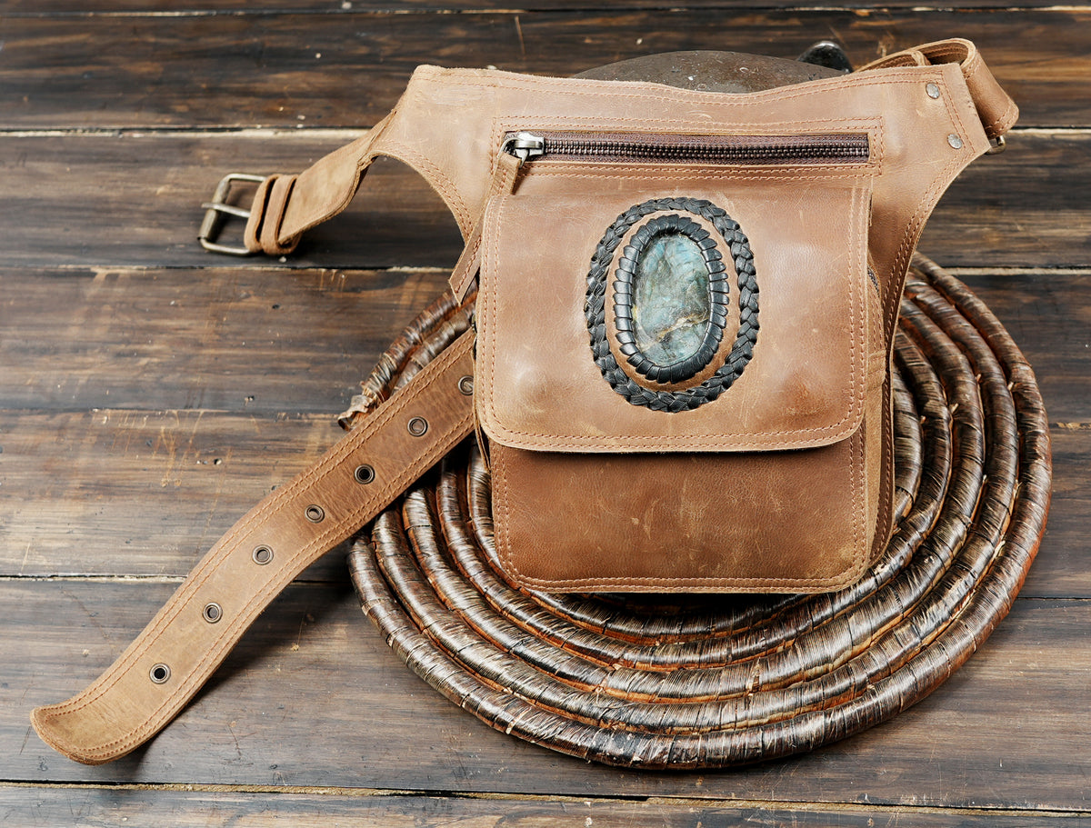 Handmade Brown Leather Waist Belt – Utility Bag with Gemstone Accent (LT-AB-WB-6021) - Brown / S = 28 to 32