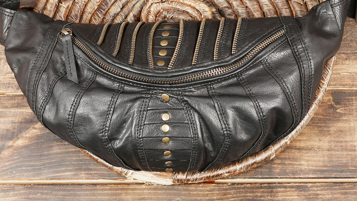 ハンドメイドブラックレザーショルダーベルトバッグ | スチームパンクフェスティバルウエストパック | 真鍮スタッズ付きユニセックスレザークロスボディベルト (LT/AB/SB/6011) - Black