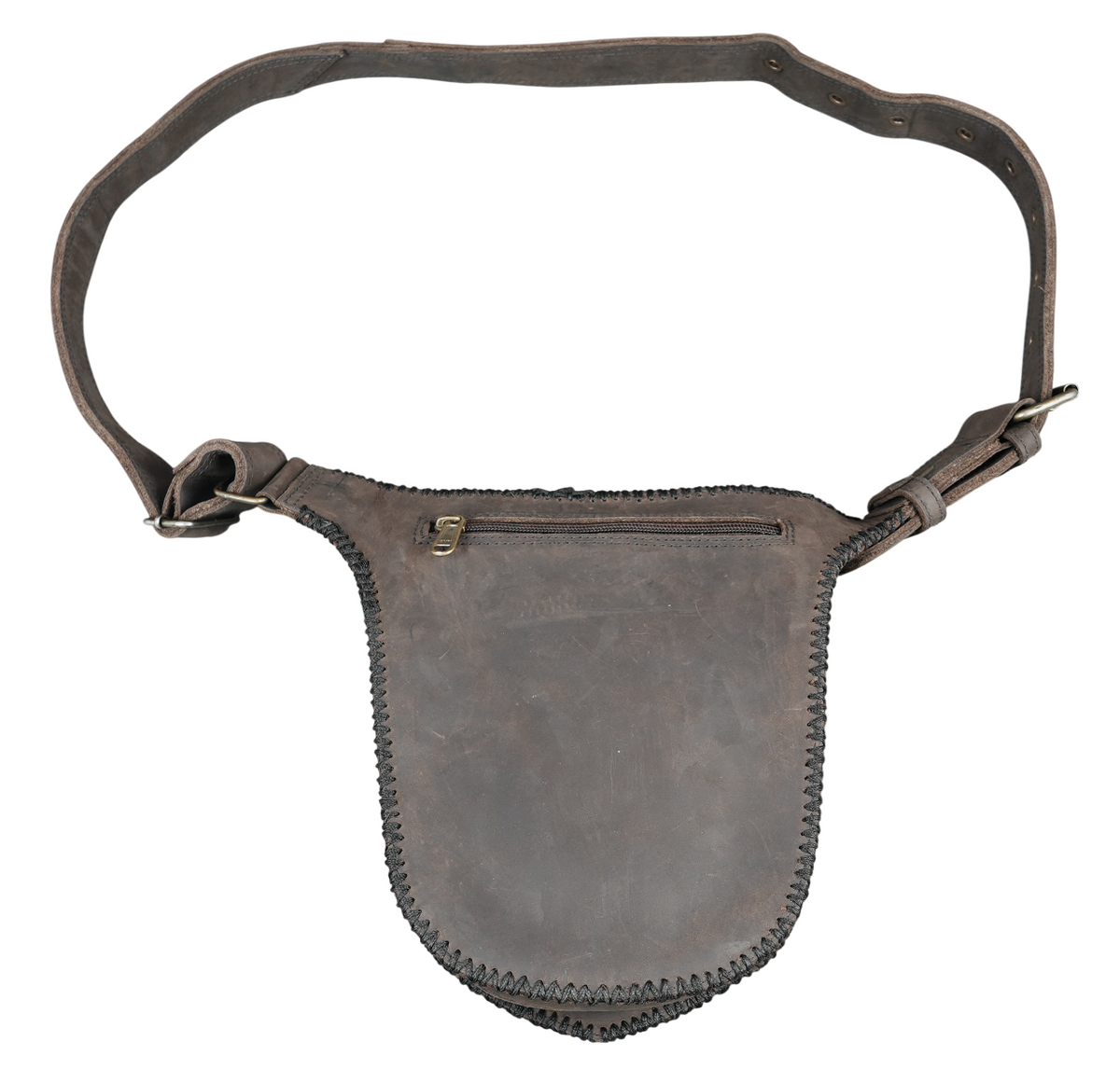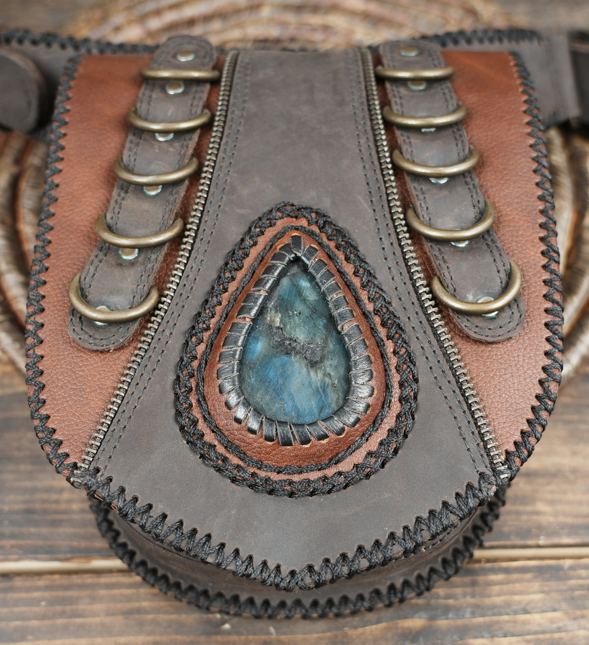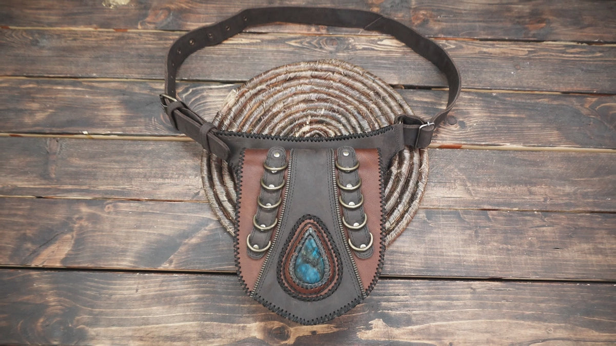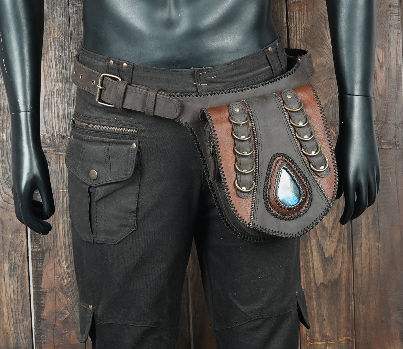 This leather waist belt is made with layered panels in warm brown tones and decorated with a teardrop stone centerpiece for a distinctive handcrafted look. It includes metal rings and stitched detailing that add character while keeping it durable for regular use. The belt is adjustable for a comfortable fit and offers a practical hands-free way to carry small essentials, making it a useful piece for festivals, travel, cosplay, outdoor events or casual everyday outfits.