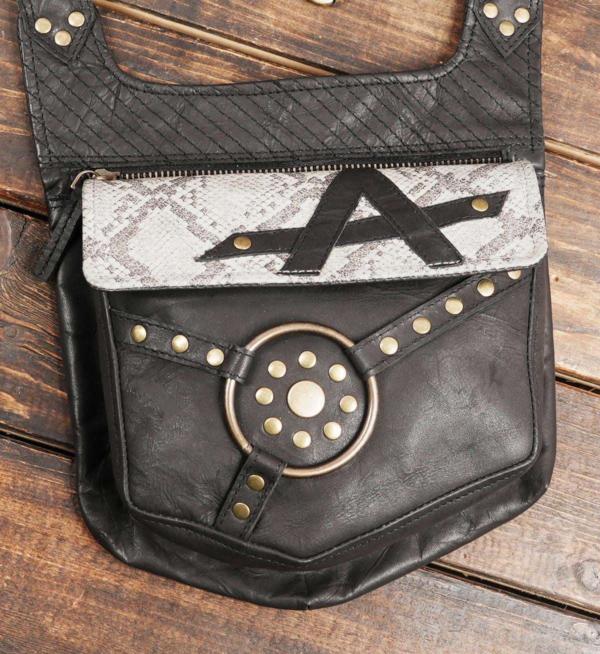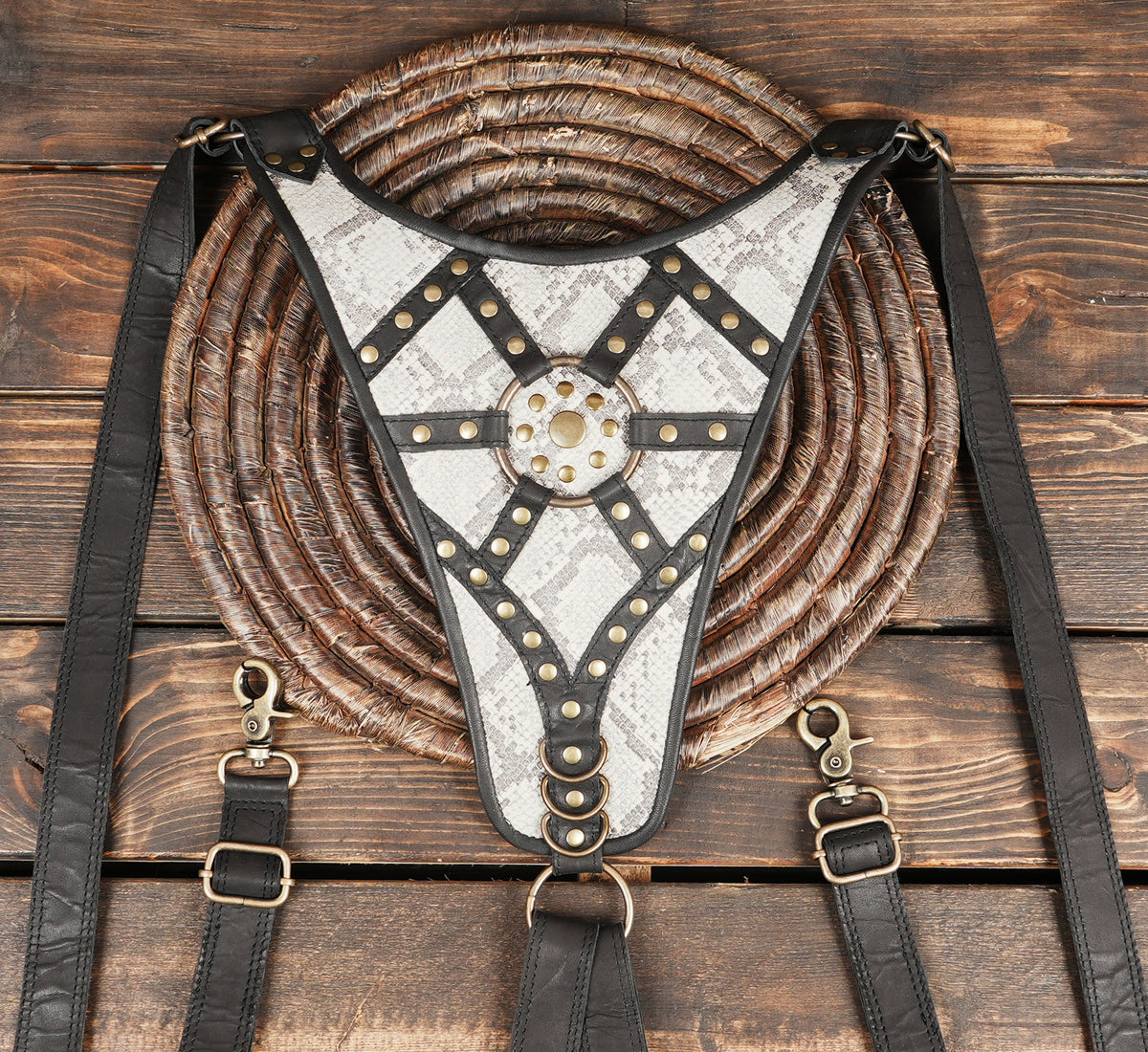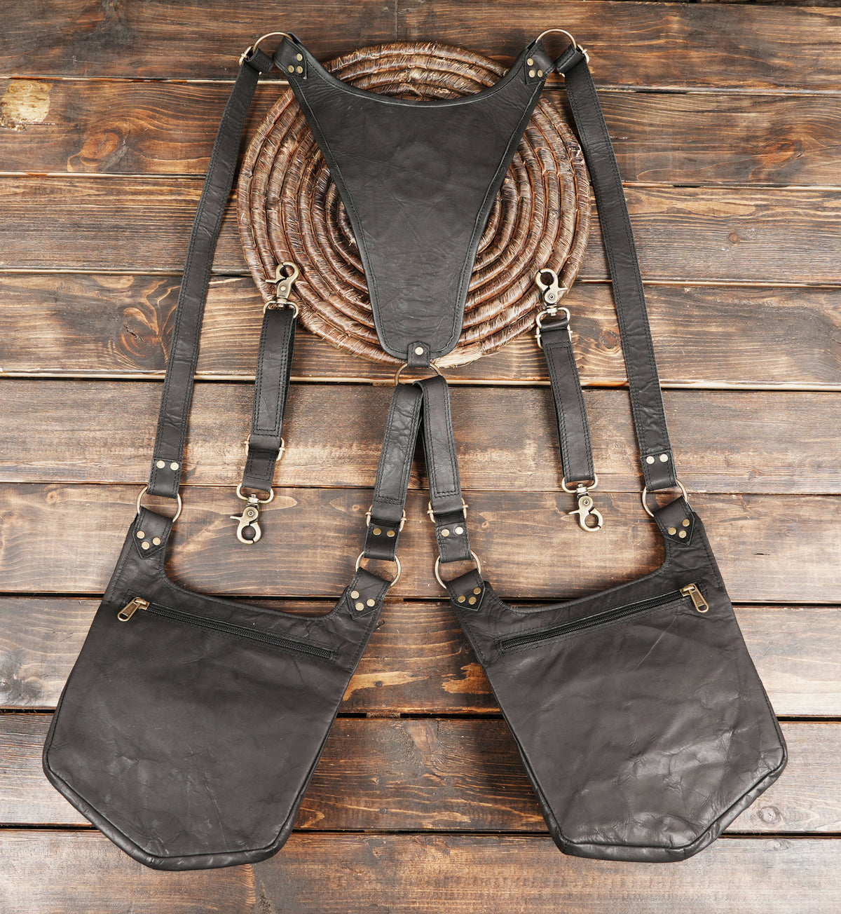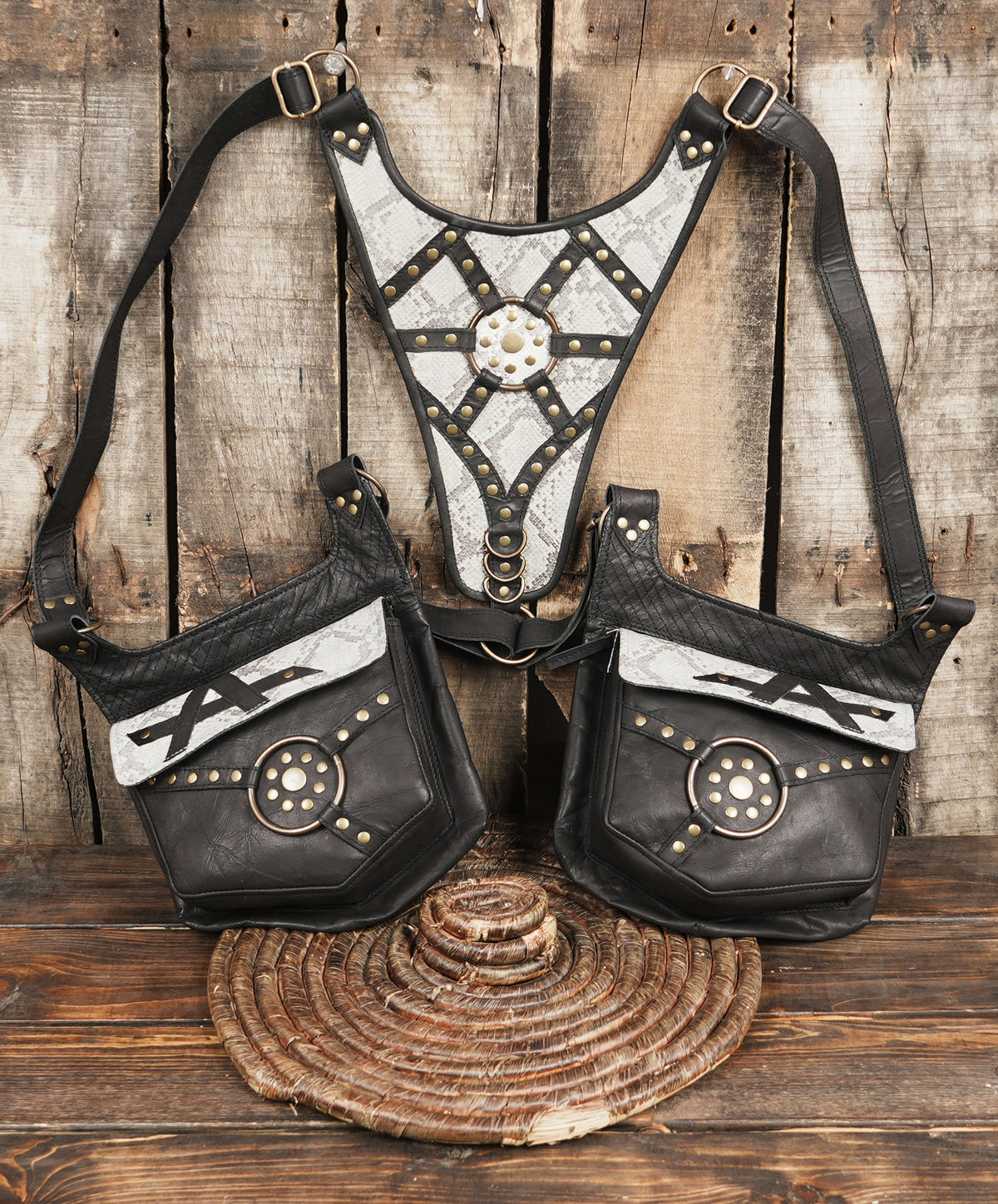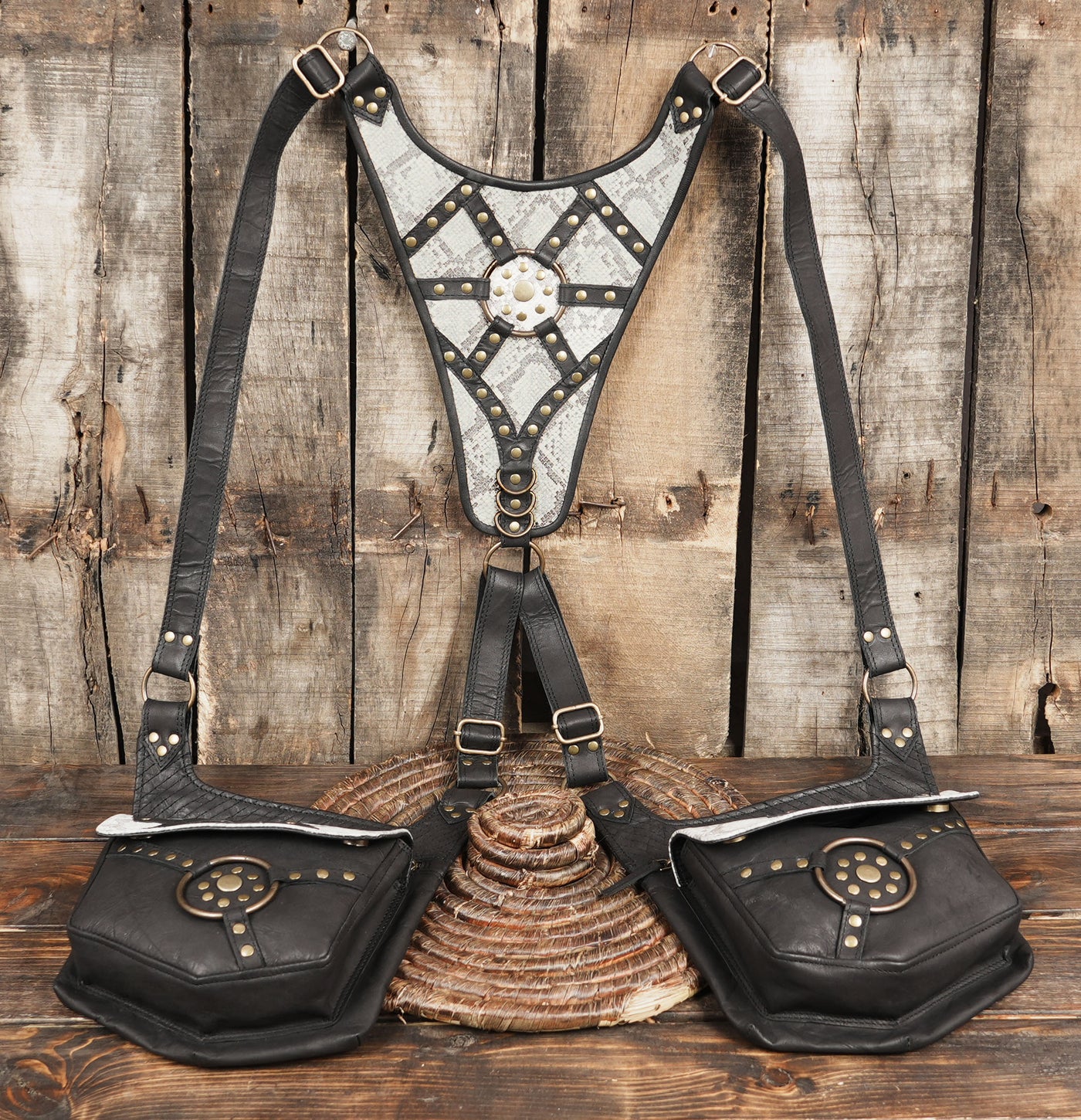 ✔ This handmade leather holster features a striking combination of black leather and snakeskin-pattern panels, giving it a bold steampunk and gothic appeal. It includes two spacious zippered pouches with brass-studded detailing and an adjustable harness for a secure fit. Perfect for festivals, cosplay, travel, or everyday wear, this unisex design blends durability, fashion, and craftsmanship into one versatile statement piece.