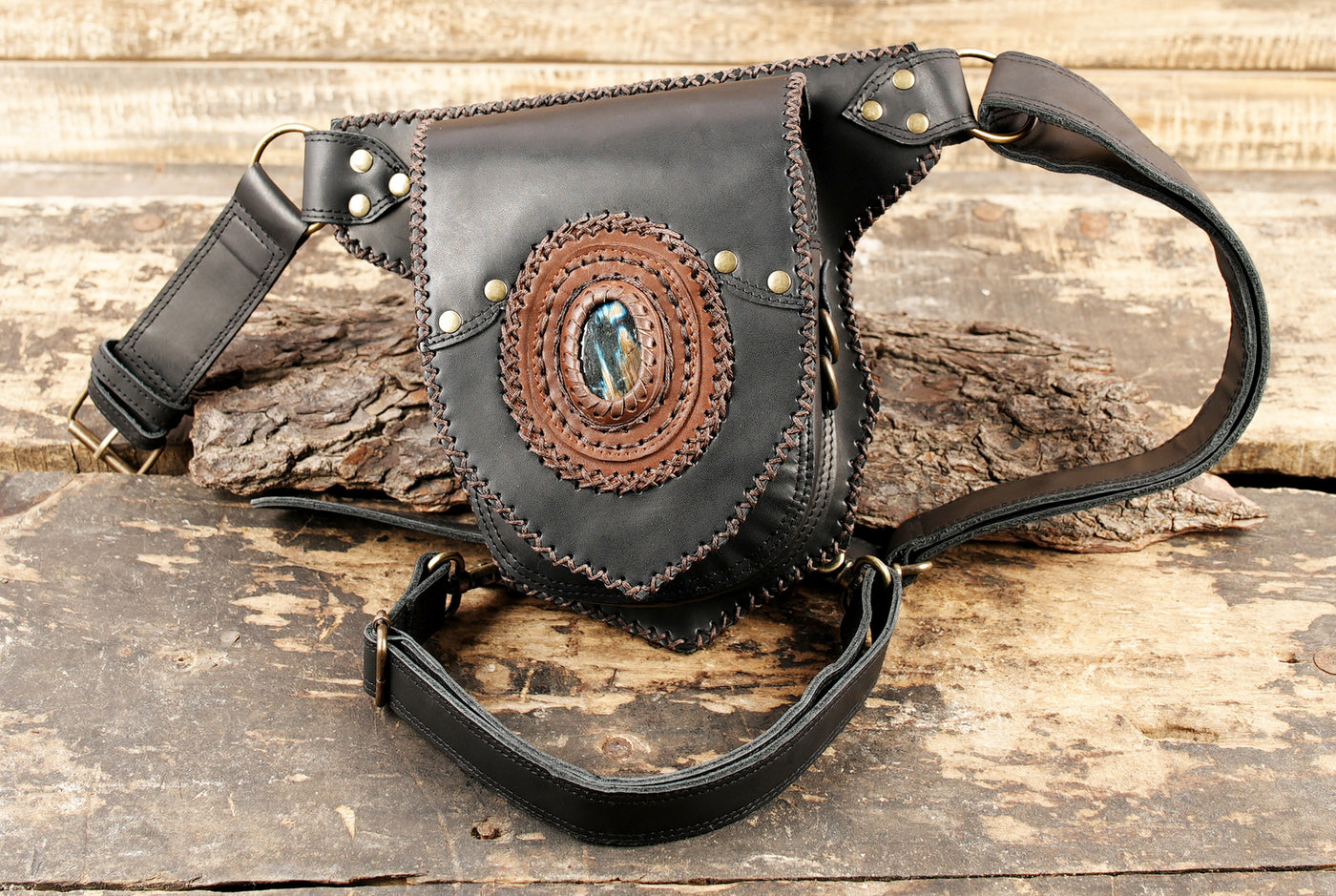 Steampunk Leather Waist Belt with Gemstone – Gothic & Cosplay Bag (LT-AB-WBTS-6032) - Black / S = 28 to 32