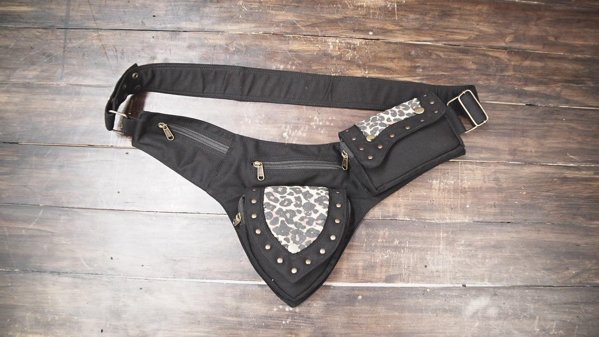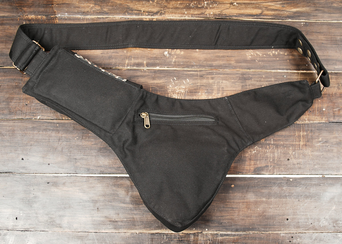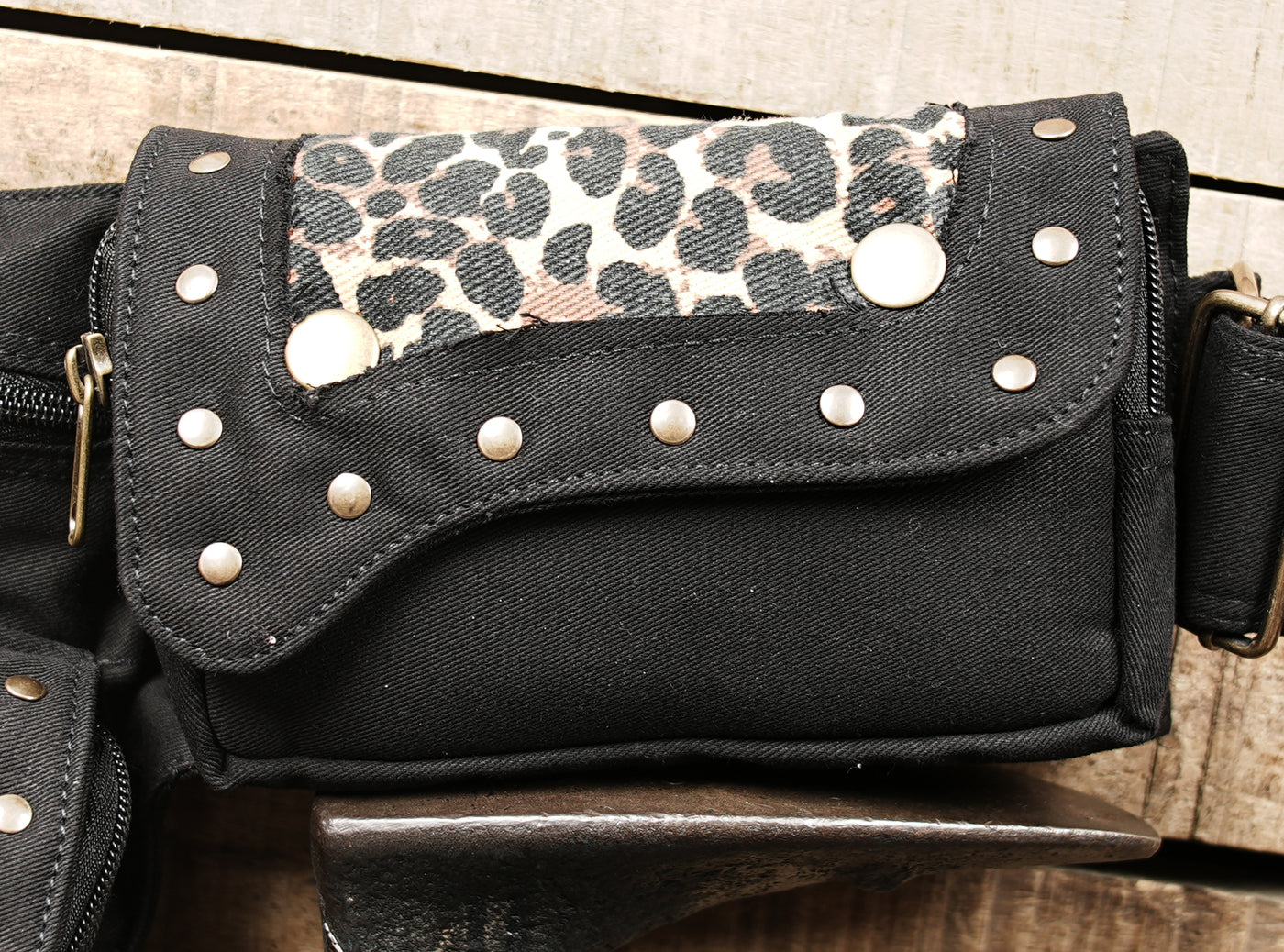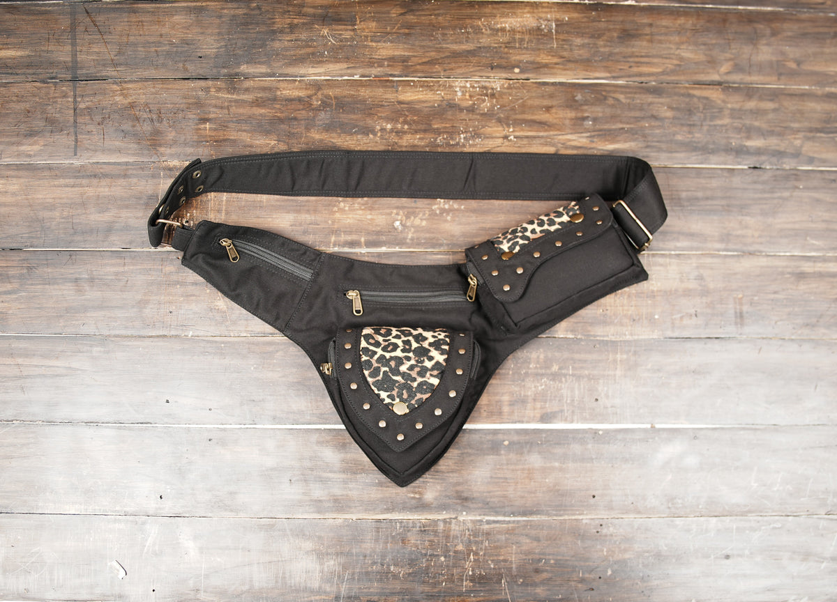Unisex Cotton Waist Bag – Handmade Leopard Accent Belt with Zipper Pockets (CTN-AB-WB-1050) - Black / S = 28 to 32