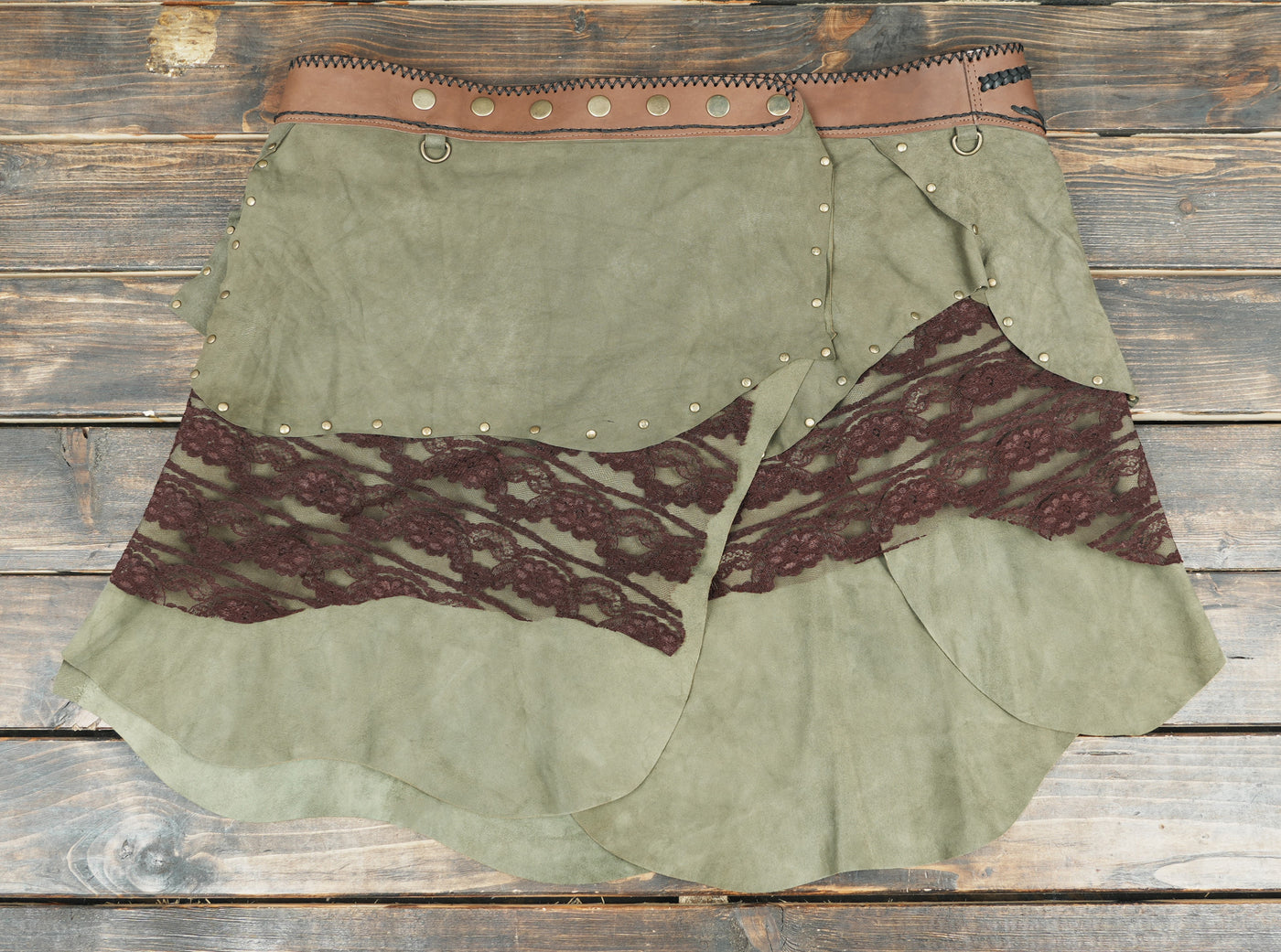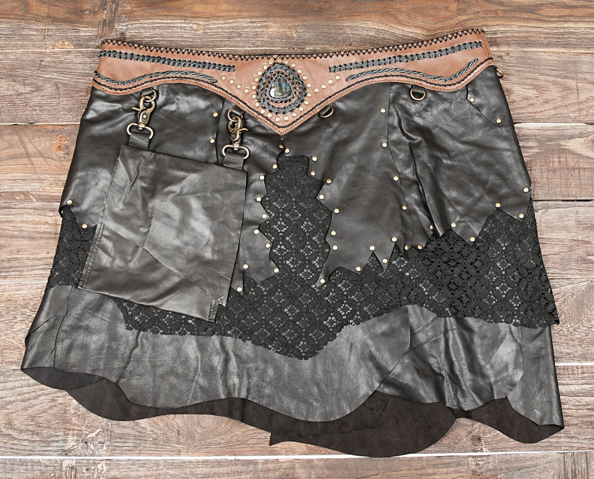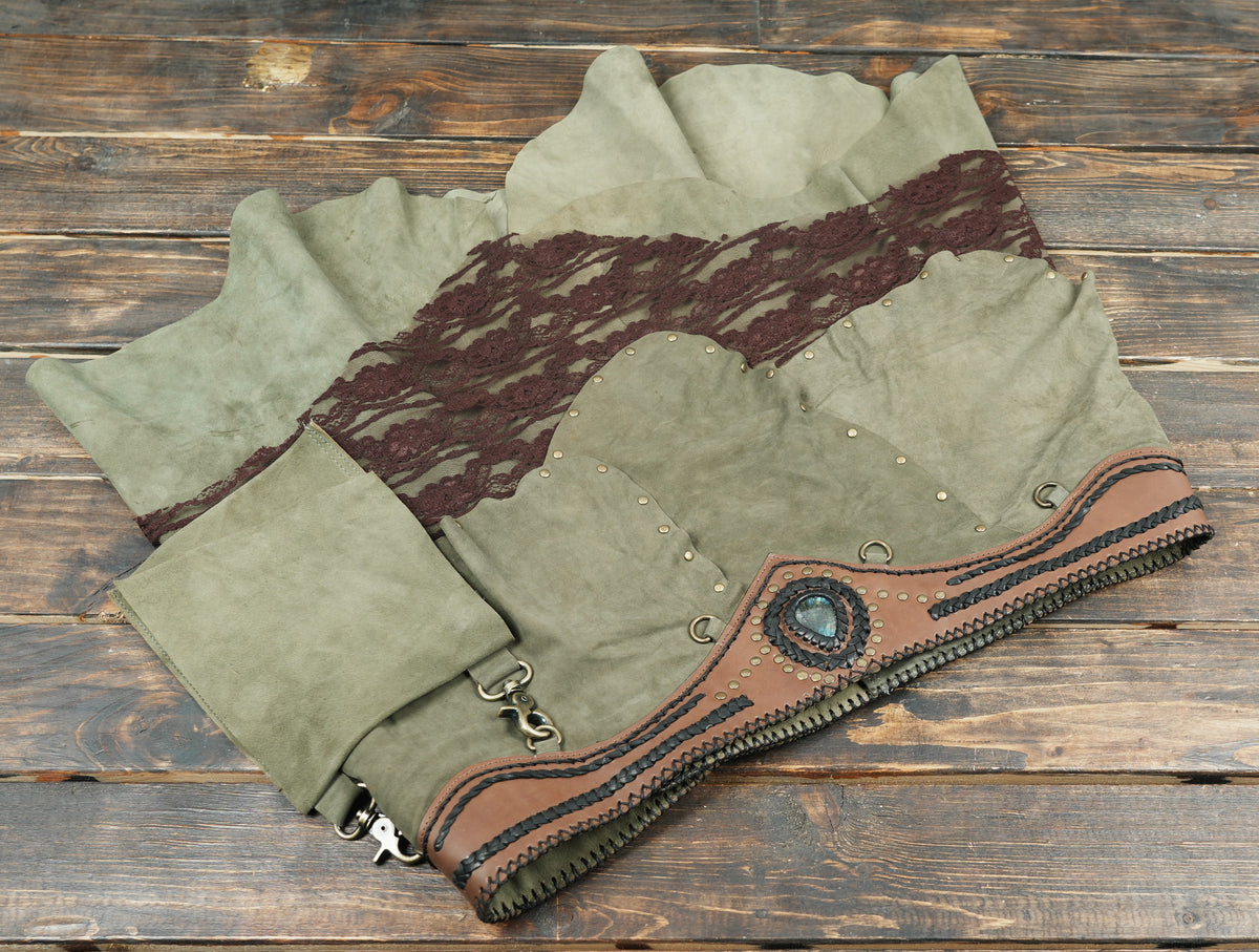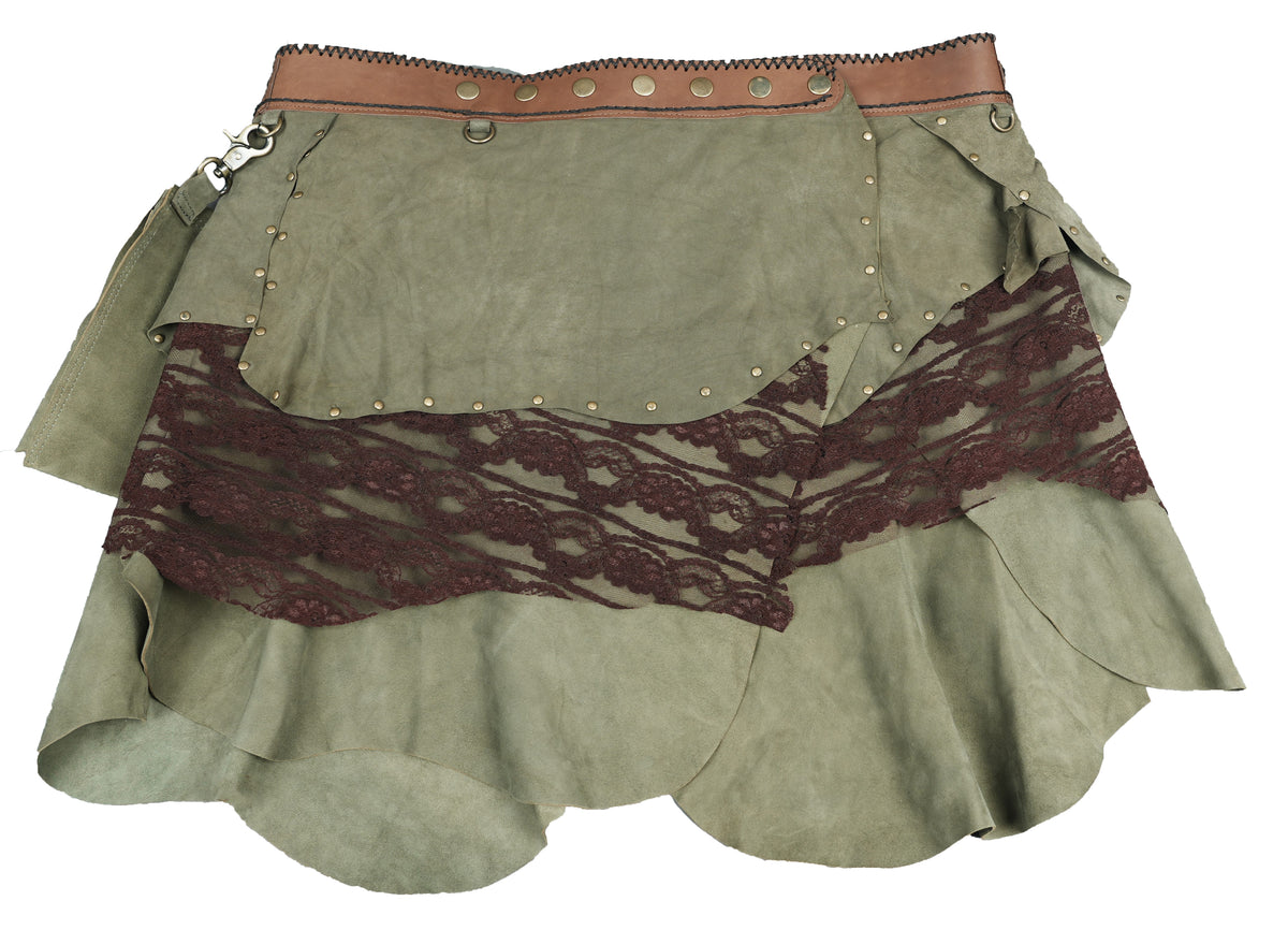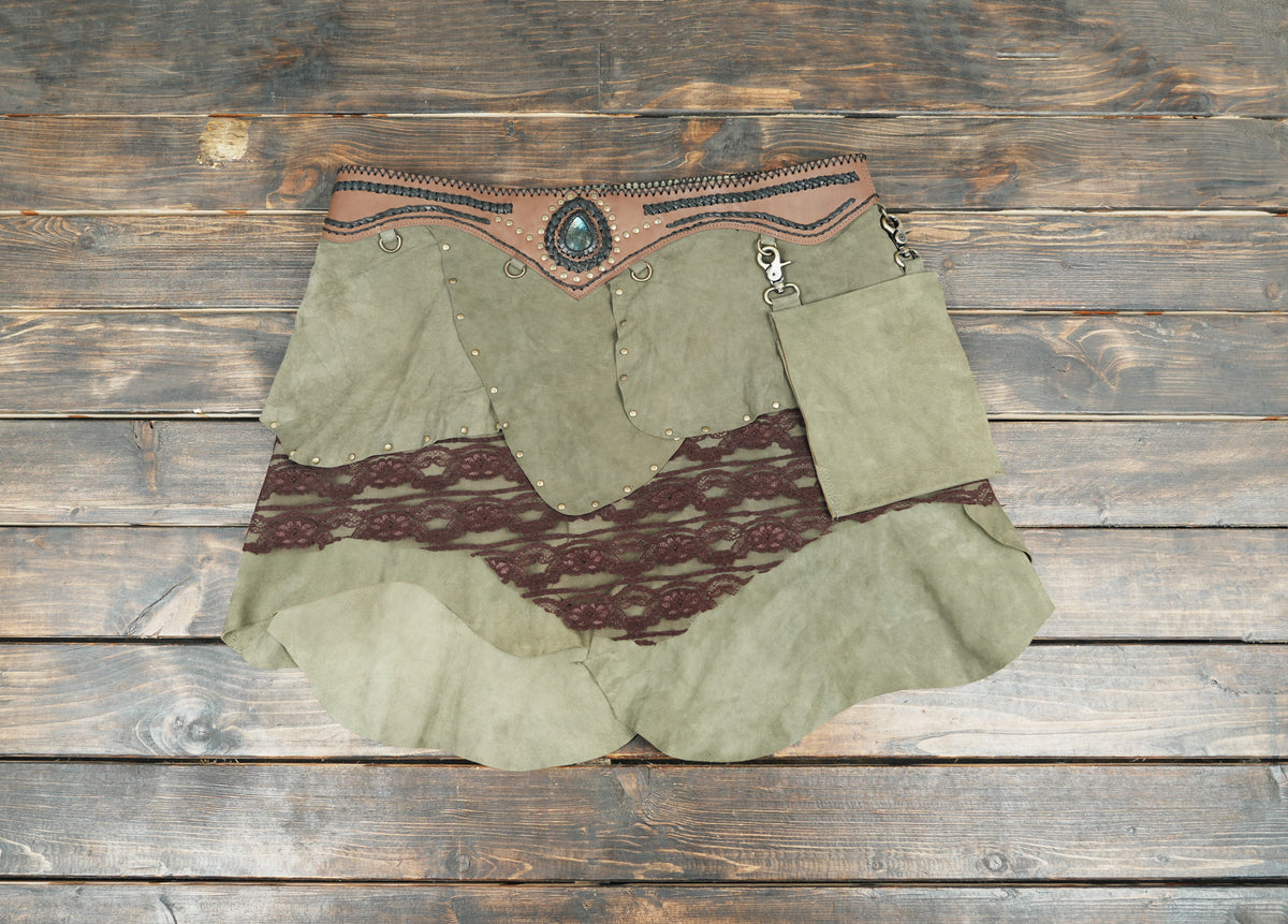 Handcrafted Suede Leather Skirt with Lace and Detachable Pouch || Fantasy Cosplay Leather Skirt with Gemstone Waistband (LT/AB/SKT/6011) - Green / S = 28 to 32