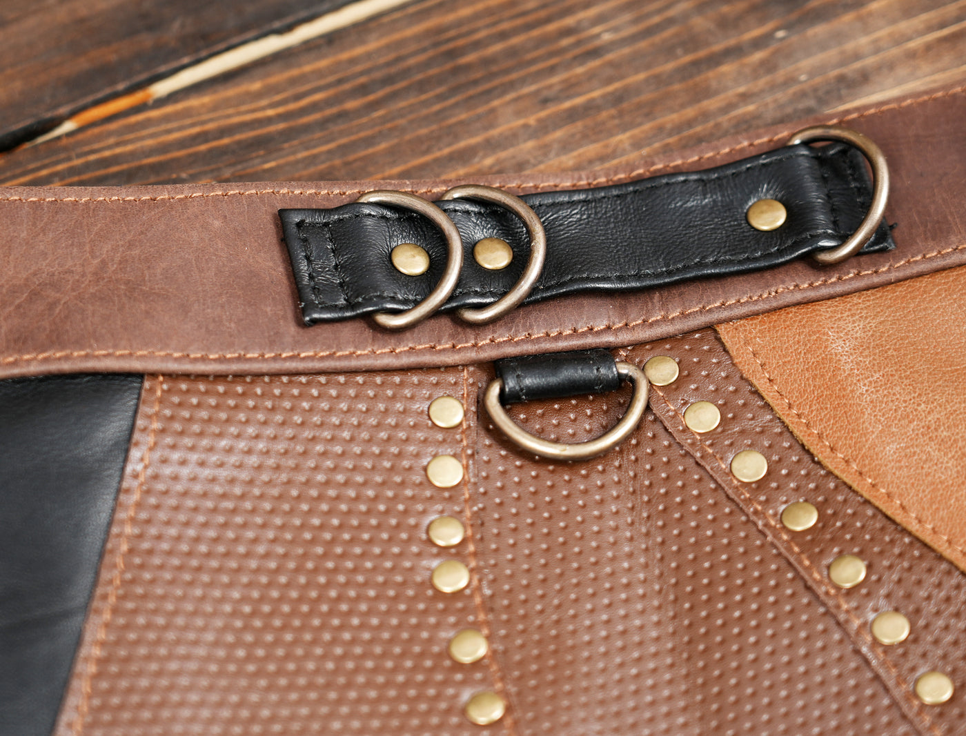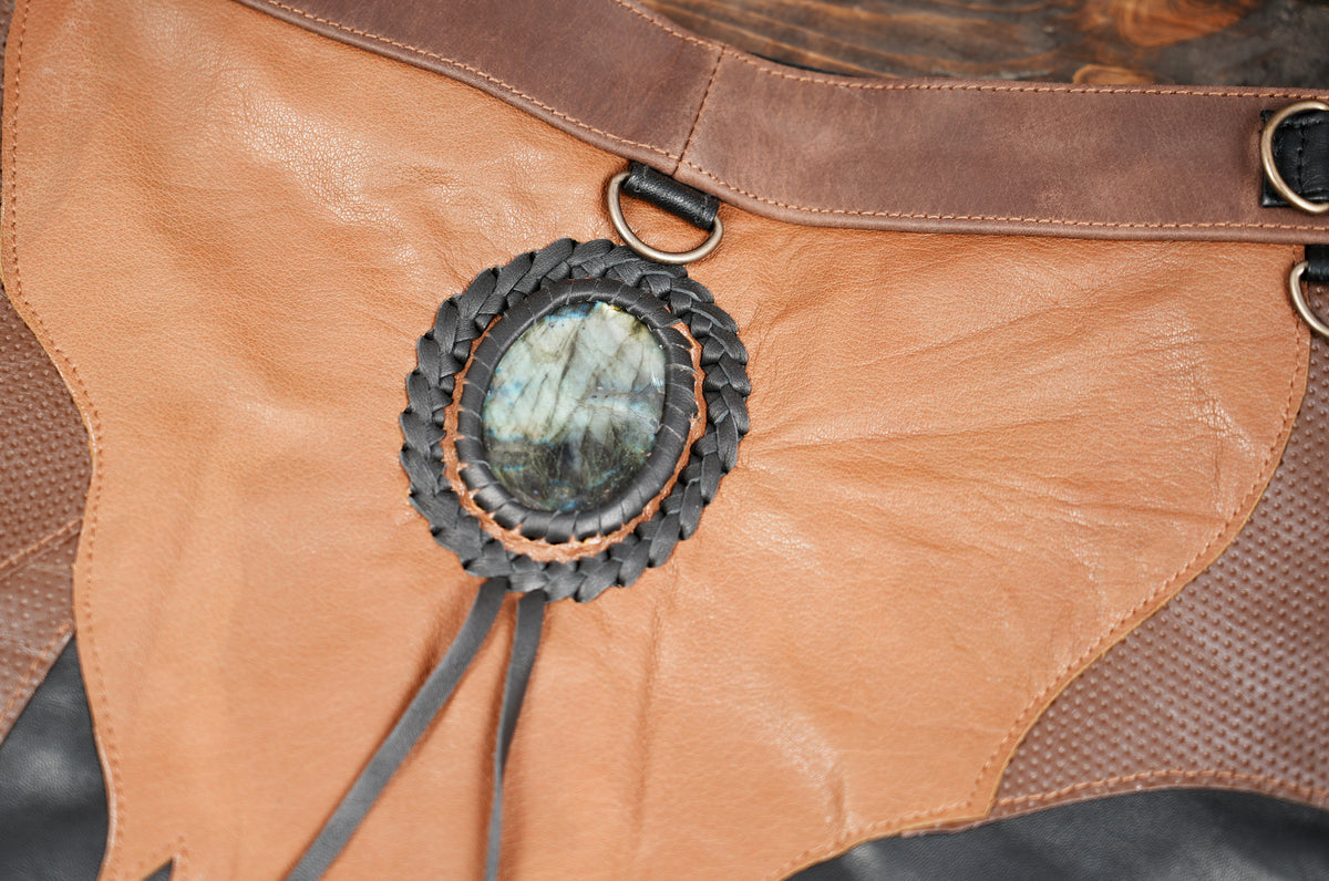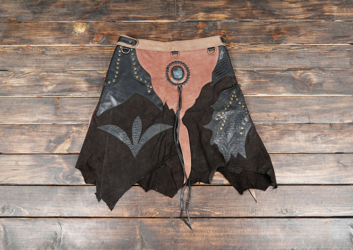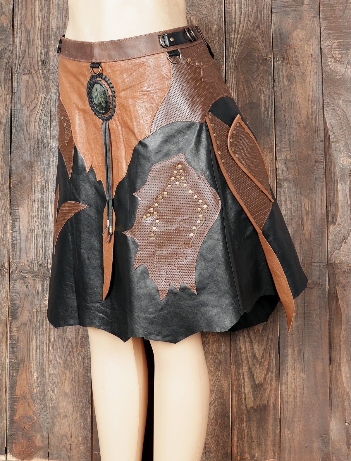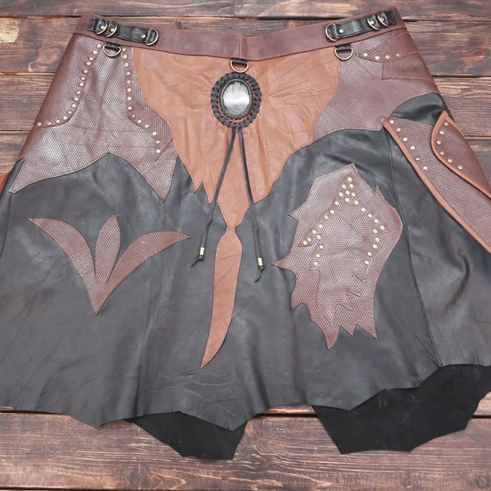 Handmade Boho Leather Skirt Belt with Gemstone | Tribal Patchwork Leather Skirt for Women | Gothic Steampunk Leather Skirt (LT/AB/SKT/6001) - Black / S = 28 to 32 / Antic Brass