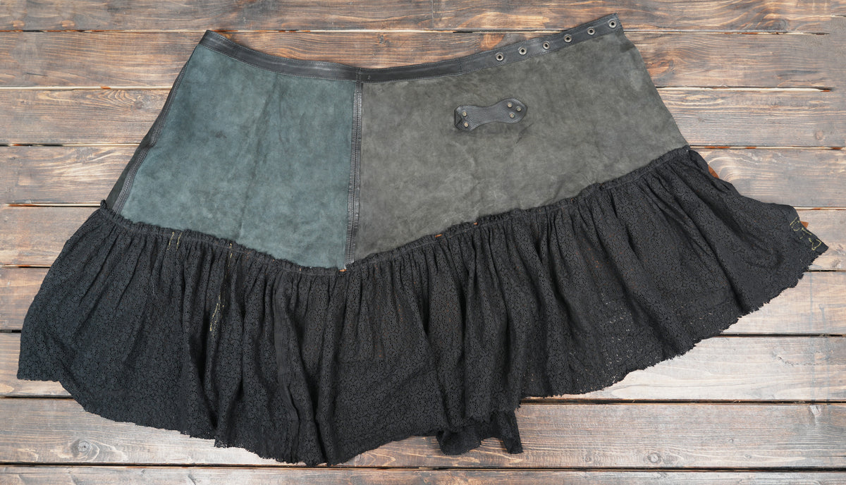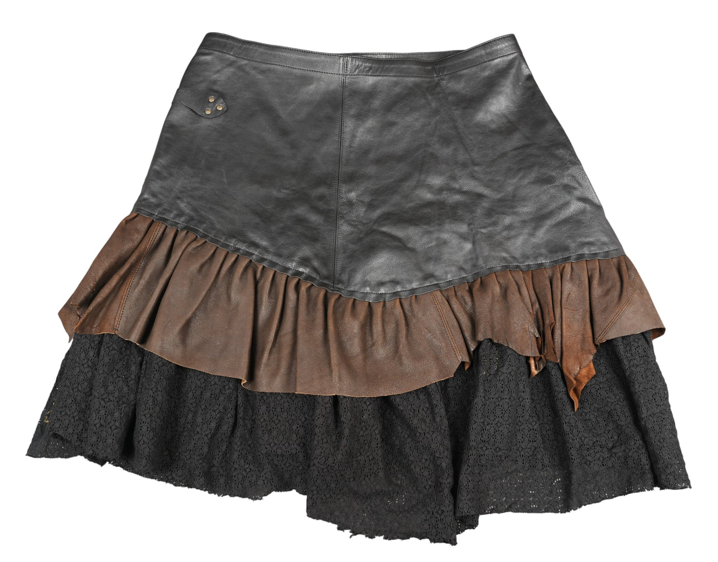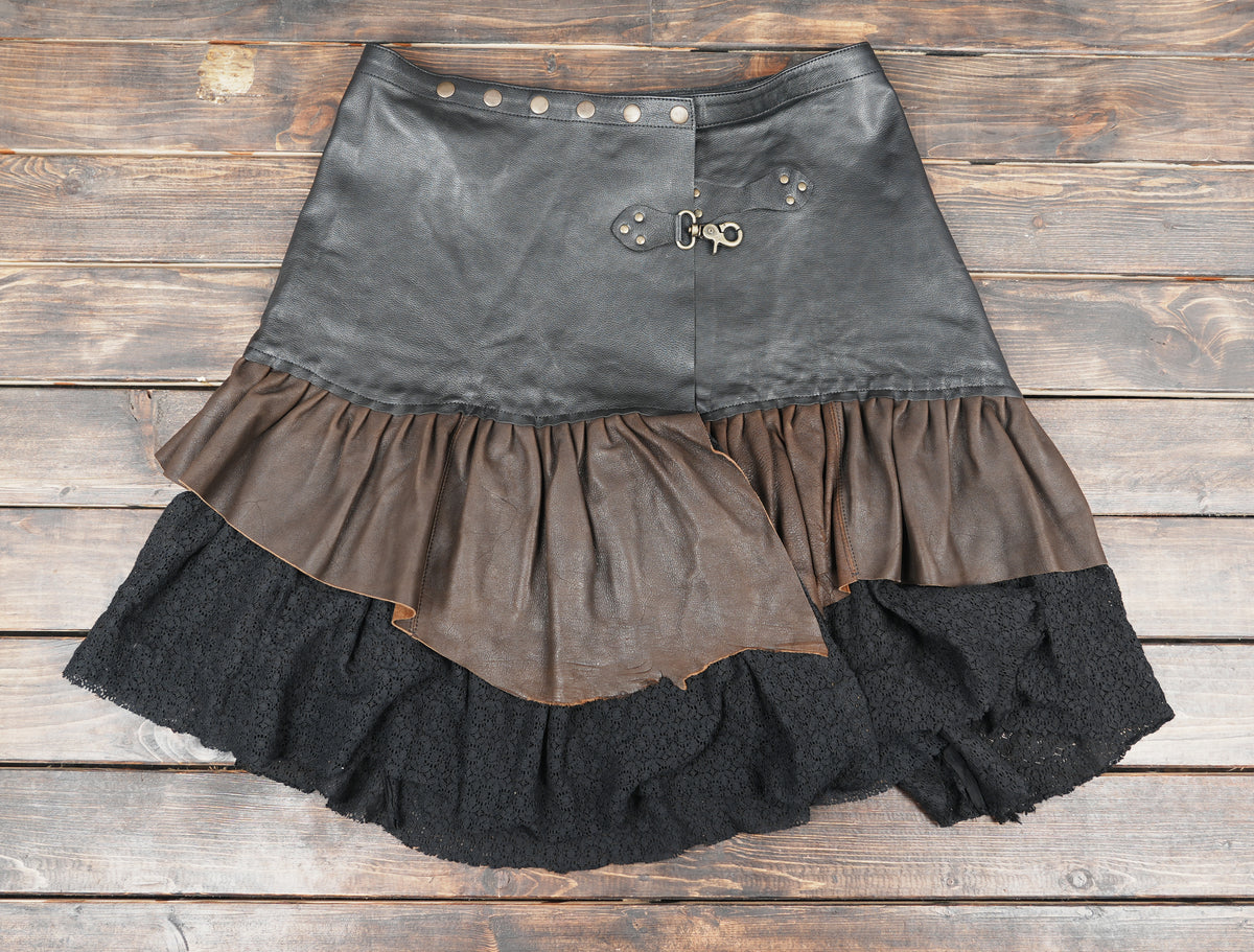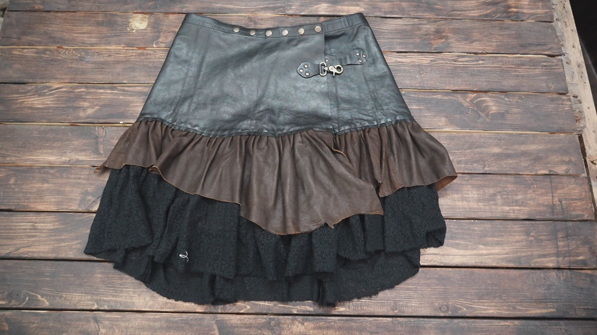 This leather skirt features a stylish layered design with a black leather top, soft brown ruffle panels, and a black lace bottom for a unique mixed-texture look. It includes metal studs along the waist and a decorative buckle detail that adds a bold, steampunk touch. The strong stitching and high-quality materials make it durable, while the flowing layers give it a fashionable and comfortable fit, perfect for festivals, cosplay, or creative outfits.