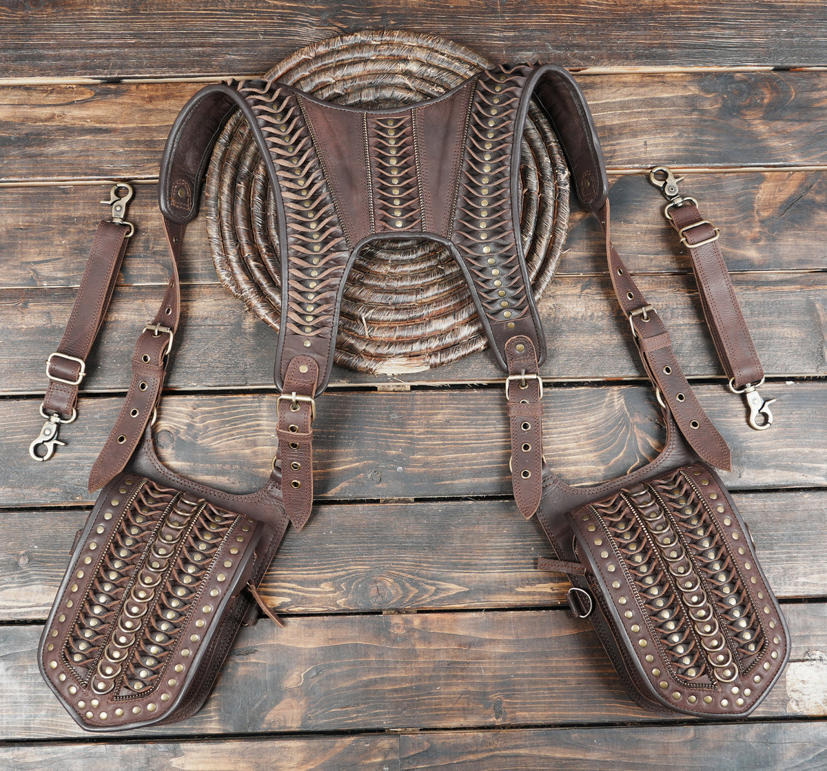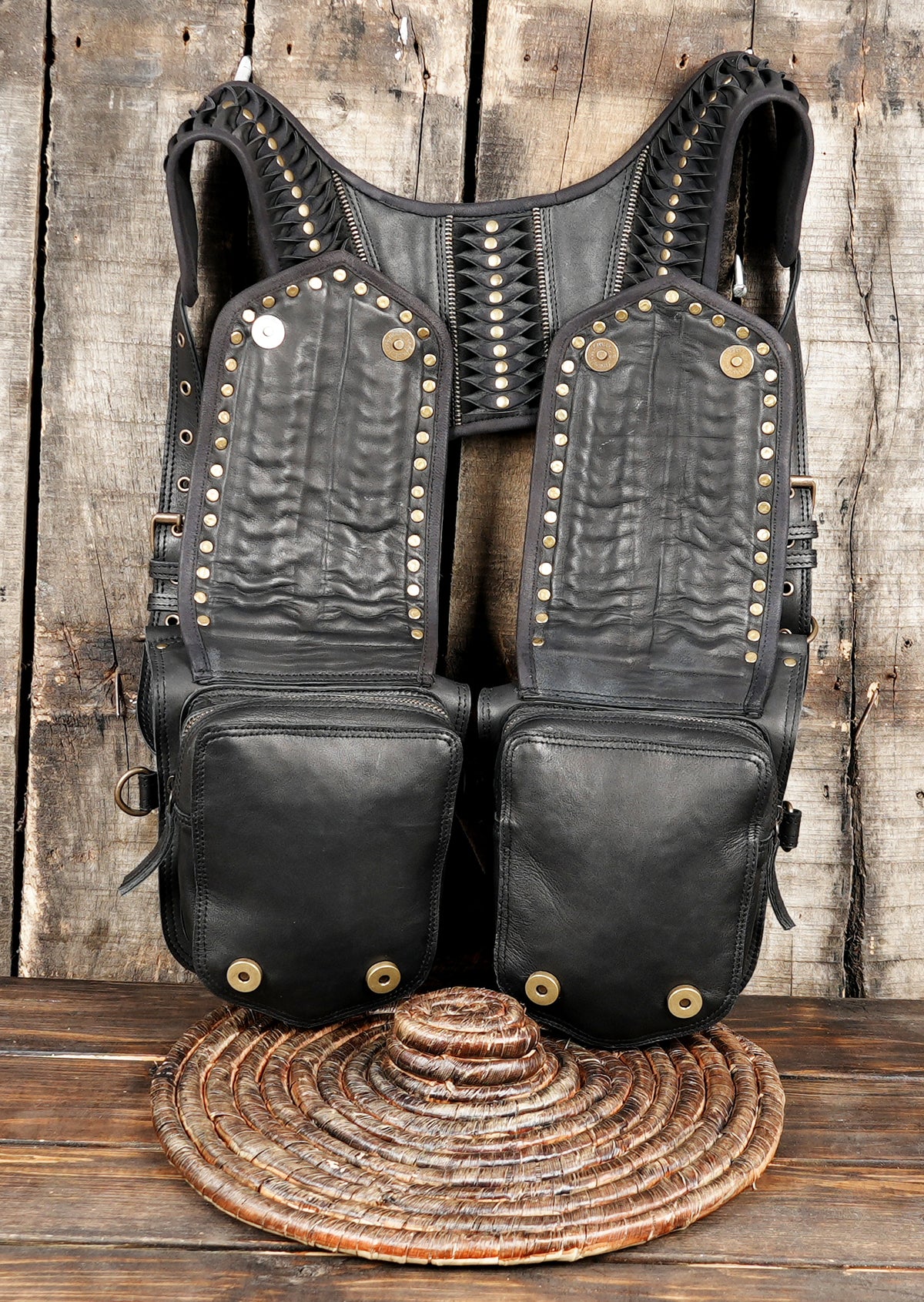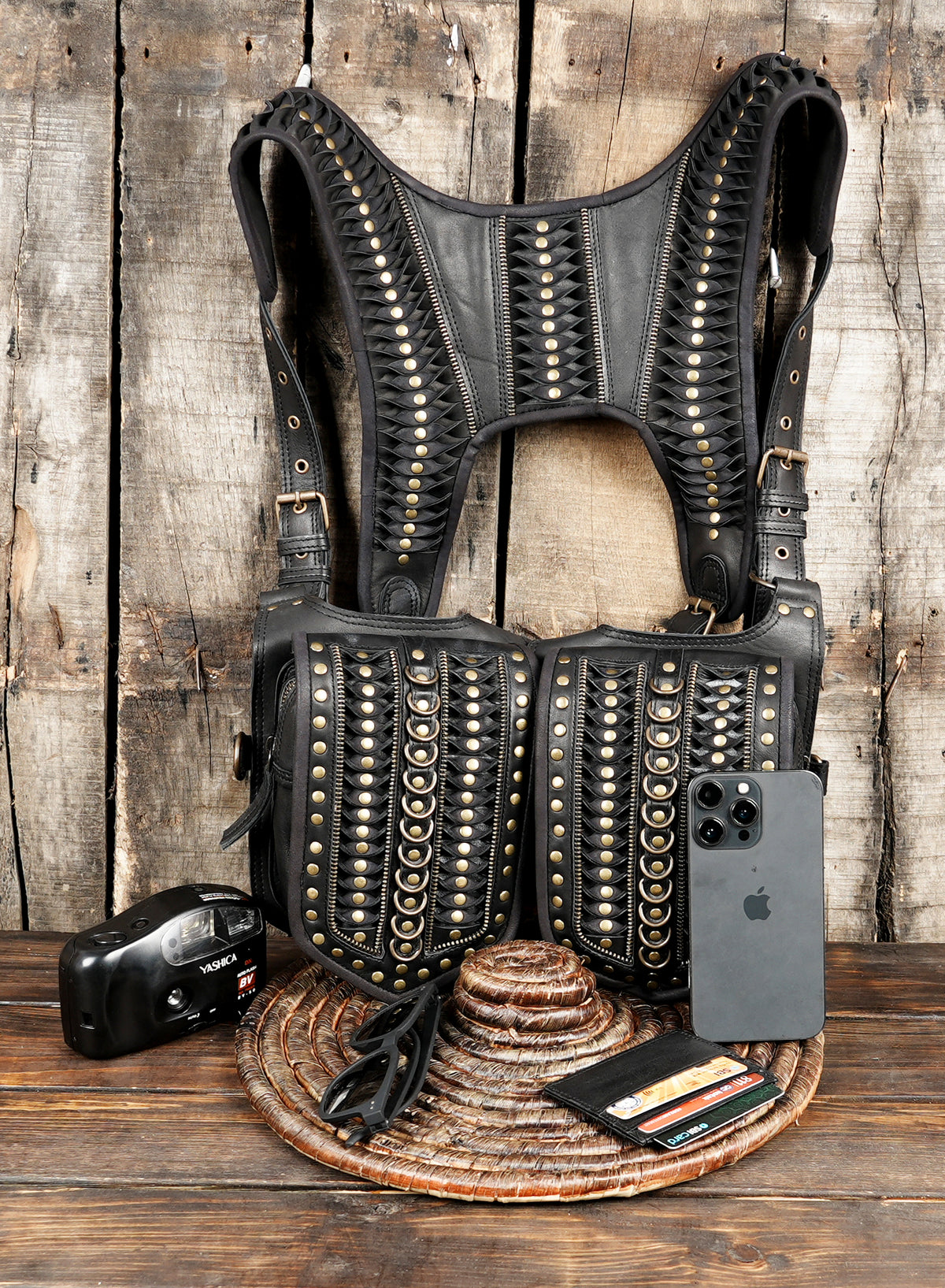 Premium Gothic Leather Chest Holster || Black Studded Leather Holster Bag (LT-AB-HLS-6105) - Black / Free Sized / Antic Brass