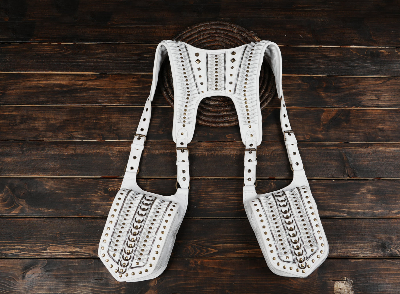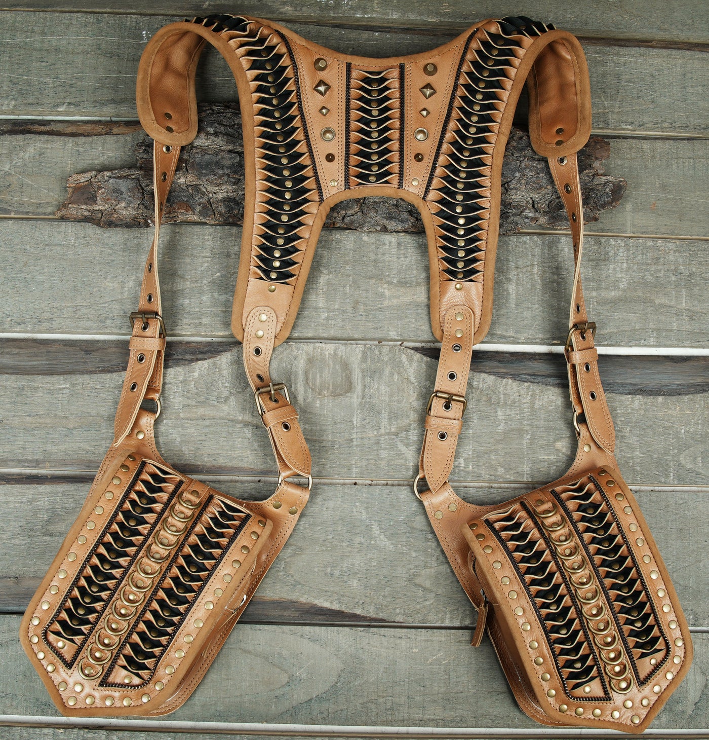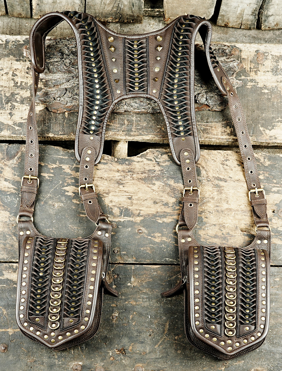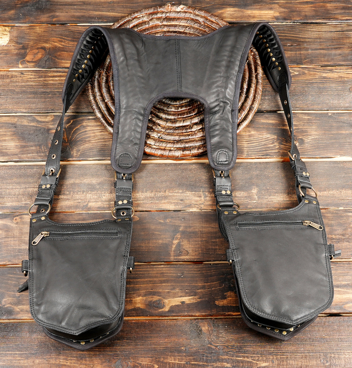 Premium Gothic Leather Chest Holster || Black Studded Leather Holster Bag (LT-AB-HLS-6105) - Black / Free Sized / Antic Brass