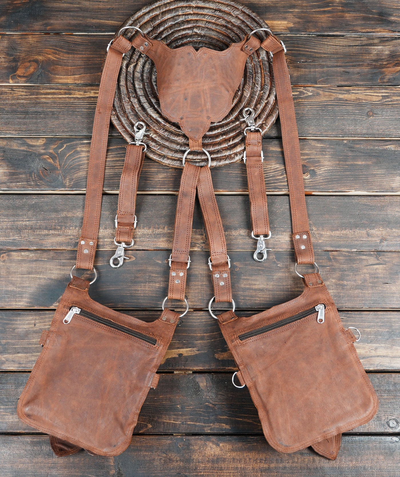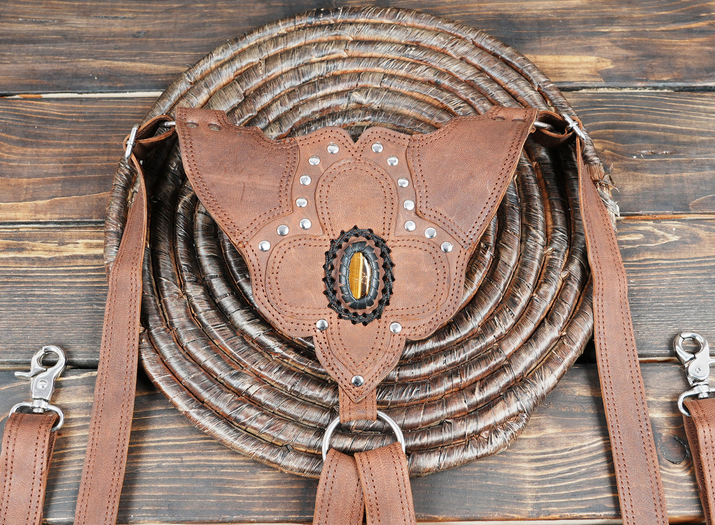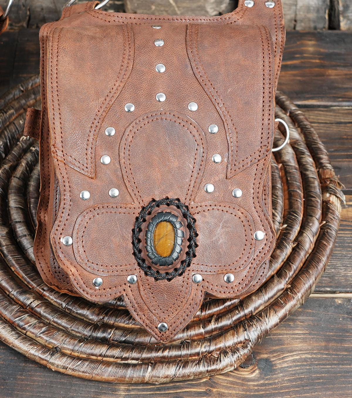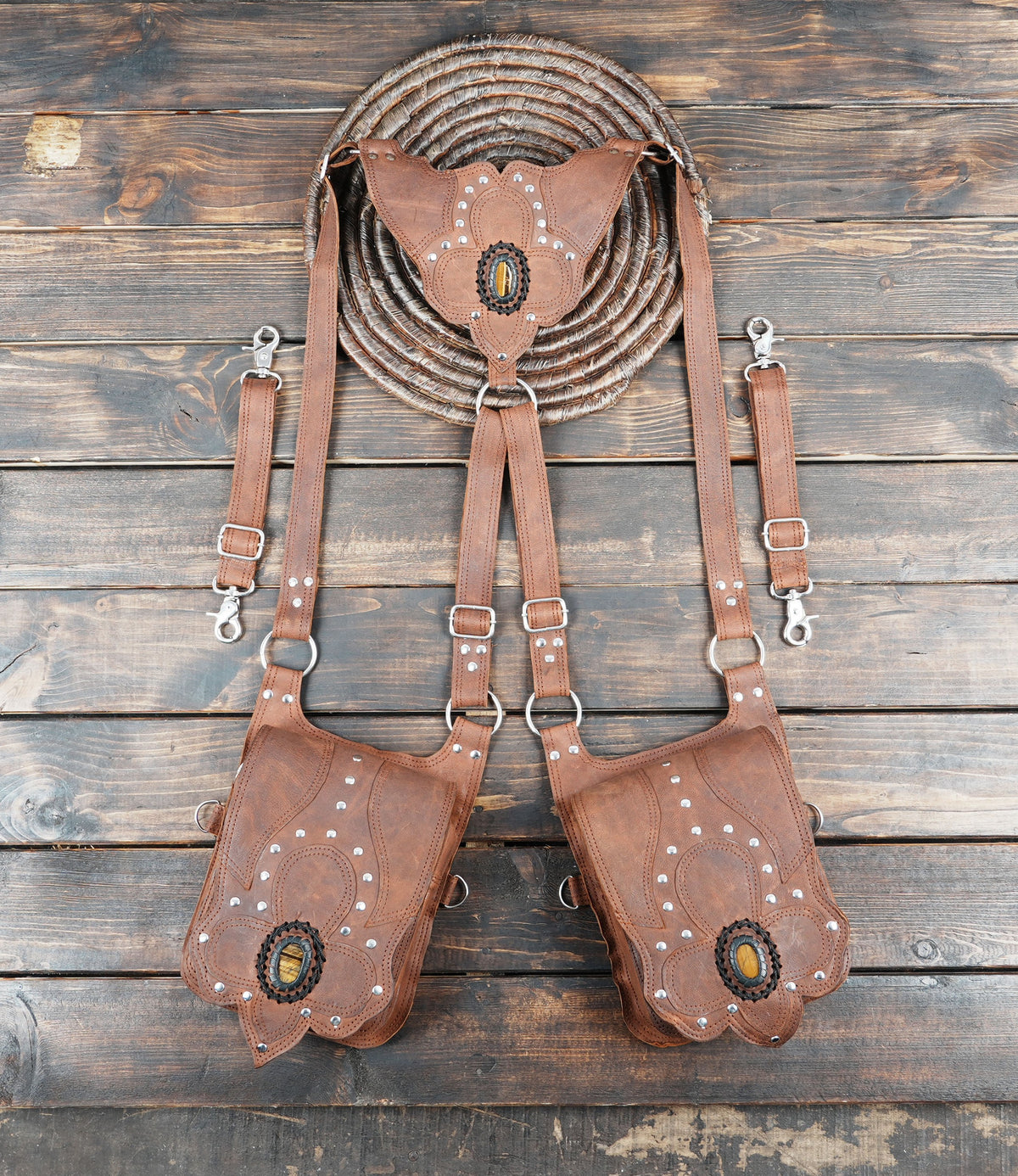 Handcrafted Brown Leather Dual Holster with Tiger Eye Stones || Bohemain Leather Adjustable Holster (LT-NS-HLS-6026) - Brown / Free Sized / Antic Brass