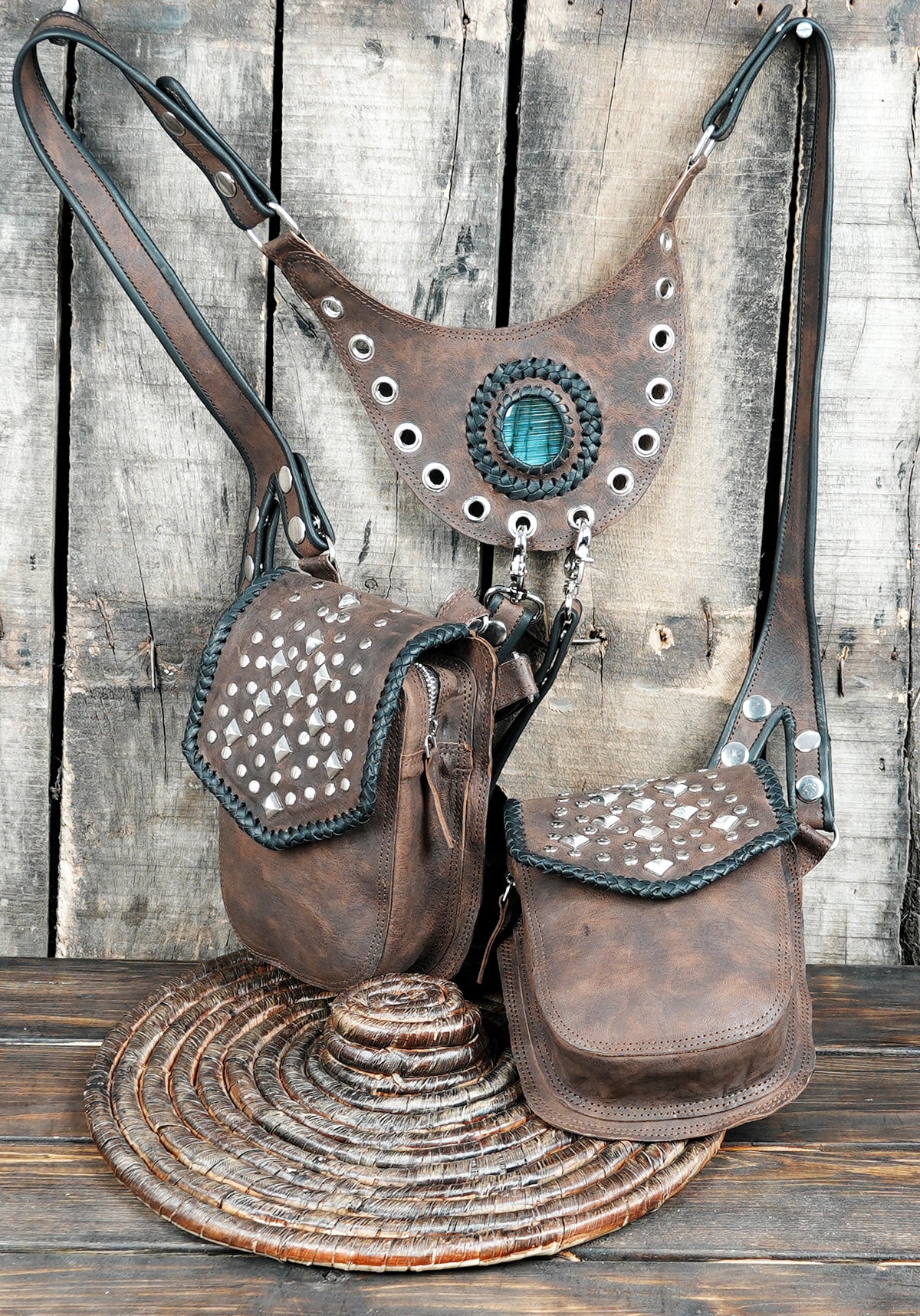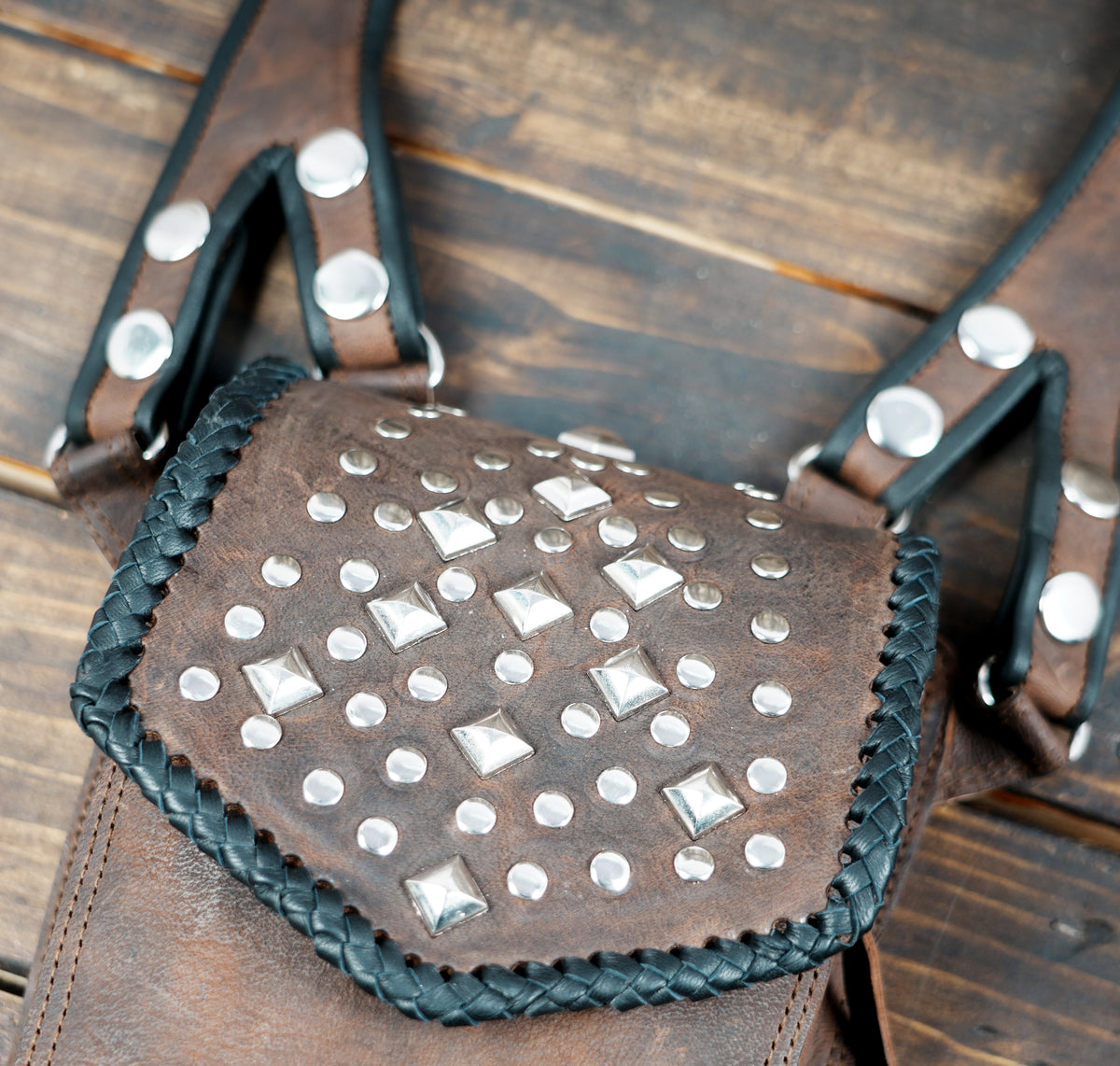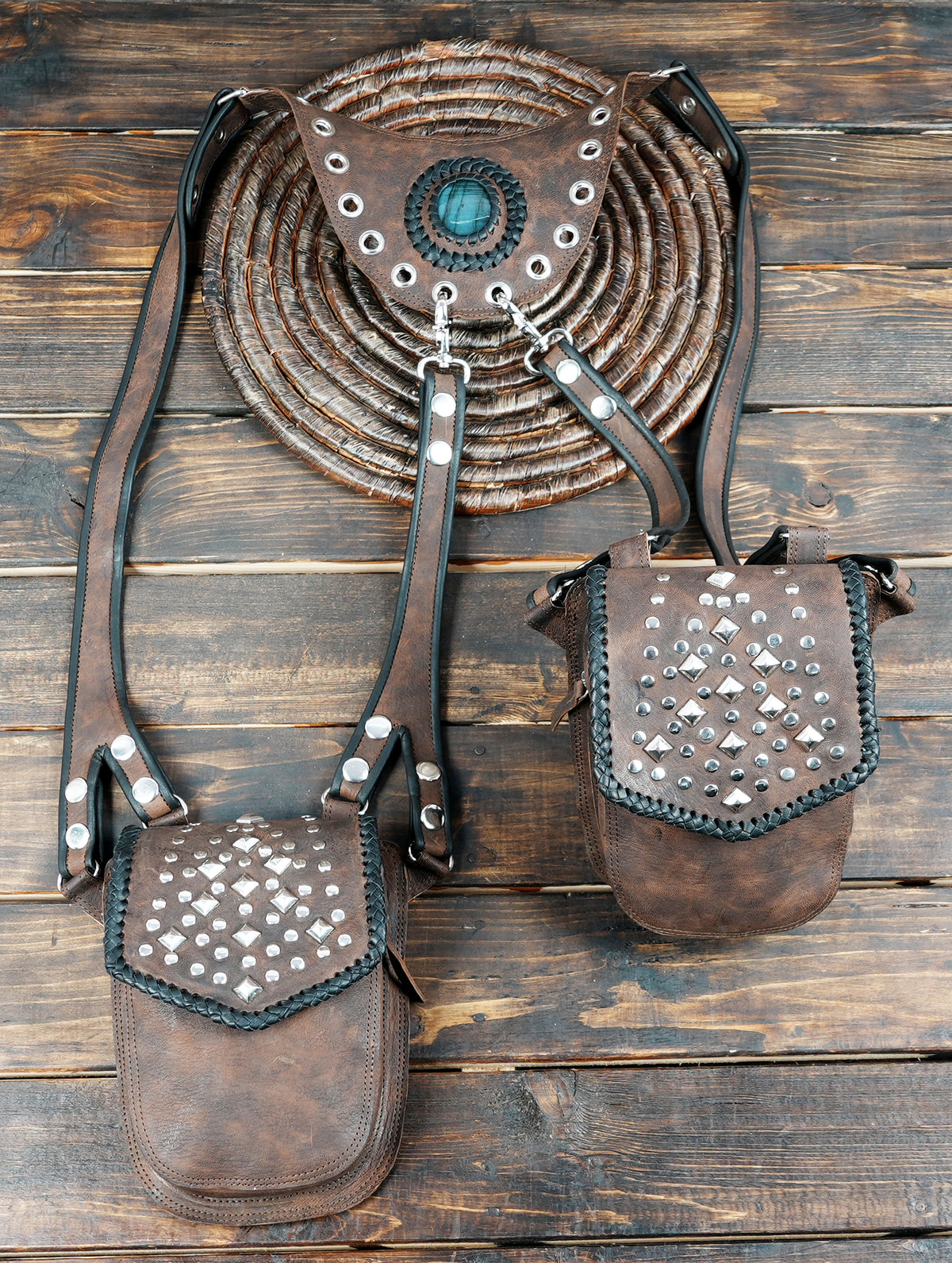 Premium Black Leather Utility Holster with Silver Studs || Durable Leather Harness Holster With Labradorite Gemstone (LT-NS-HLS-6014) - Dark Brown / Free Sized / Antic Brass