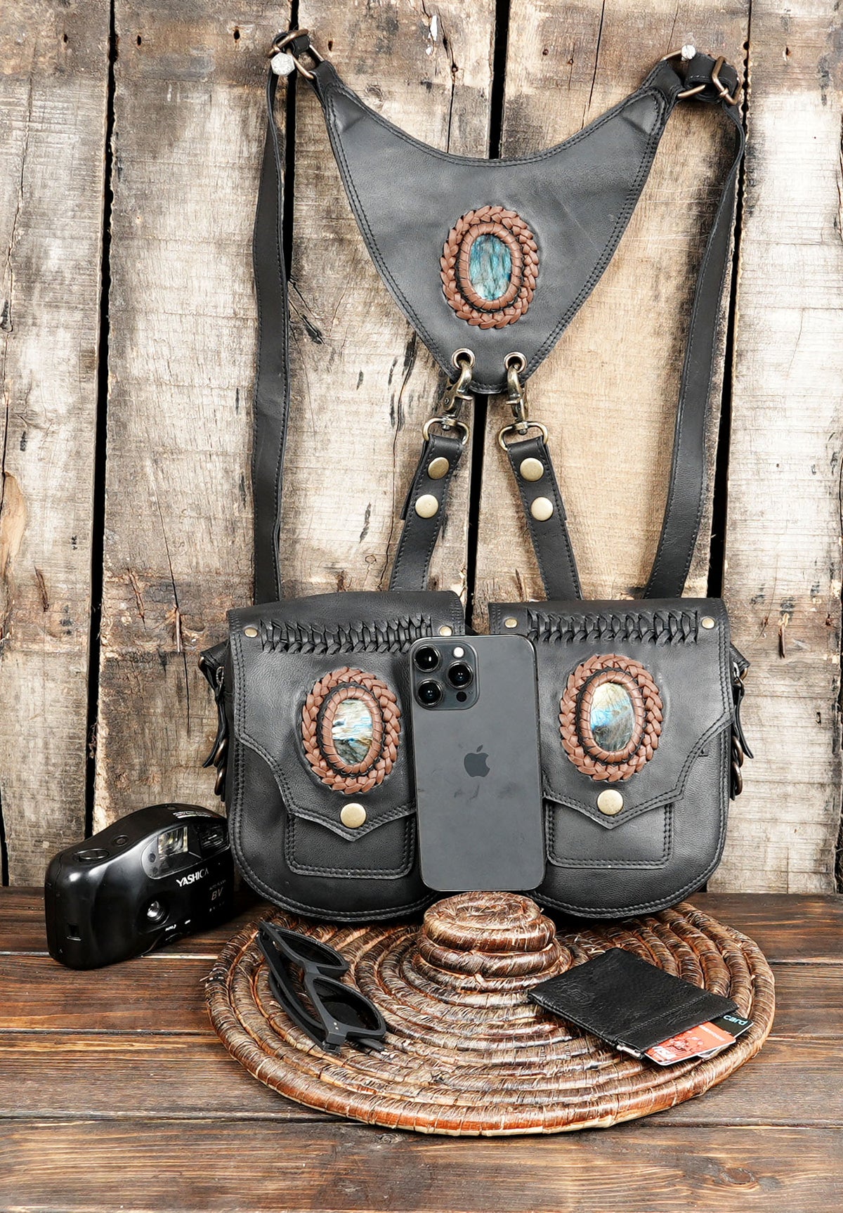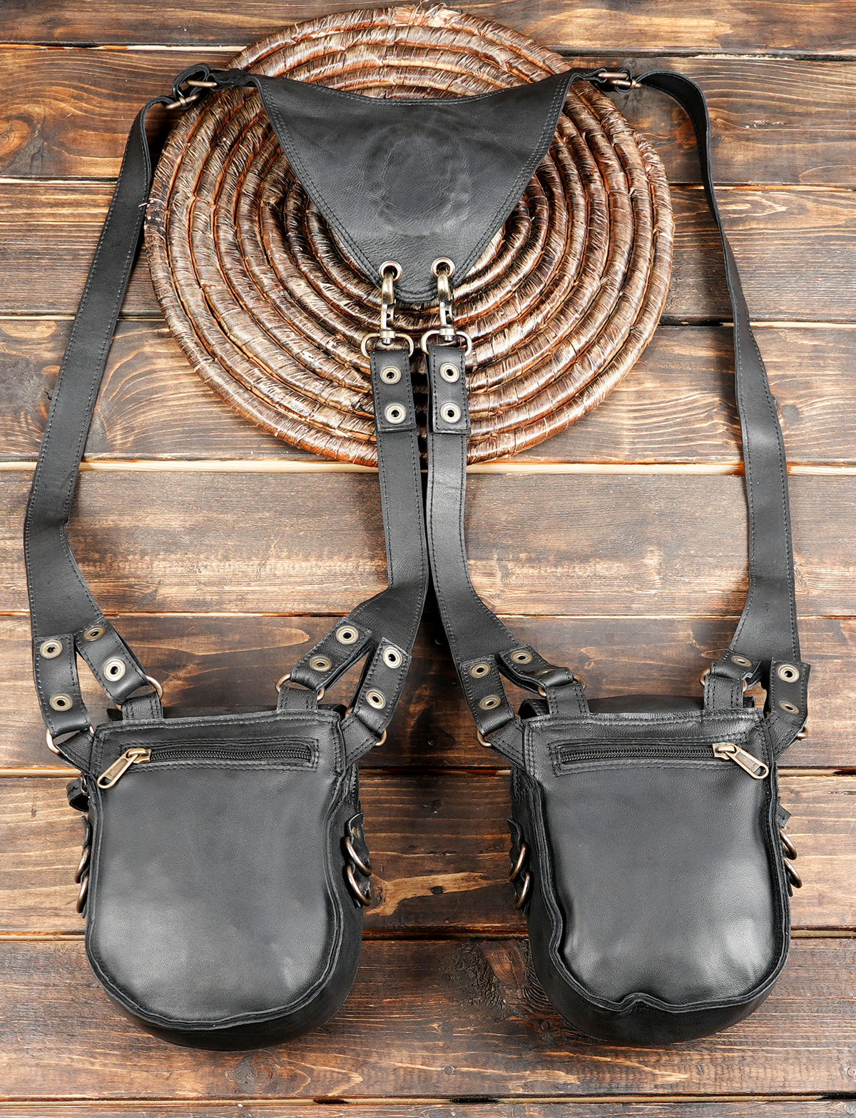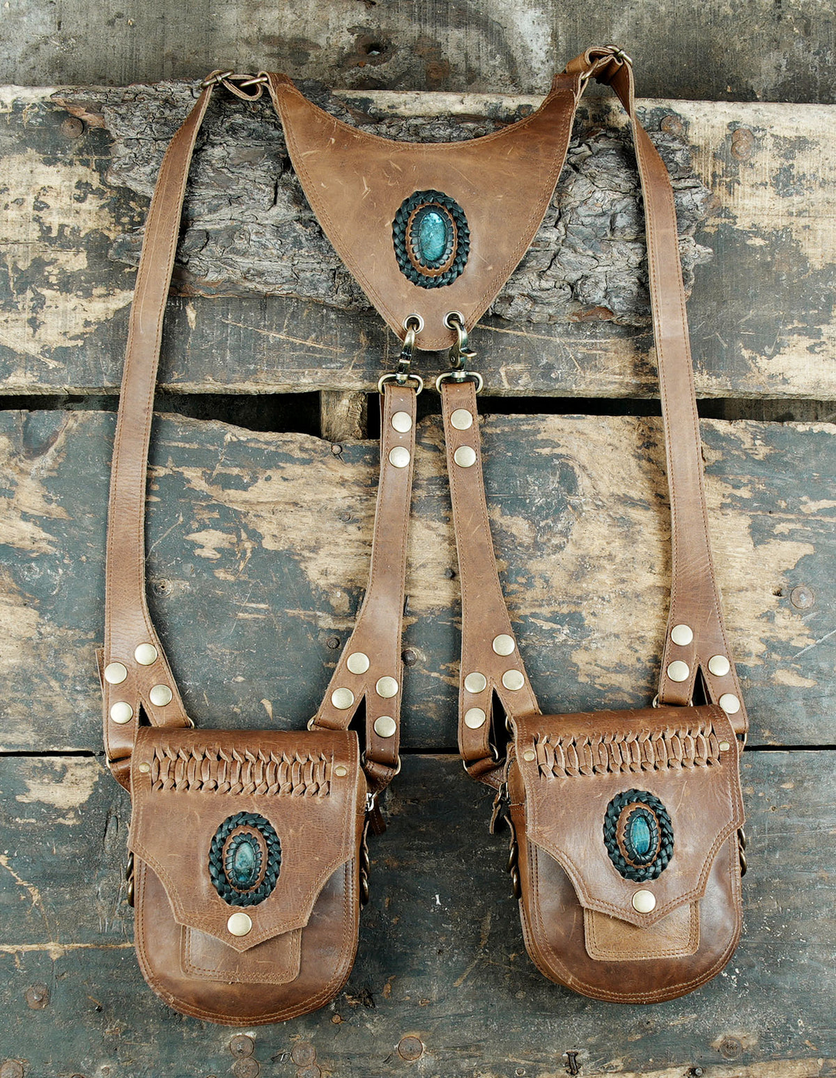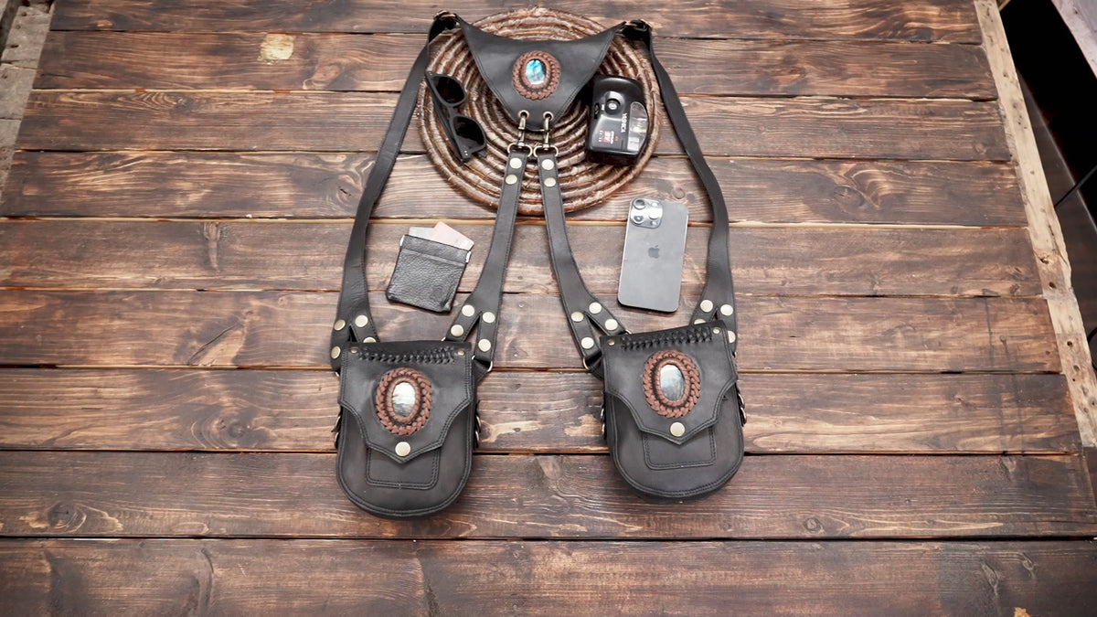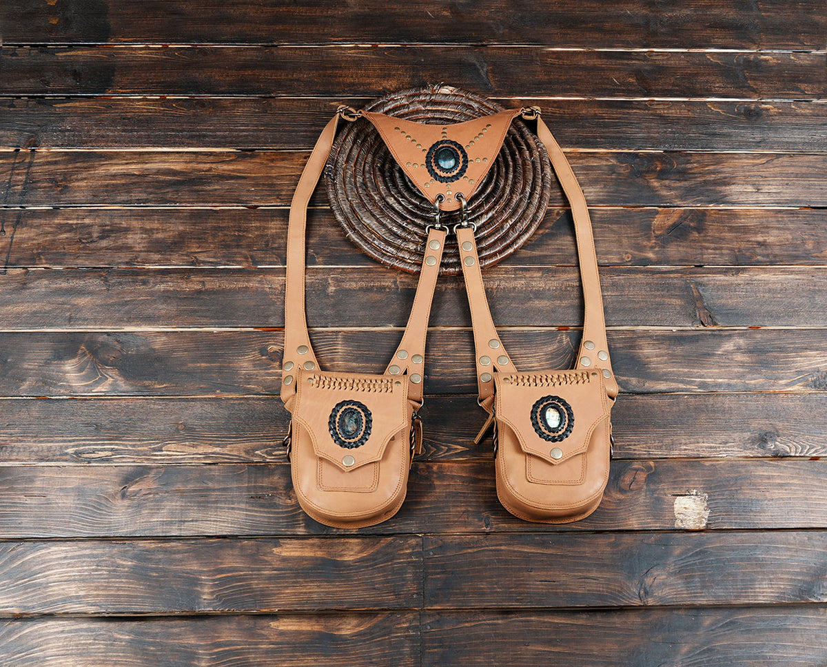 Festival Leather Holster Harness Bag with Gemstone Accents || Double Pouch Black Leather Shoulder Rig with Brass Hardware(LT-AB-HLS-6128) - Black / Free Size / Antic Brass
