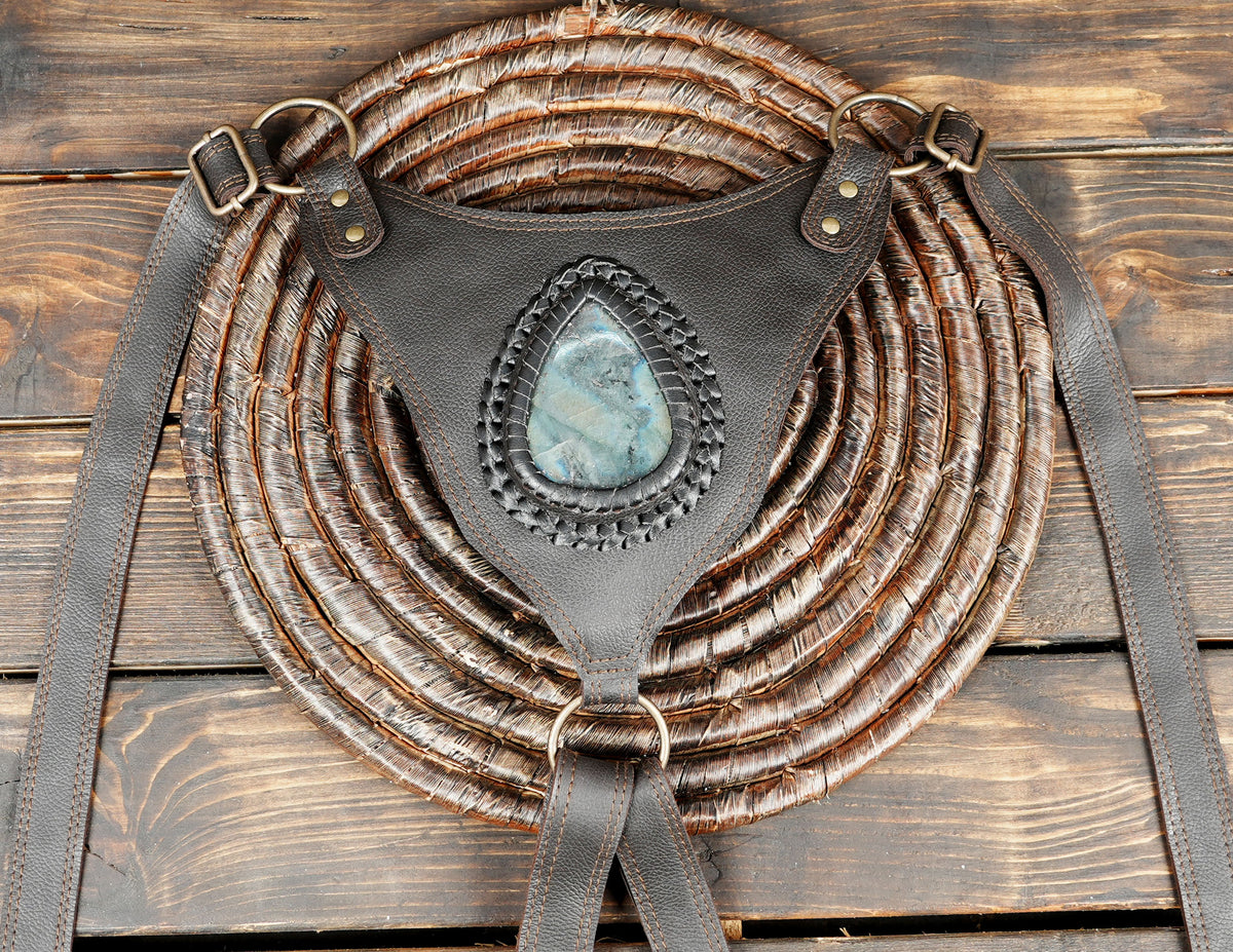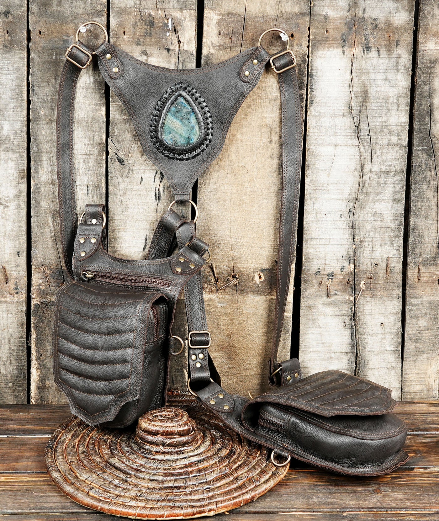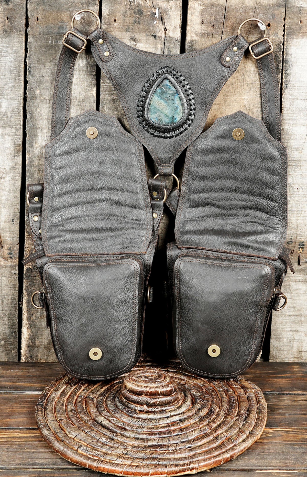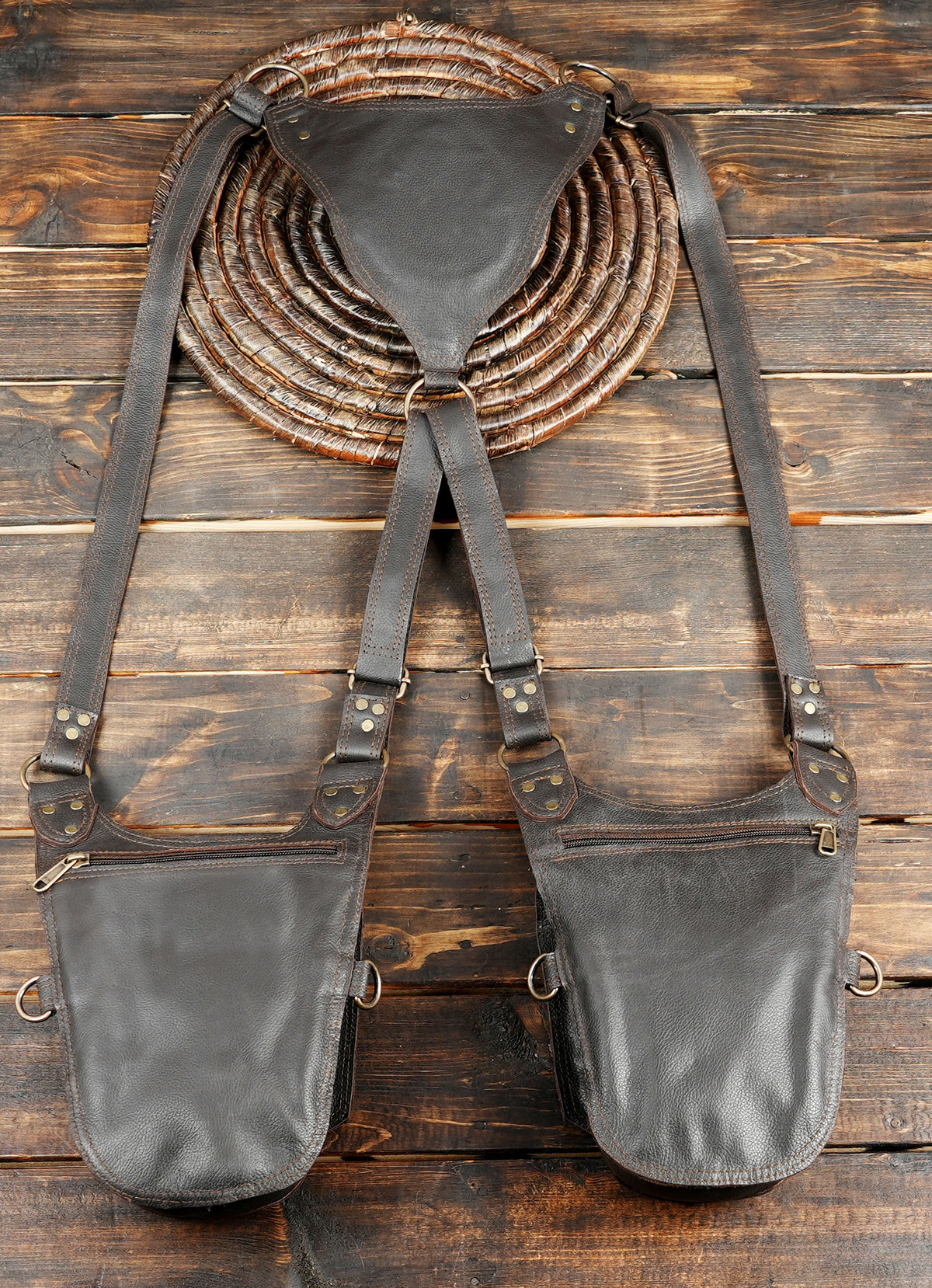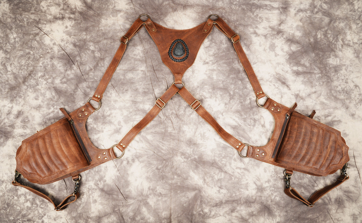 Handmade Leather Dual Holster with Gemstone Center || Adjustable Leather Utility Holster with Dual Storage (LT-AB-HLS-6075) - Dark Brown / Free Sized / Antic Brass