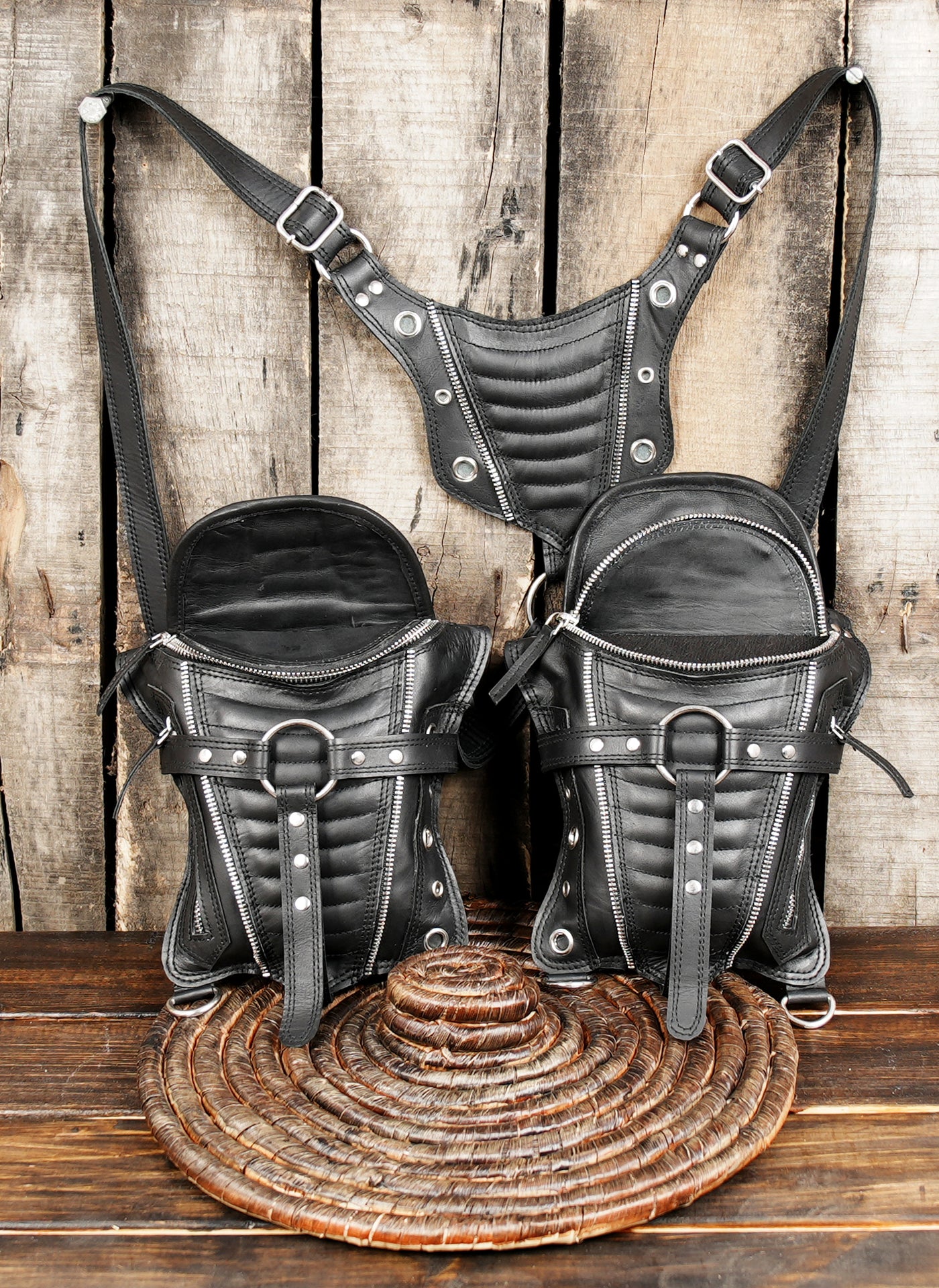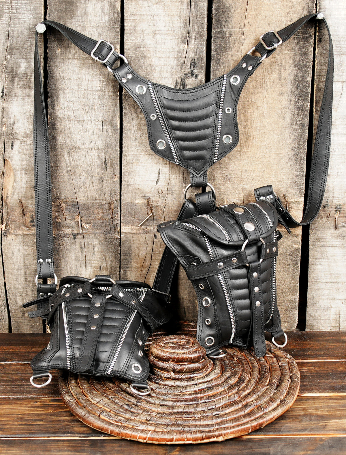 Handmade Black Leather Holster Bag for Festivals || Steampunk-Style Leather Utility Holster with Buckle Straps(LT-NS-HLS-6002) - Black / Free Sized / Antic Brass