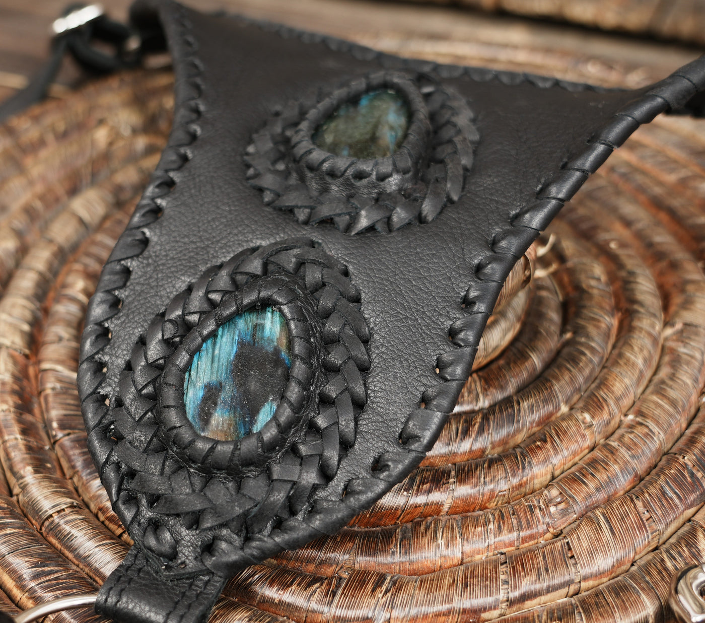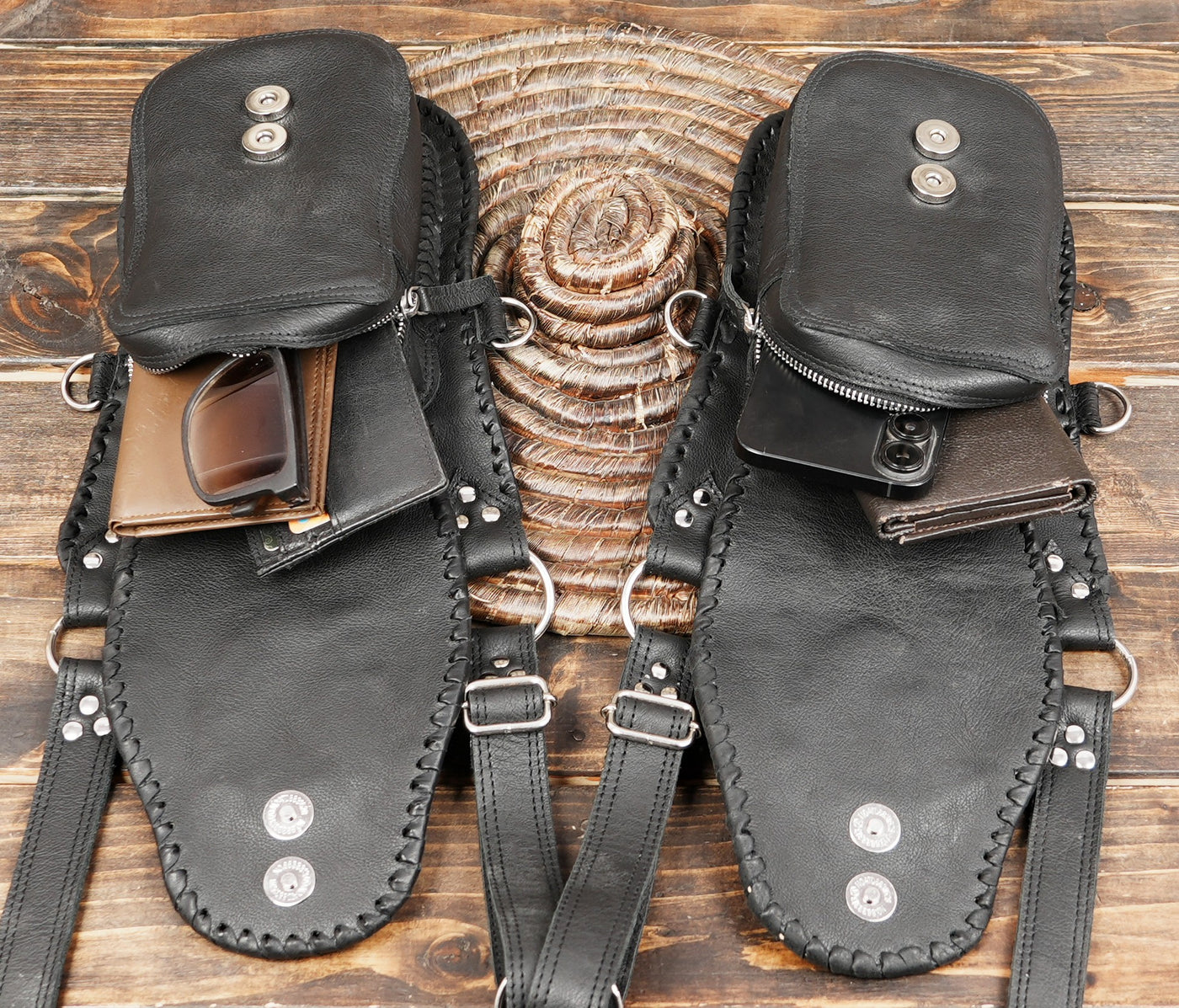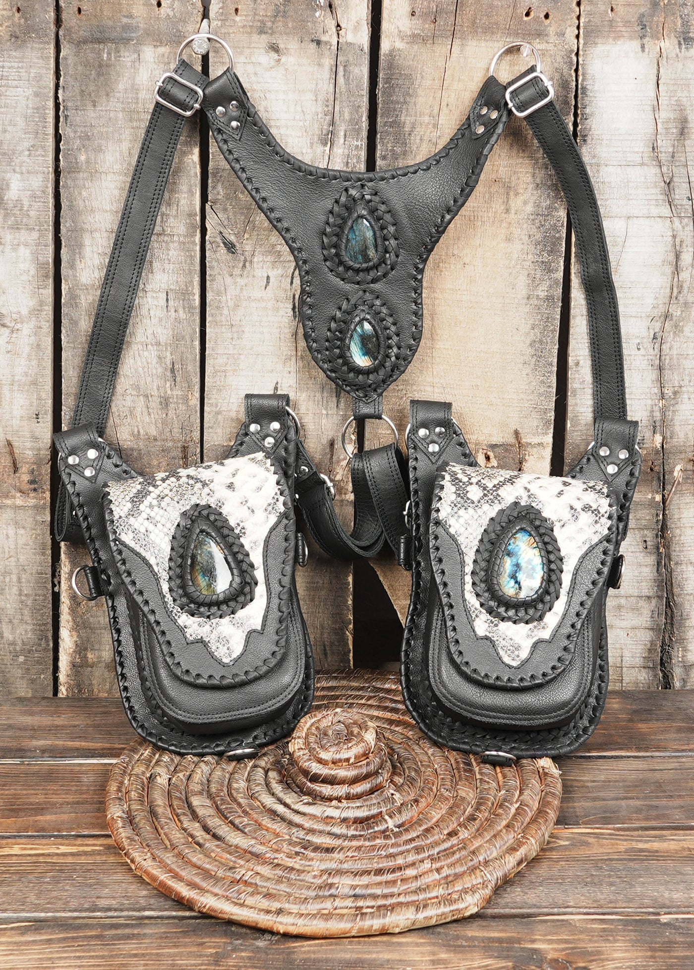 This leather holster has a dual-pouch design with adjustable straps that allow a comfortable and secure fit. It combines smooth black leather with snakeskin-style panels, braided trim and gemstone accents for a bold fantasy-inspired look. The metal clips and ring hardware add strength and flexibility, and each pouch offers space for small essentials while keeping hands free, making it useful for festivals, travel, cosplay, themed events or everyday styling.