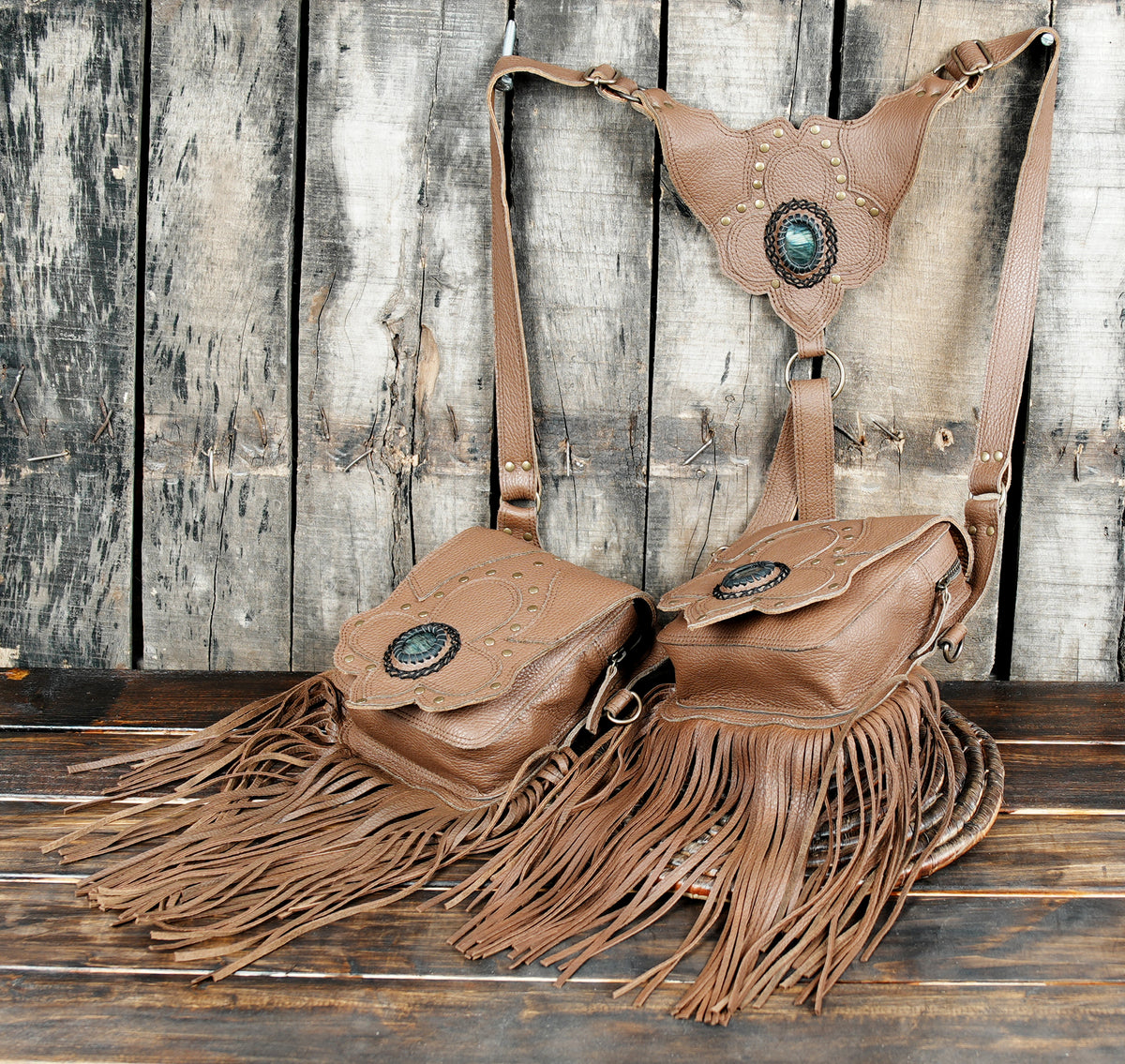 Crafted from soft brown leather, this dual-shoulder holster features matching pouch bags with detailed floral-inspired panels and a centered gemstone accent for a handcrafted look. The long flowing fringe adds movement and a boho feel, while the adjustable straps and sturdy metal hardware keep the fit secure and comfortable. Each pouch offers practical storage for essentials, making it useful for festivals, travel or everyday carry. The overall design blends function with style, giving it a rustic, artistic character that stands out without feeling heavy or bulky.