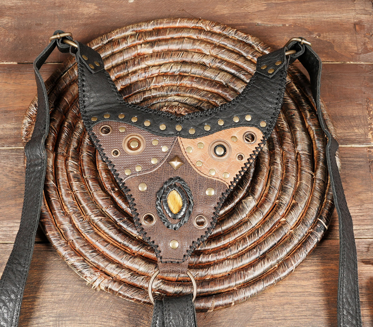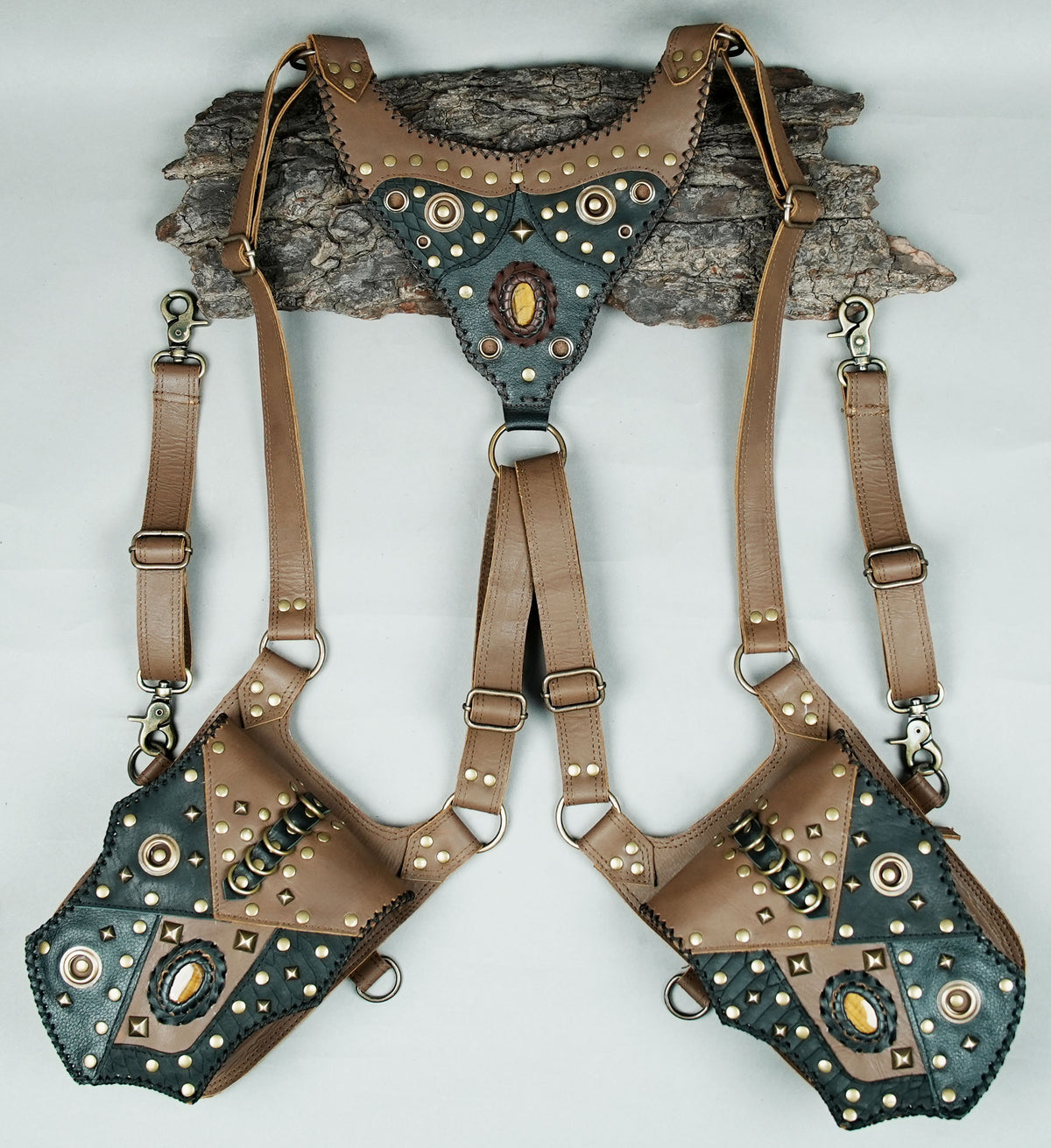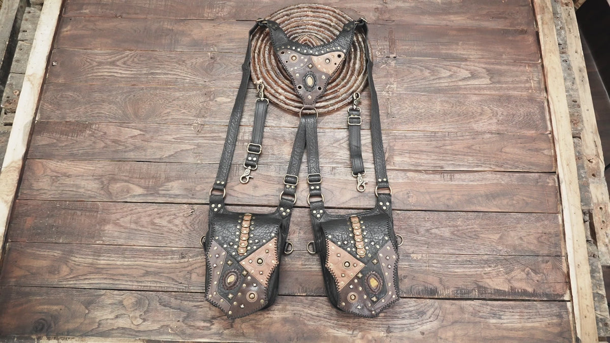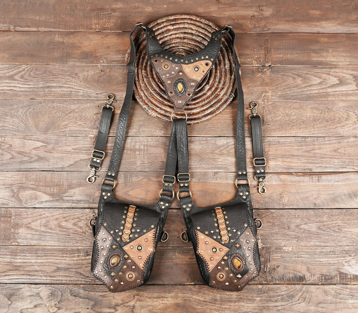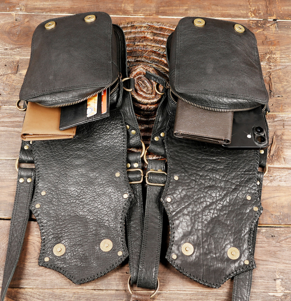 Handmade Leather Holster Bag with Dual Pouches || Bohemian Inspired Leather Holster Rig (LT-AB-HLS-6065) - Black / Free Size / Antic Brass