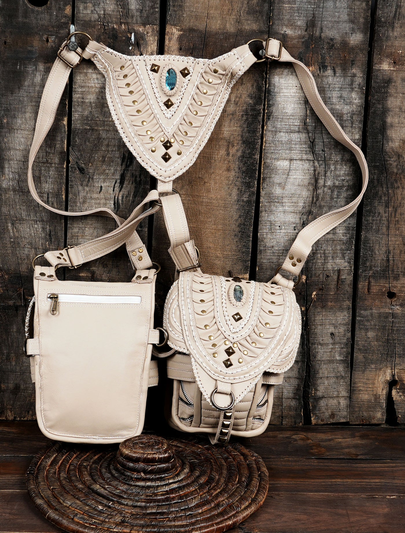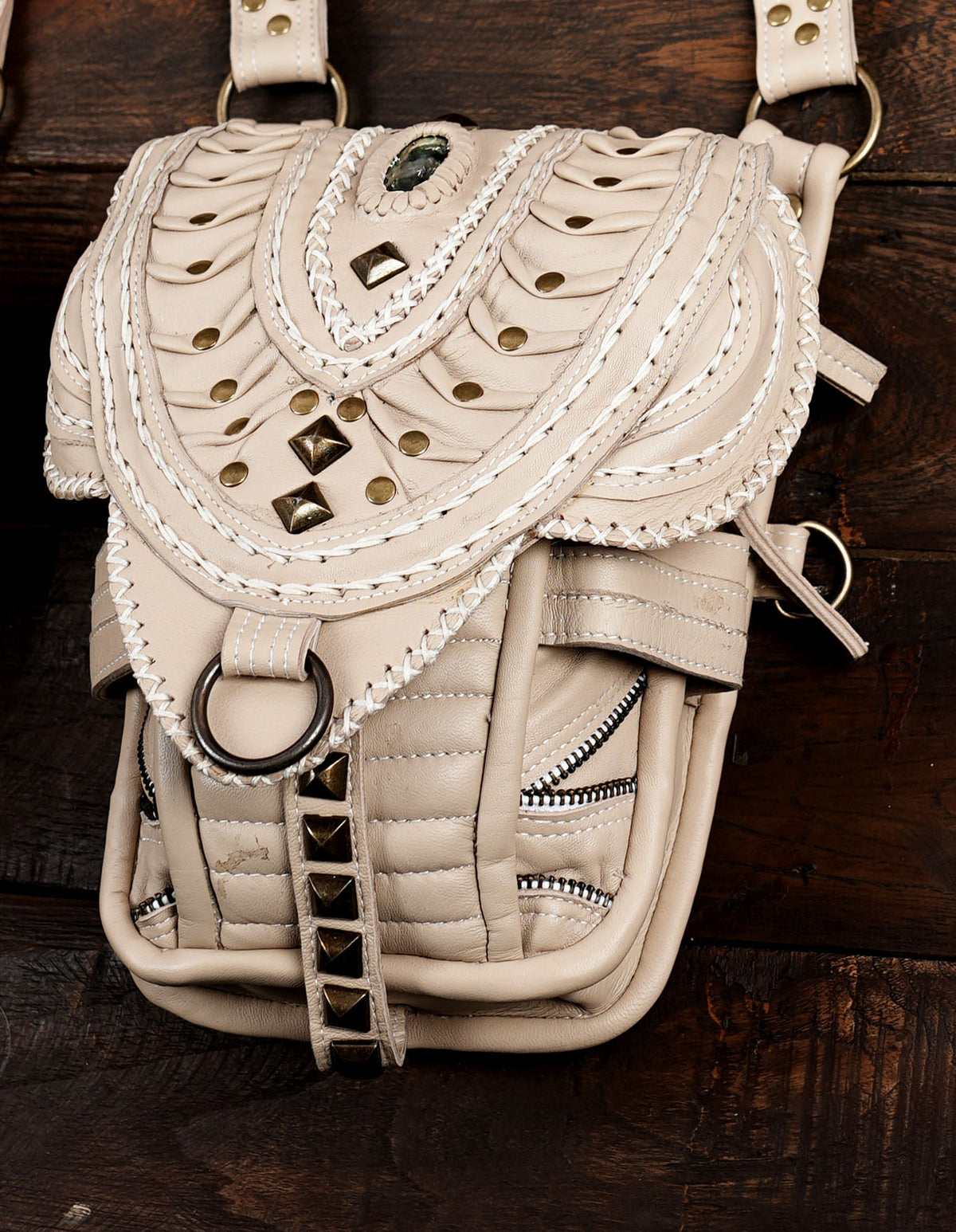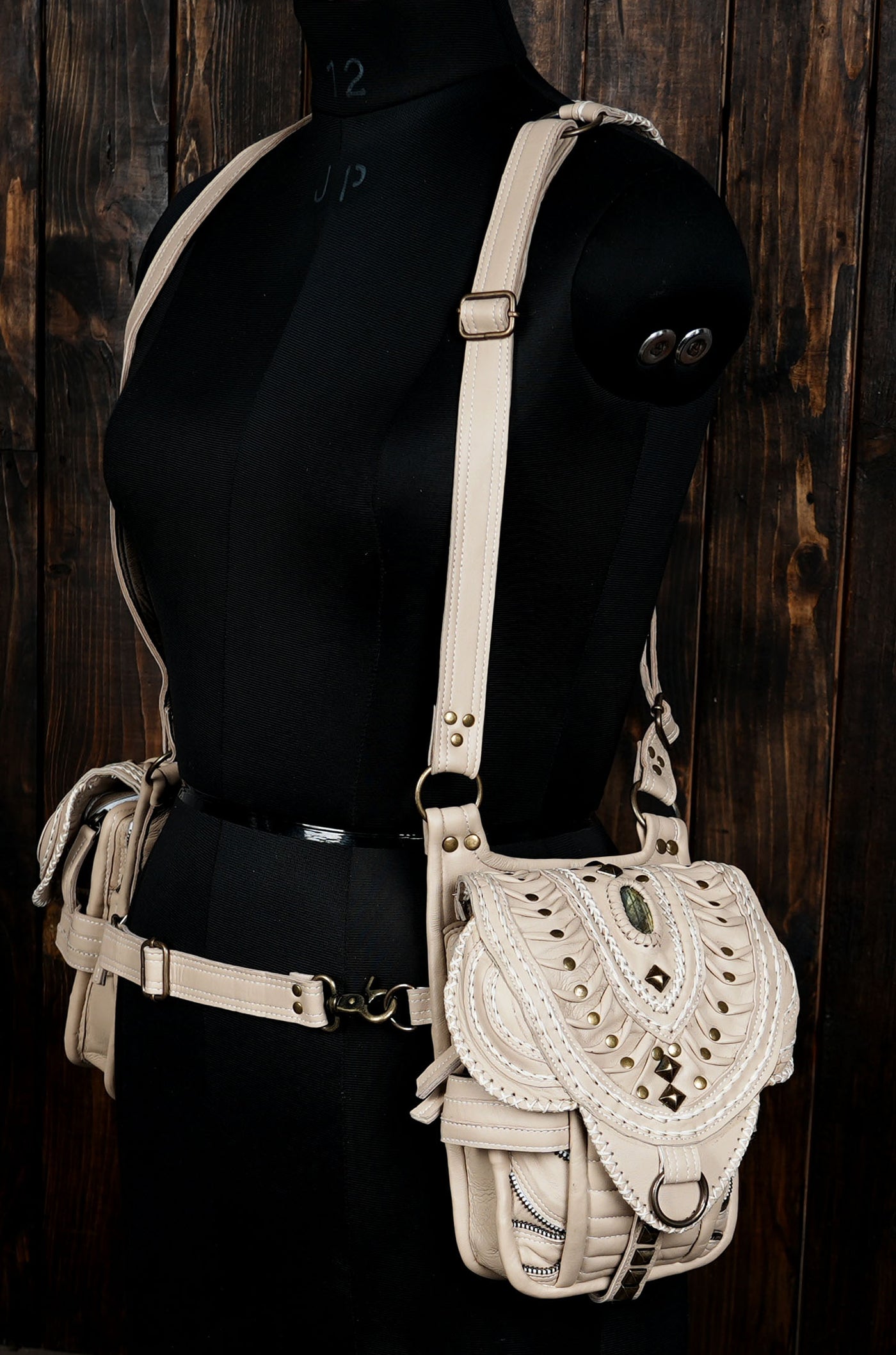 Handmade Genuine Leather Holster with Adjustable Straps || Steampunk Style Leather Holster (LT-AB-HLS-6003) - Extra Care Off-White / Free Size / Antic Brass
