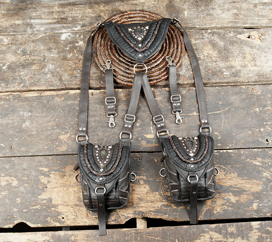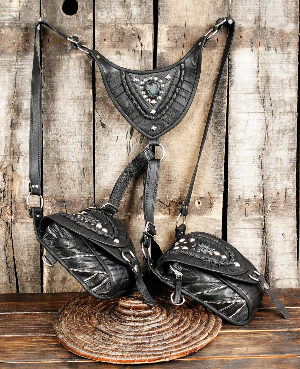 “Handmade Leather Holster Belt with Dual Utility Pouches ||Boho-Steampunk Leather Holster with Layered Stitching and Studs (LT-NS-HLS-6004) - Black / Free Size / Antic Brass