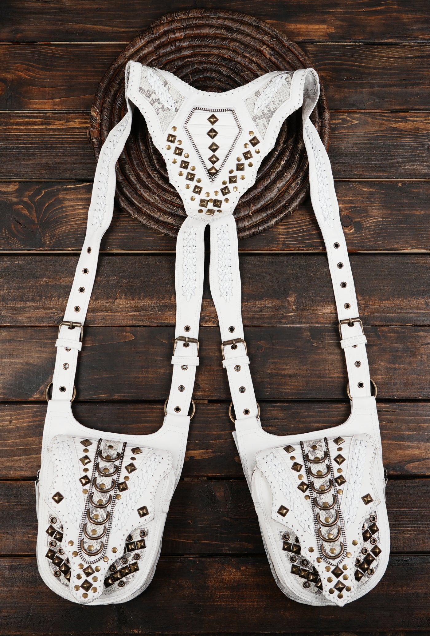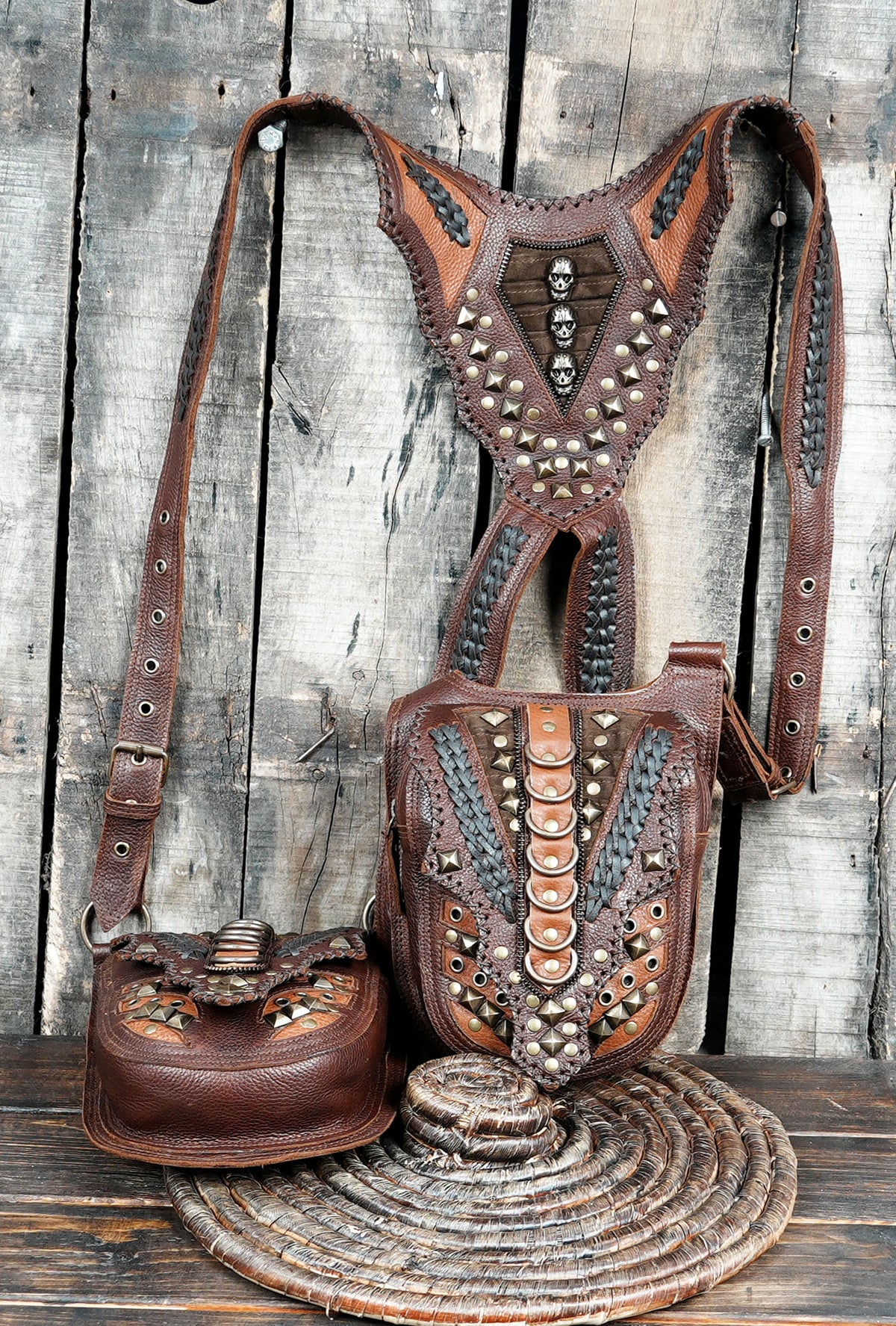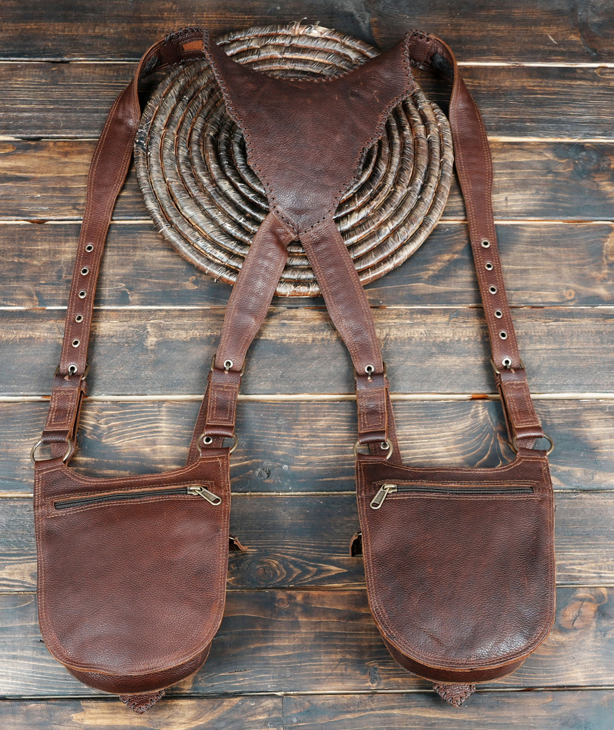Handmade Leather Holster Harness with Dual Pouches || Brown Leather Shoulder Holster with Adjustable Straps (LT-AB-HLS- 6007) - Dark Brown / Free Sized