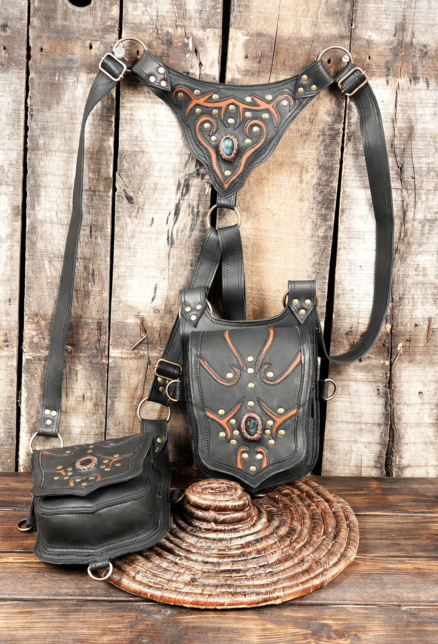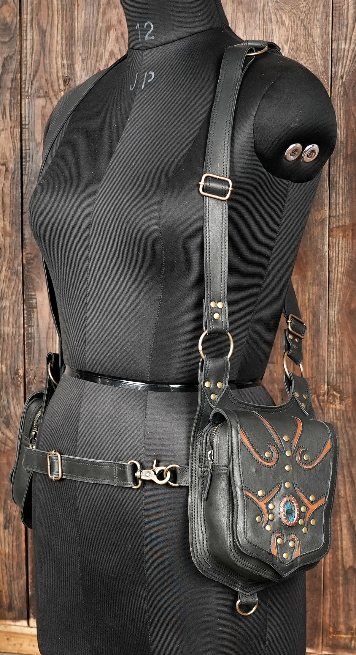 Handmade Genuine Leather Holster with Gemstone Detail || Boho Tribal Leather Holster Bag (LT-AB-HLS-6042) - Black / Free Sized / Antic Brass