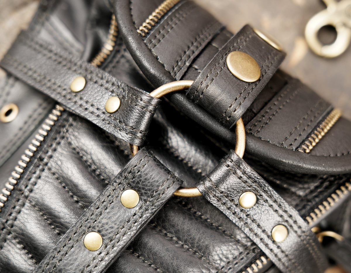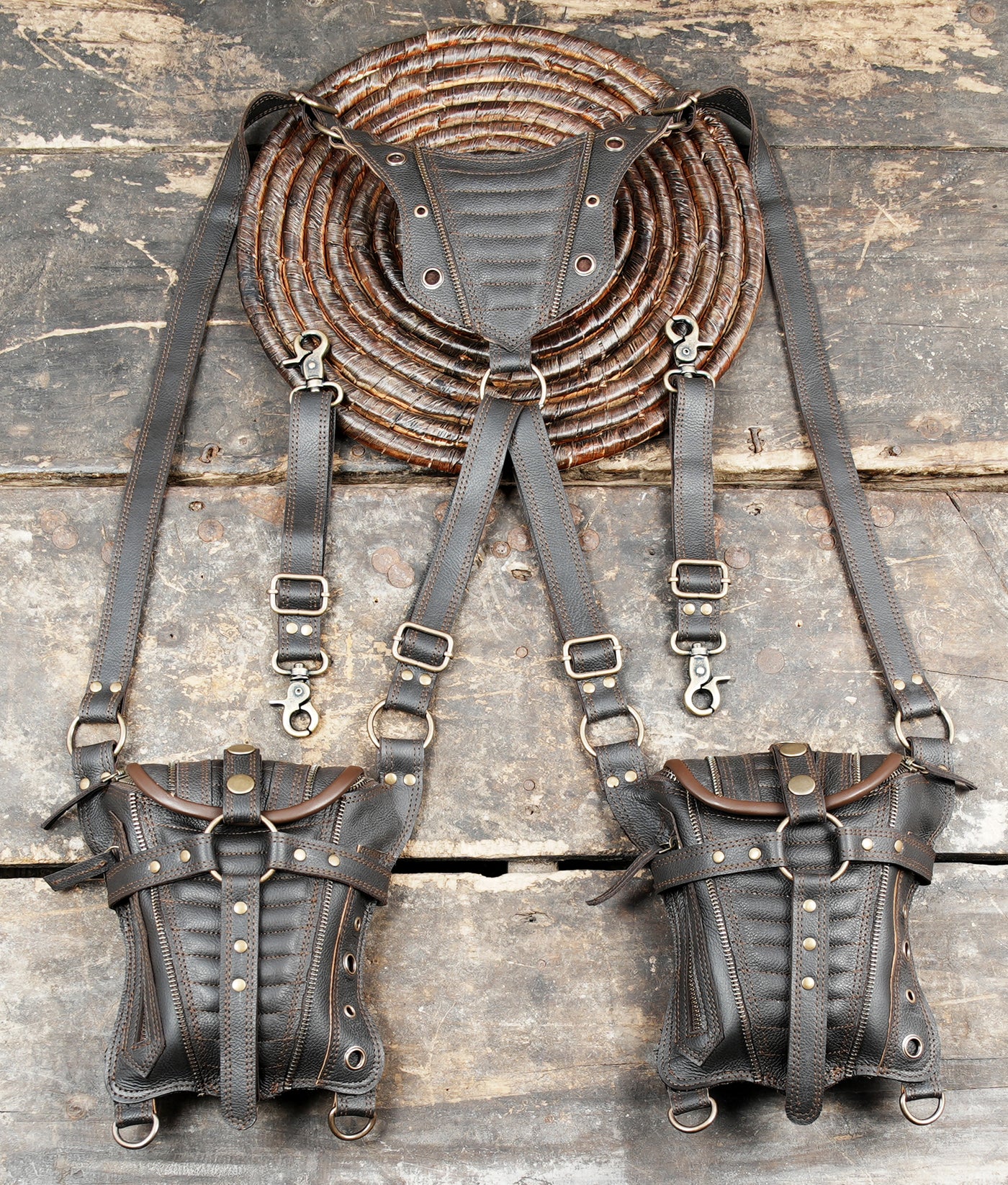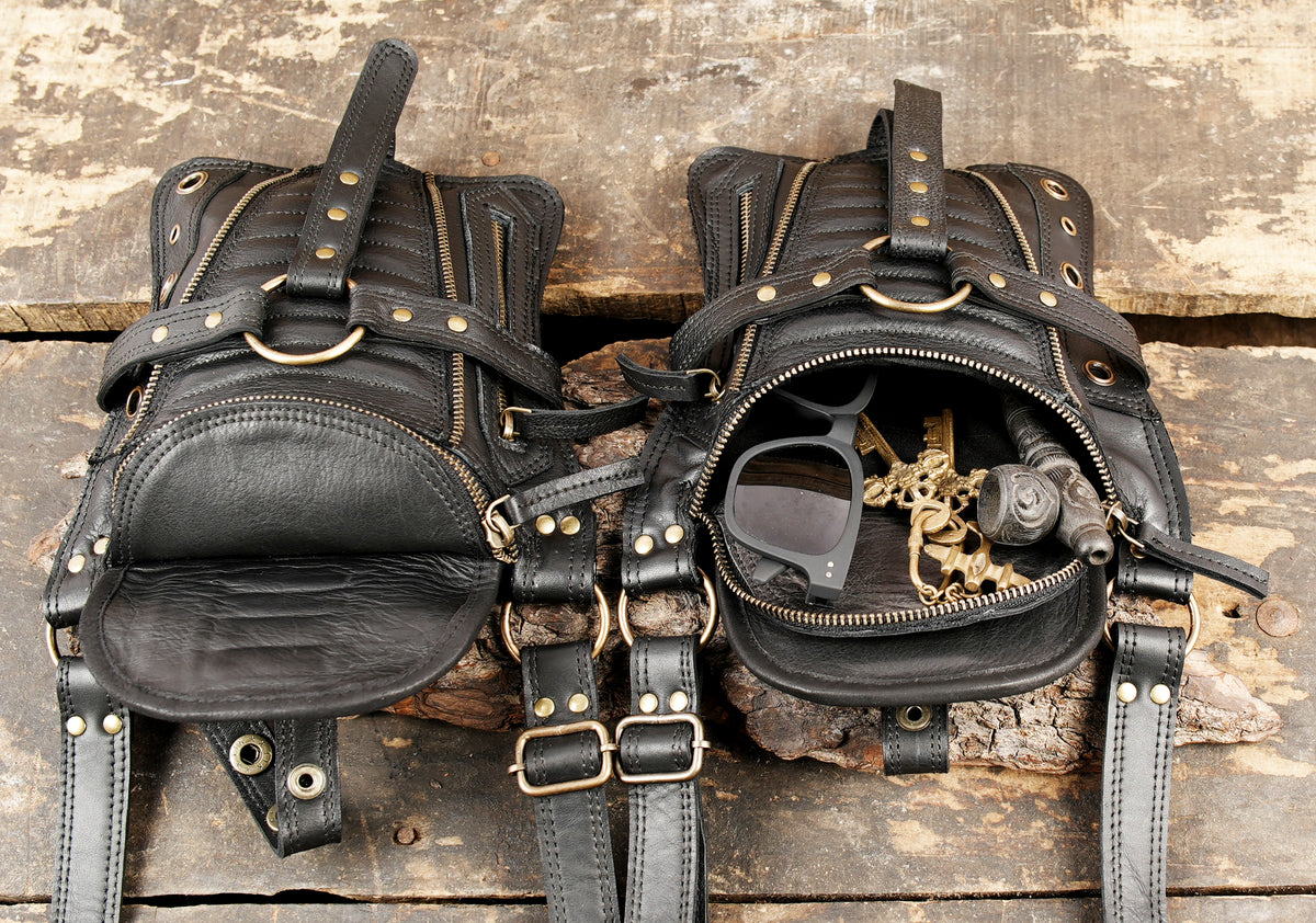 Black Steampunk Leather Double Holster with Zipper Detailing || Dual Pouch Shoulder Rig Holster for Festivals and Outdoor Use (LT-AB-HLS-6124) - Black / Free Sized / Antic Brass