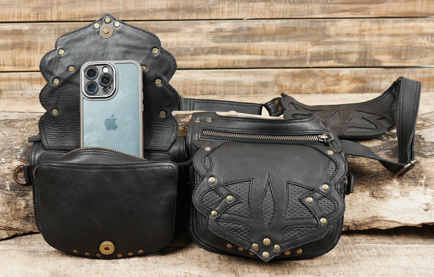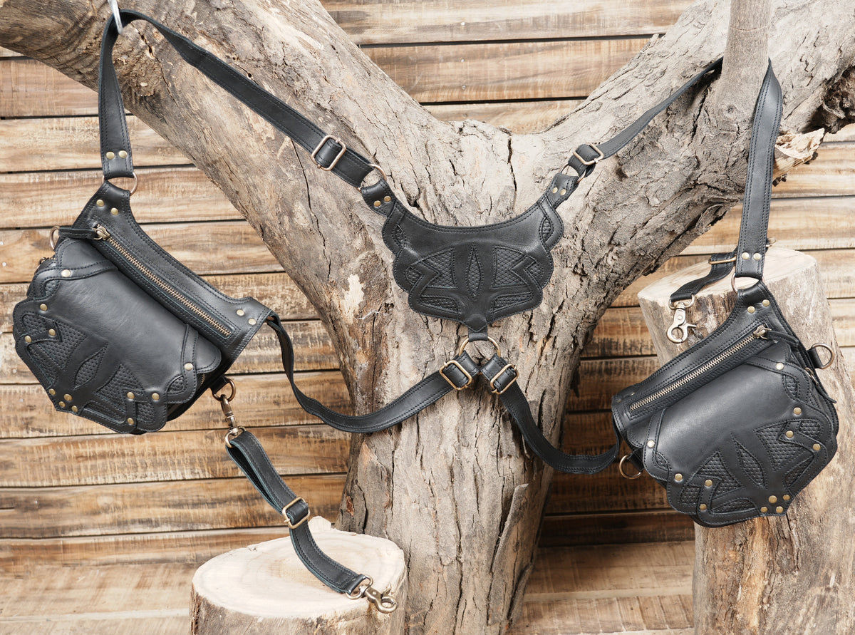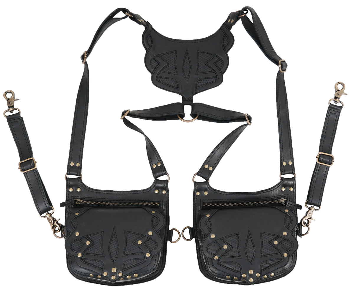 This leather holster is carefully handcrafted from premium black leather, giving it a strong and refined finish with a distinctive tribal-embossed pattern. The double pouch design offers practical space for carrying essentials while keeping everything secure and easy to access. Its adjustable shoulder and waist straps provide a comfortable, well-balanced fit that stays stable during movement, making it suitable for long hours of wear. Finished with durable brass hardware, detailed stitching, and smooth zip closures, this holster blends rugged functionality with artistic style, making it a perfect choice for festivals, travel, cosplay, or alternative fashion use.