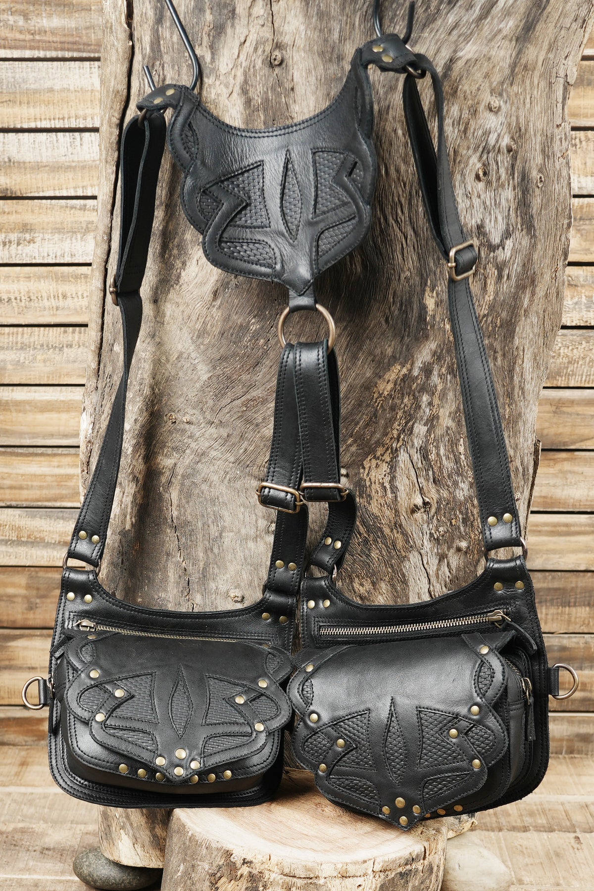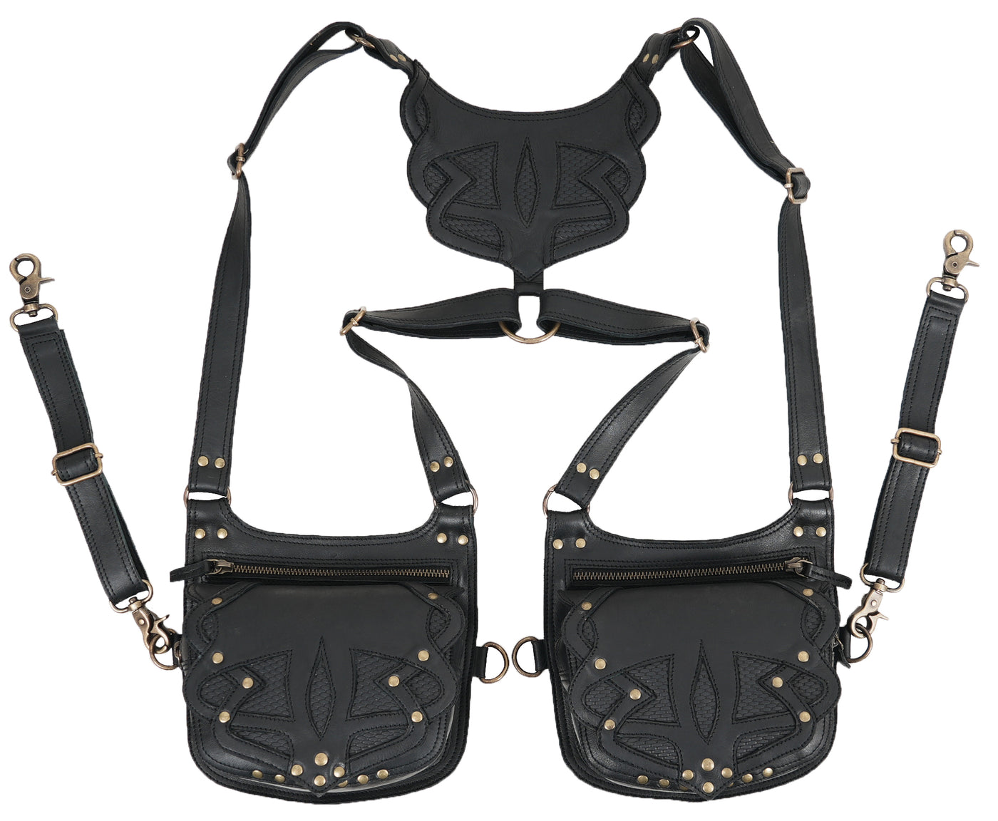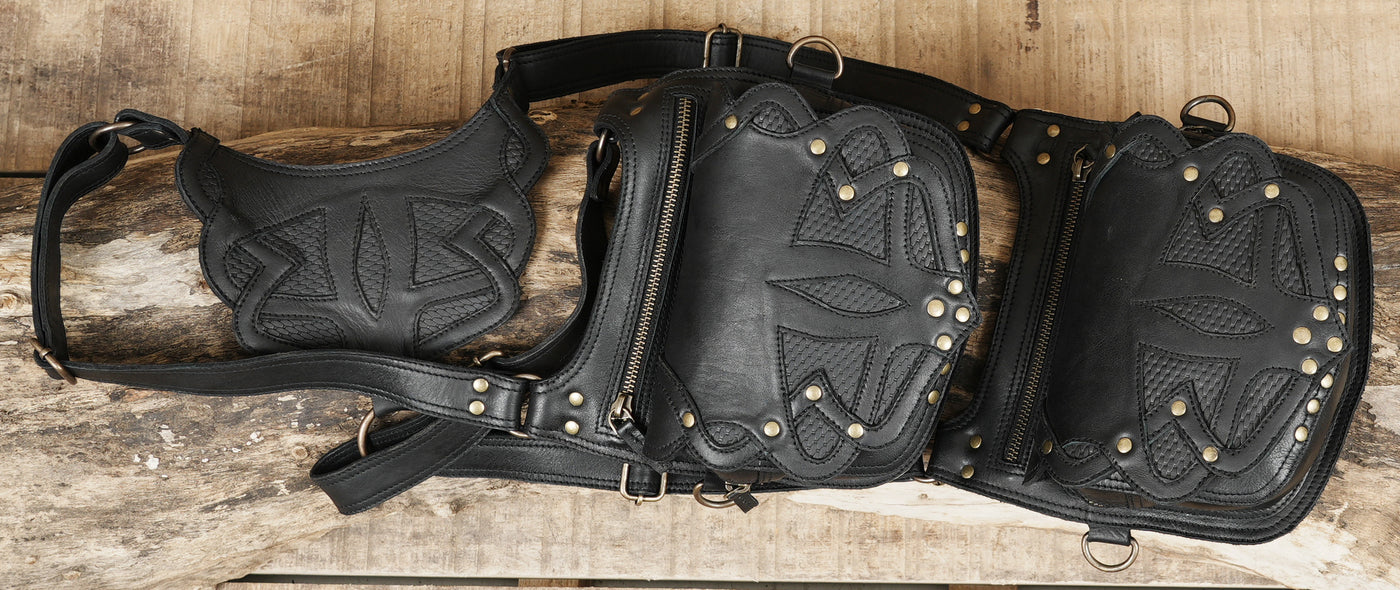 This leather holster is carefully handcrafted from premium black leather, giving it a strong and refined finish with a distinctive tribal-embossed pattern. The double pouch design offers practical space for carrying essentials while keeping everything secure and easy to access. Its adjustable shoulder and waist straps provide a comfortable, well-balanced fit that stays stable during movement, making it suitable for long hours of wear. Finished with durable brass hardware, detailed stitching, and smooth zip closures, this holster blends rugged functionality with artistic style, making it a perfect choice for festivals, travel, cosplay, or alternative fashion use.