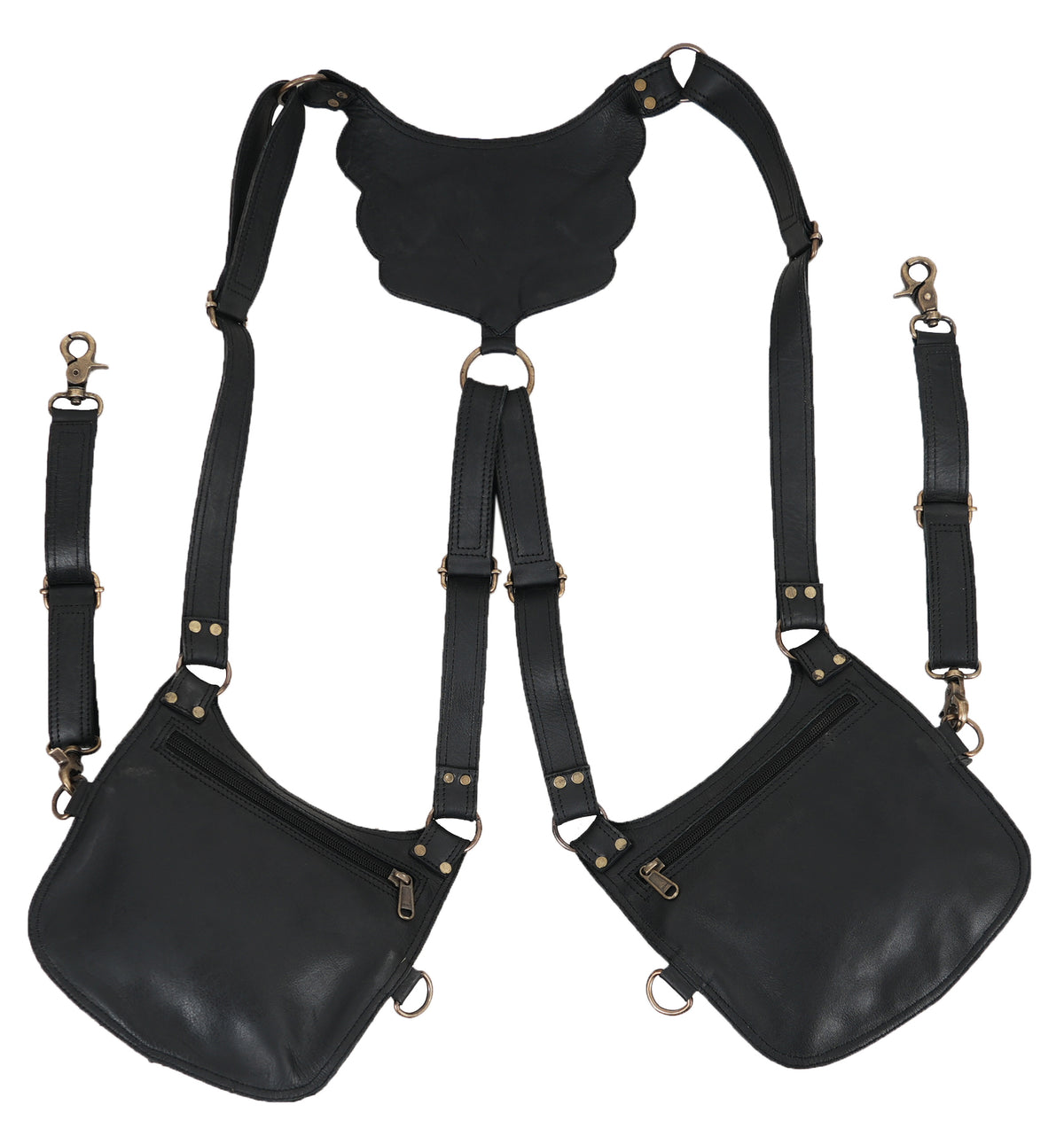 Handmade Tribal Leather Double Pouch Holster Harness || Black Leather Utility Harness with Dual Storage Pouches (LT/AB/HLS/6035) - Black / Free Sized / Antic Brass