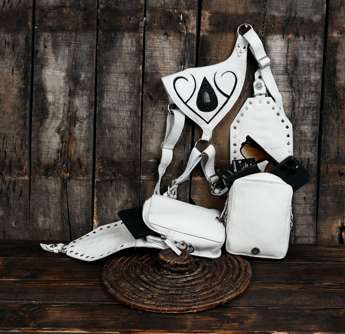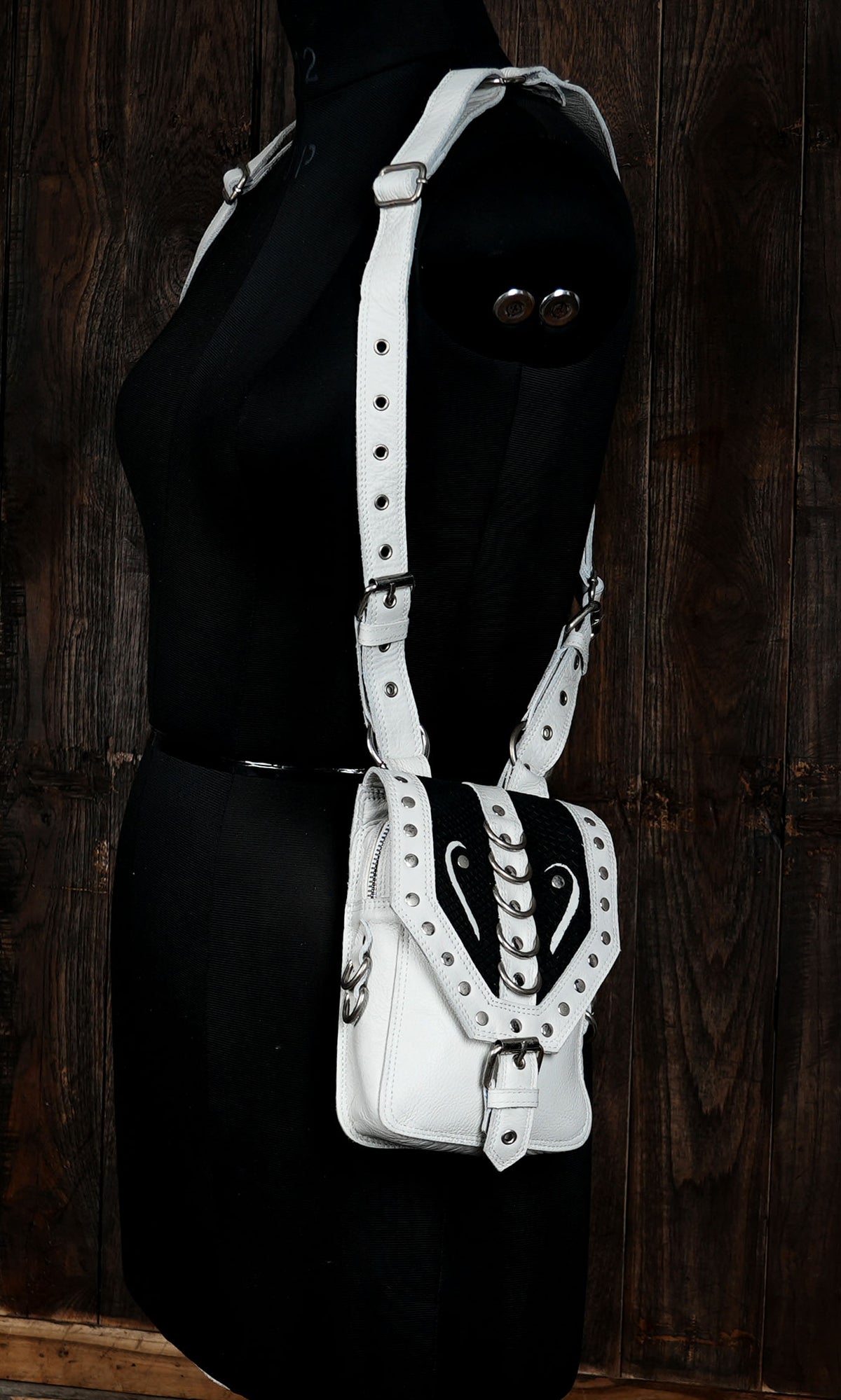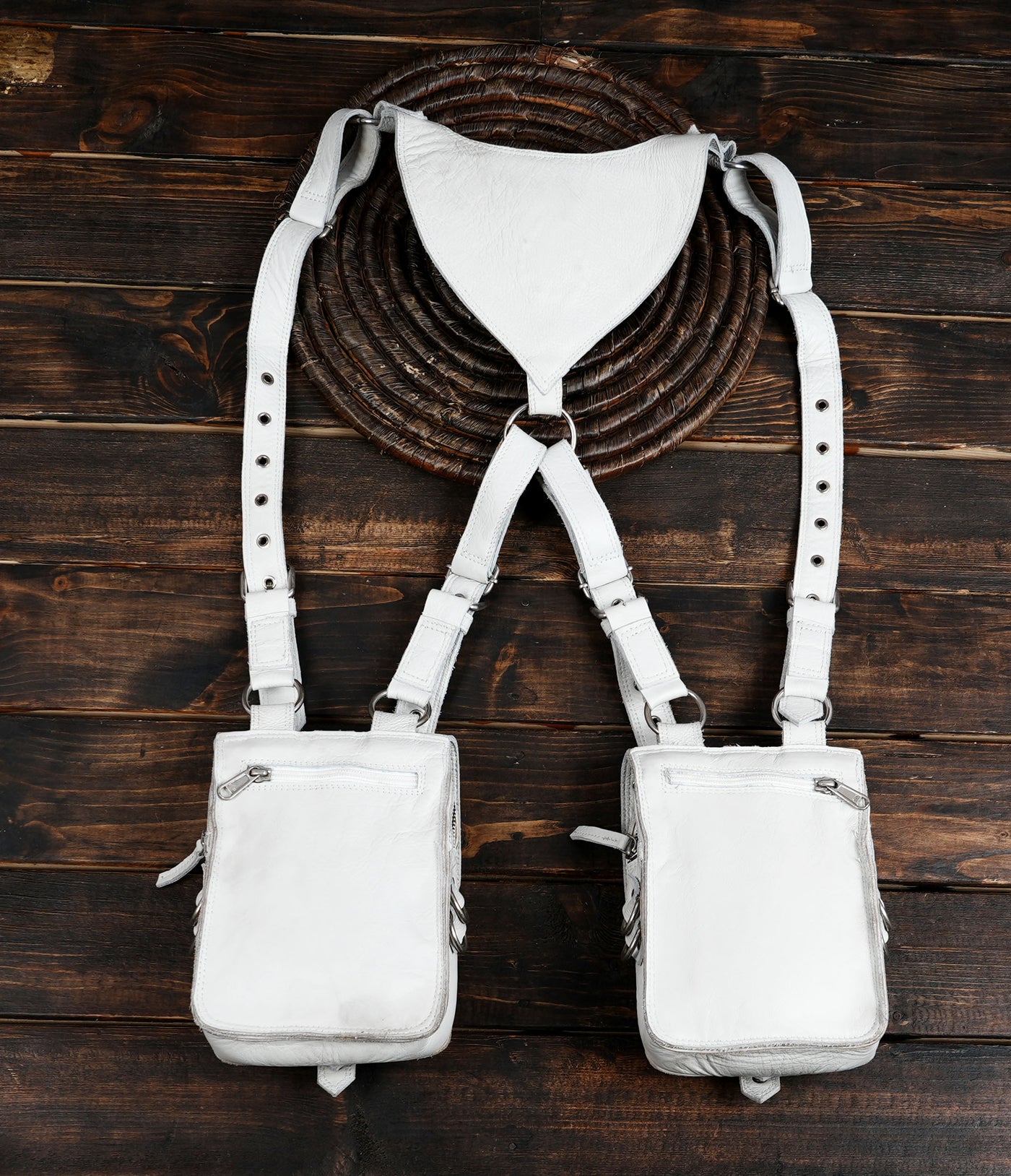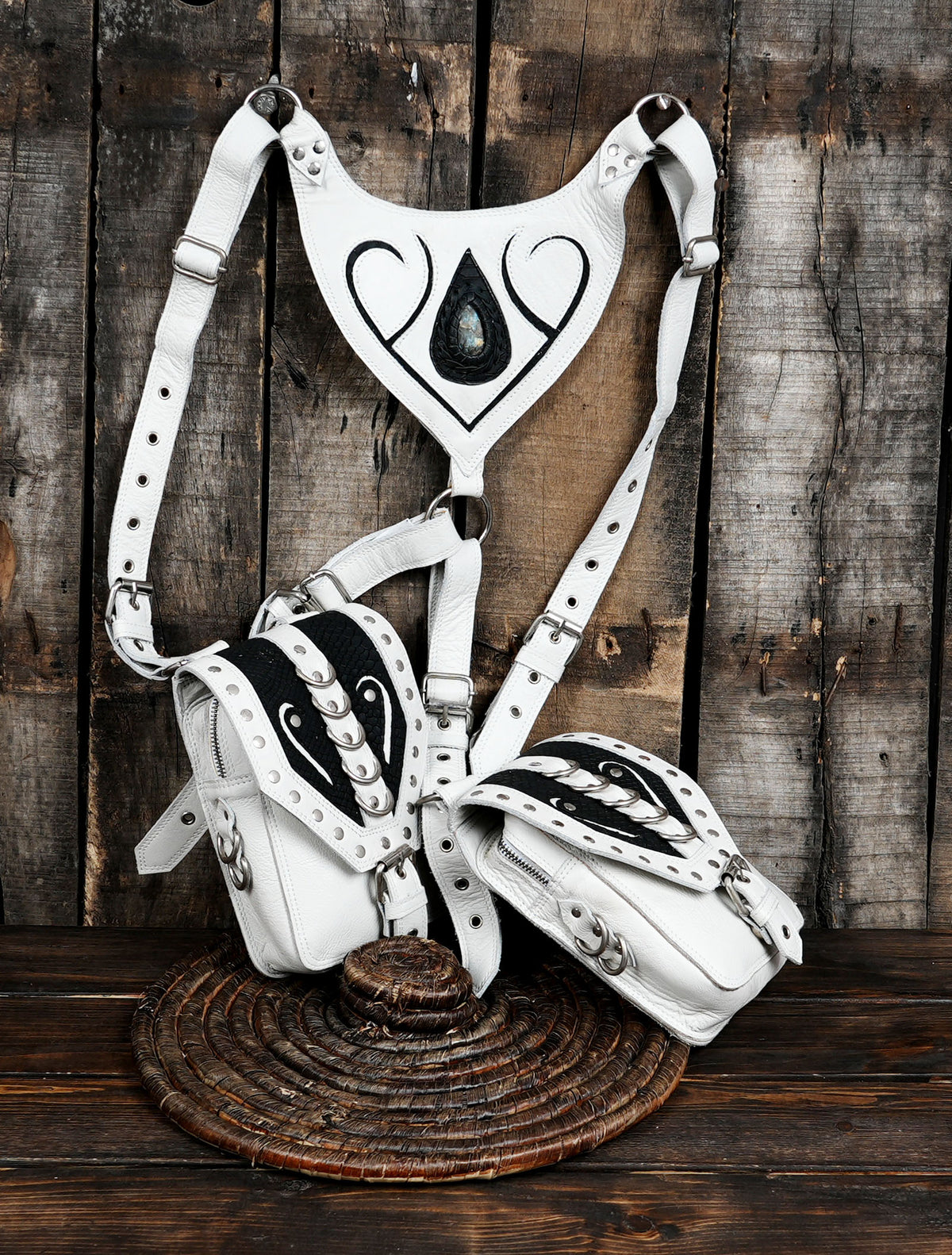 White Leather Dual Shoulder Holster with Black Accents || Gothic White and Black Leather Utility Holster with Dual Pouches(LT-NS-HLS-6021) - Extra Care of White / Free Size / Antic Brass