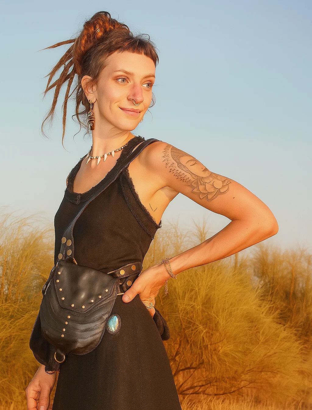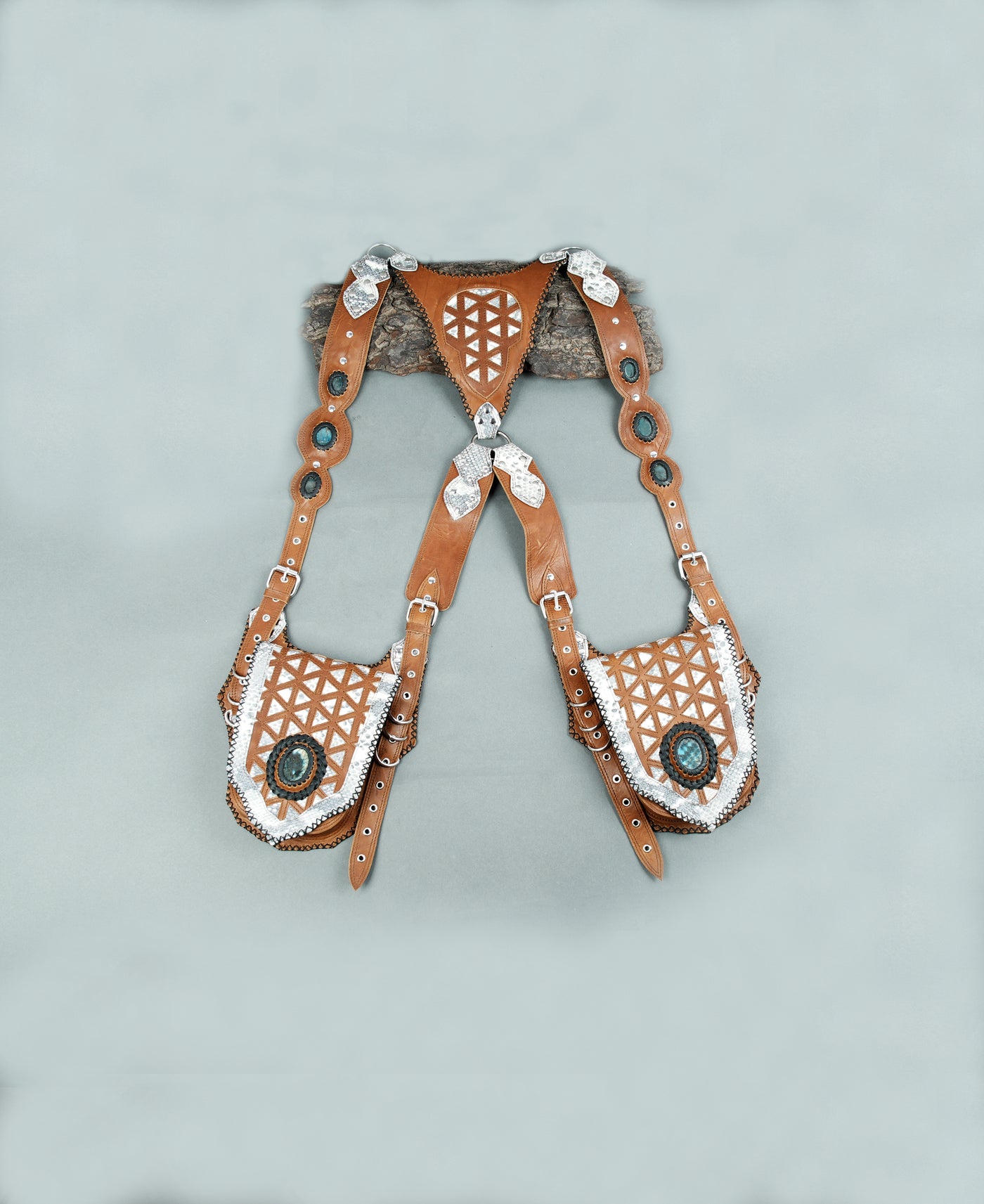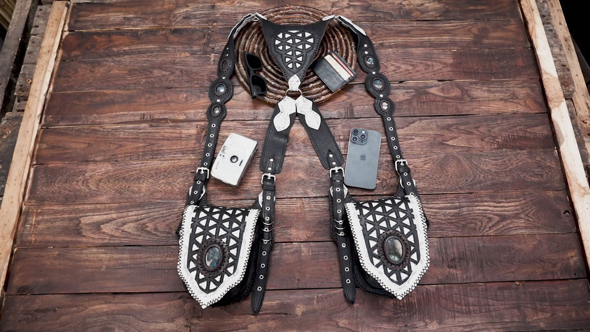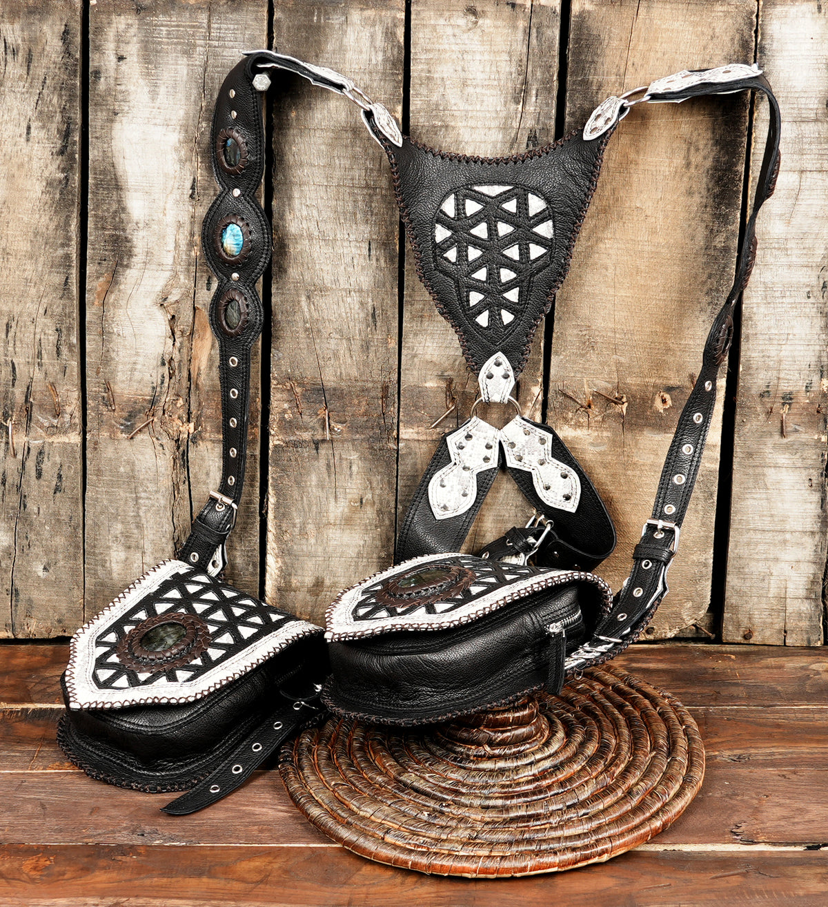 Premium Handmade Leather Festival Holster with Tribal Detailing || Black and White Steampunk Leather Holster with Dual Pouches (LT-NS-HLS-6019) - Black / Free Sized / Antic Brass