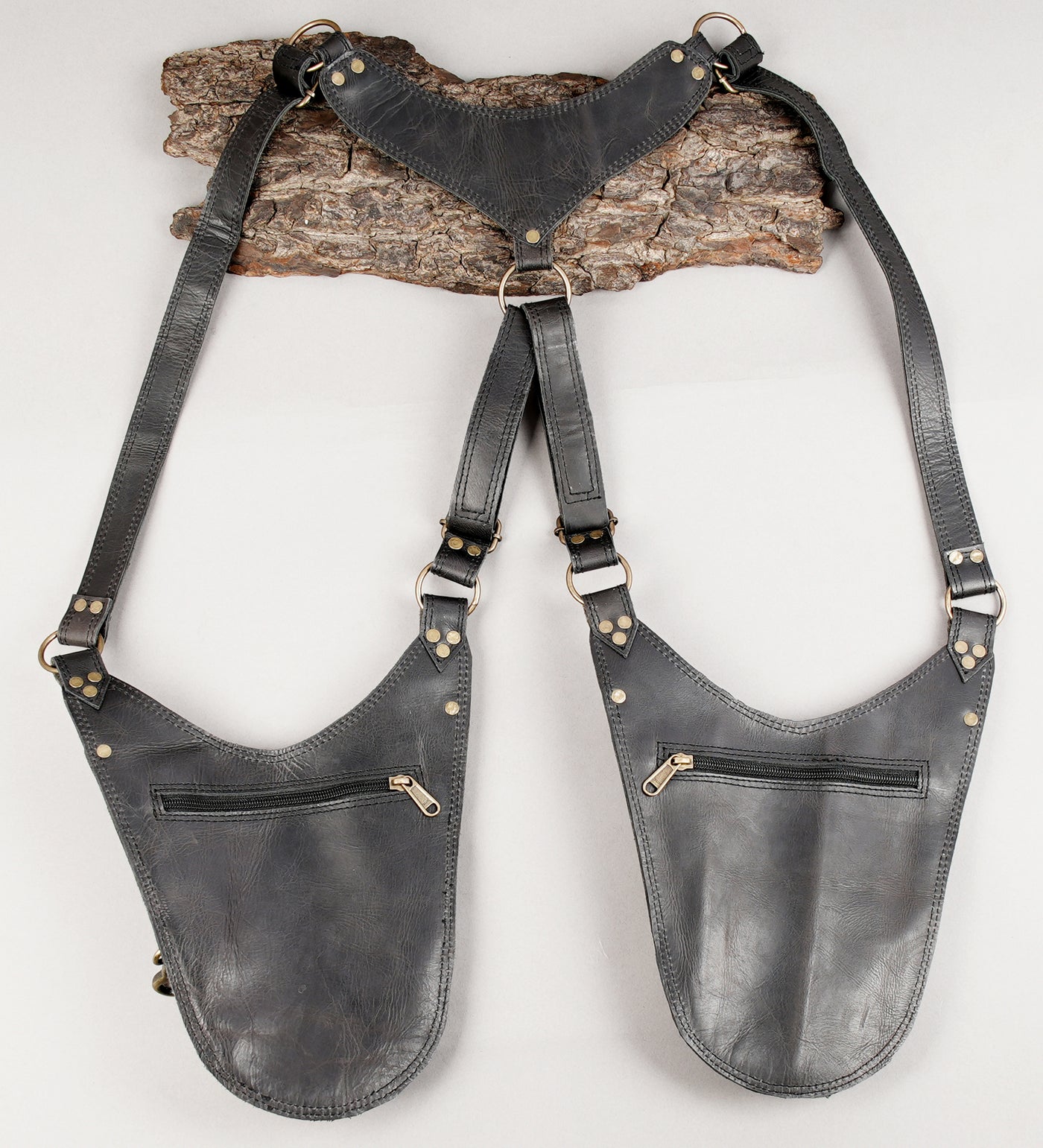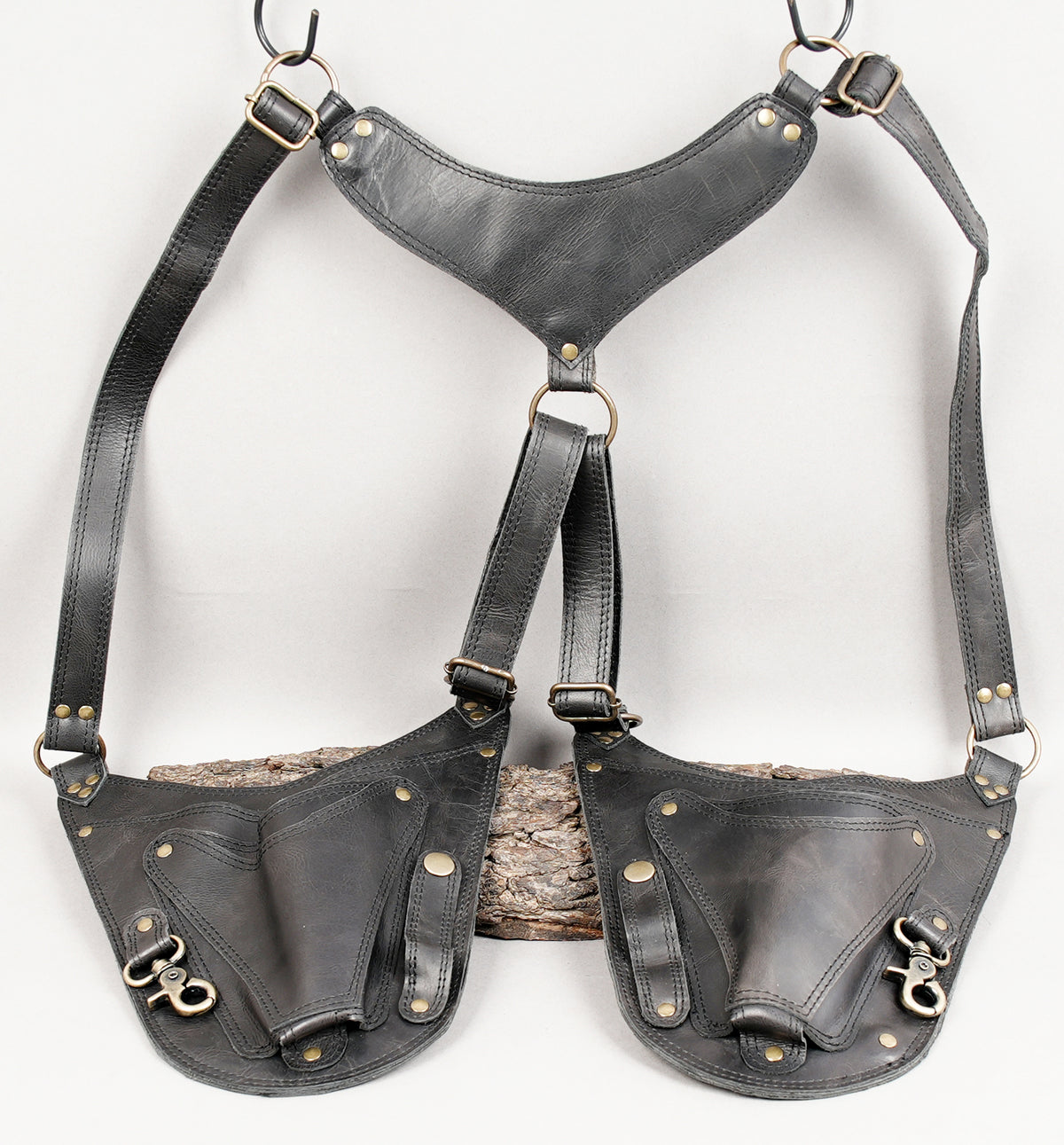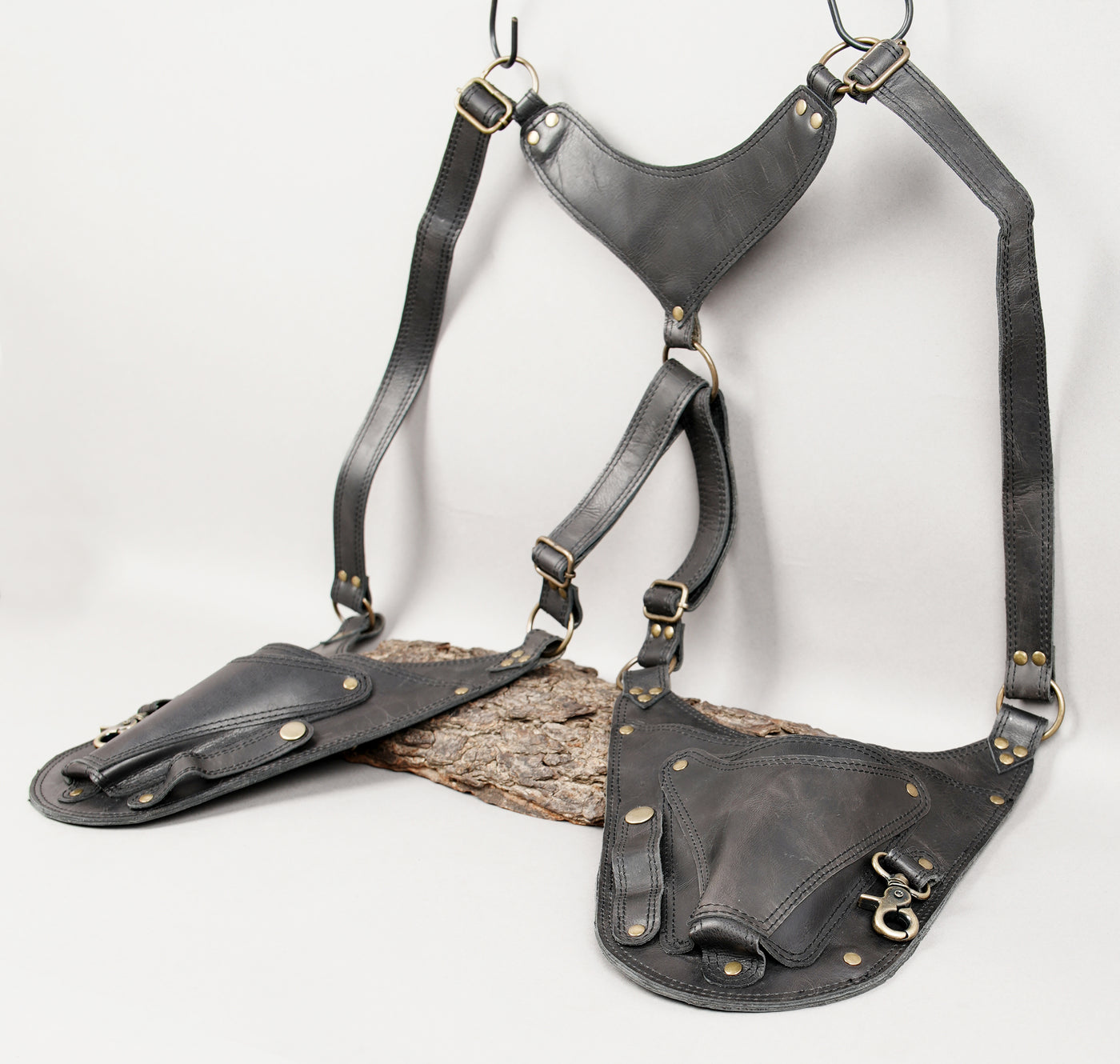 This black leather shoulder holster features a dual-pouch design, adjustable straps, and strong brass hardware for durability. It provides comfortable hands-free carry with secure snap closures and detachable straps. Ideal for travel, festivals, and daily use, it offers practical storage with a stylish, tactical look.