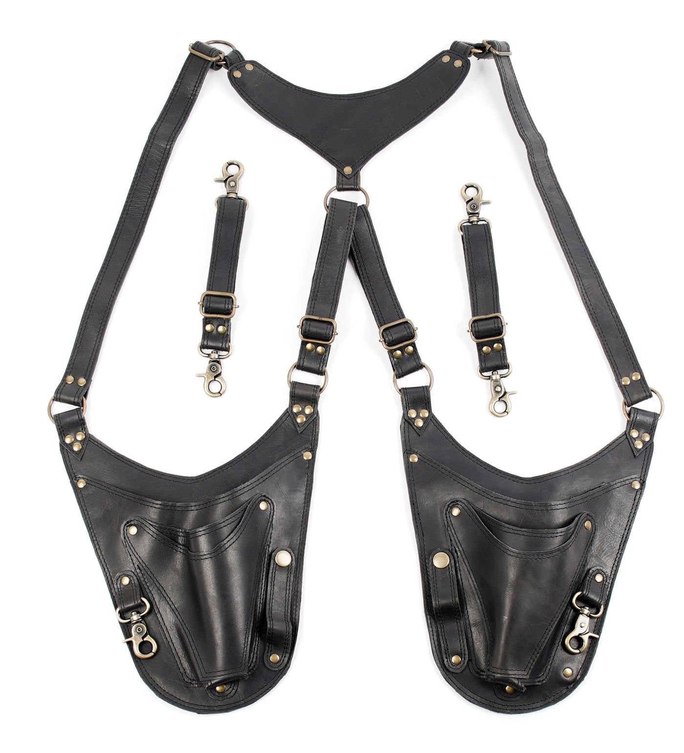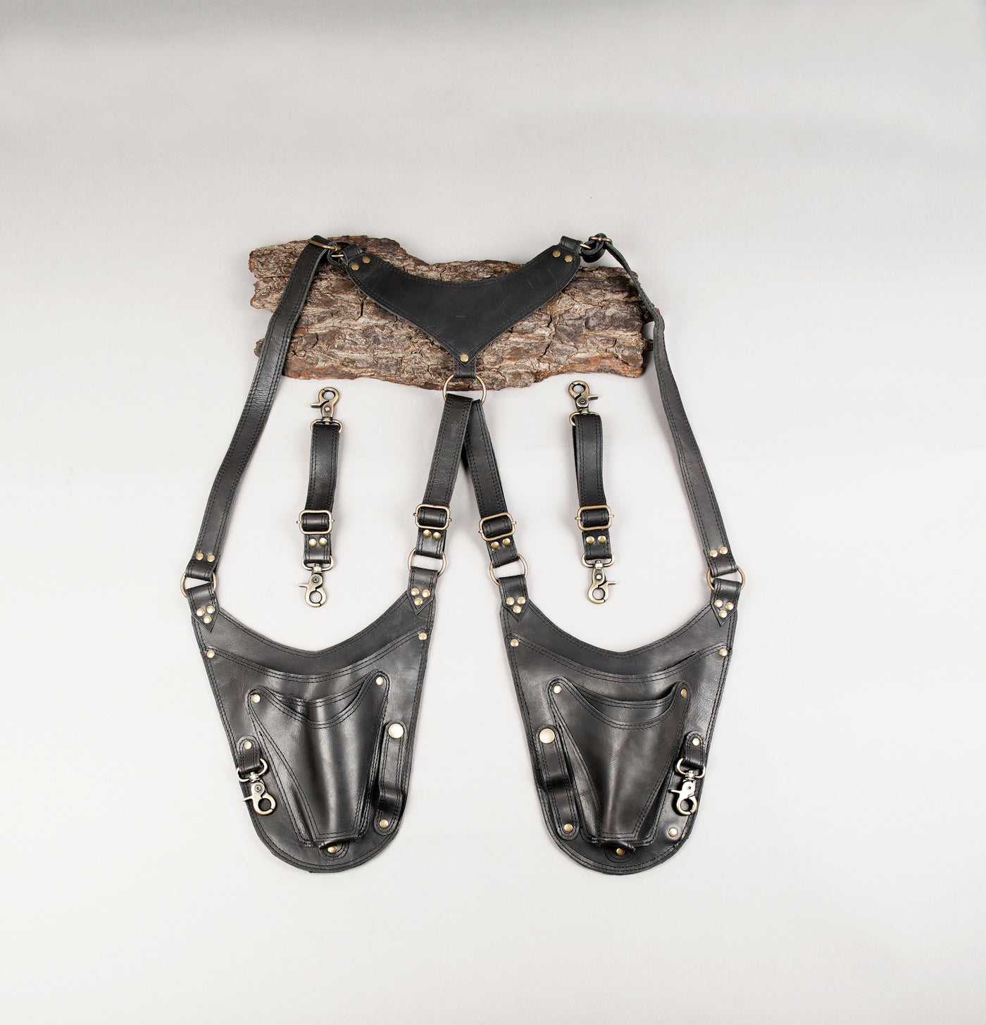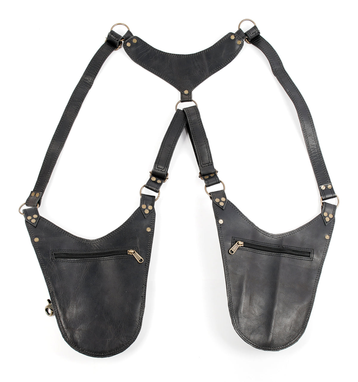 This black leather shoulder holster features a dual-pouch design, adjustable straps, and strong brass hardware for durability. It provides comfortable hands-free carry with secure snap closures and detachable straps. Ideal for travel, festivals, and daily use, it offers practical storage with a stylish, tactical look.