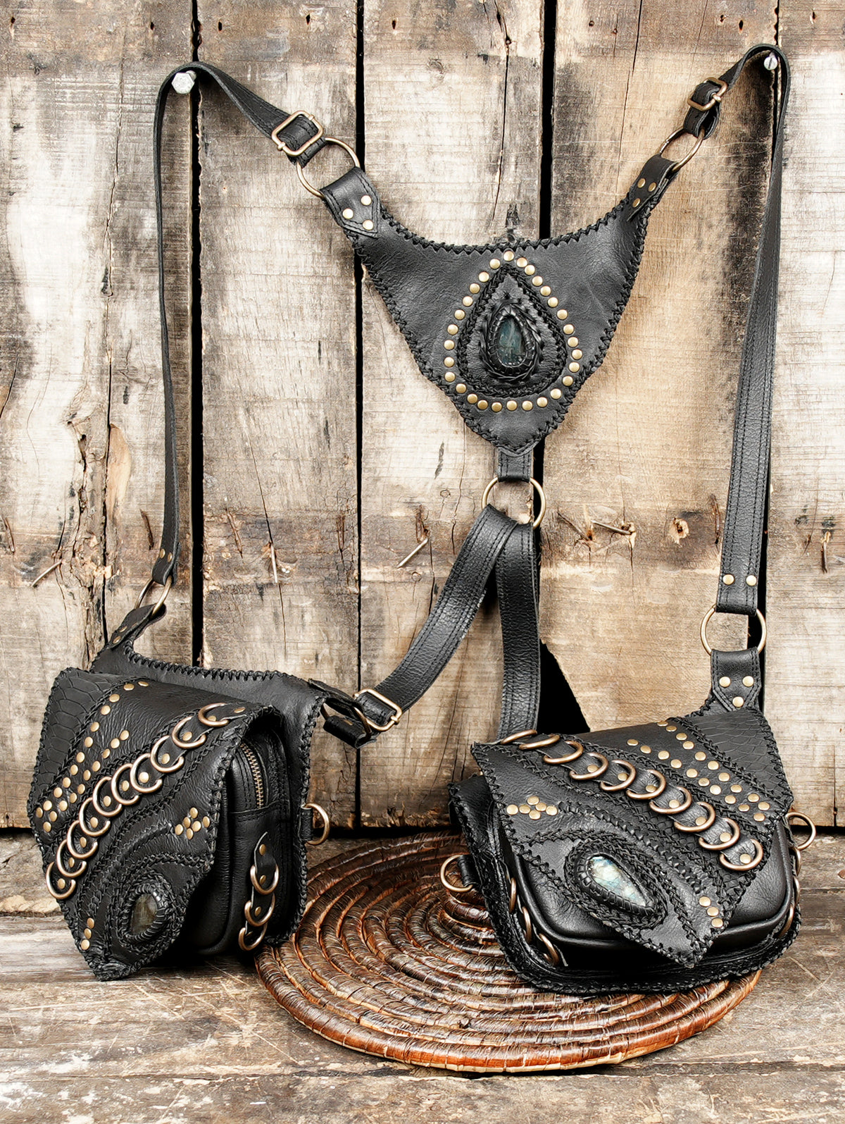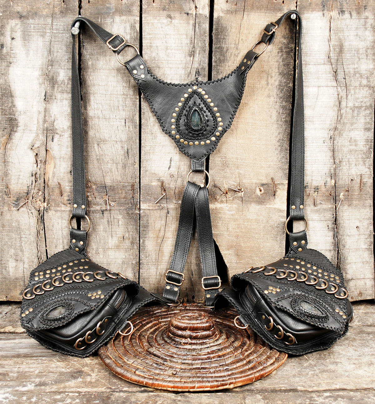 Handmade Black Leather Dual Pouch Chest Holster || Tribal Style Leather Holster with Gemstone Accent (LT-AB-HLS-6048) - Black / Free Size / Antic Brass