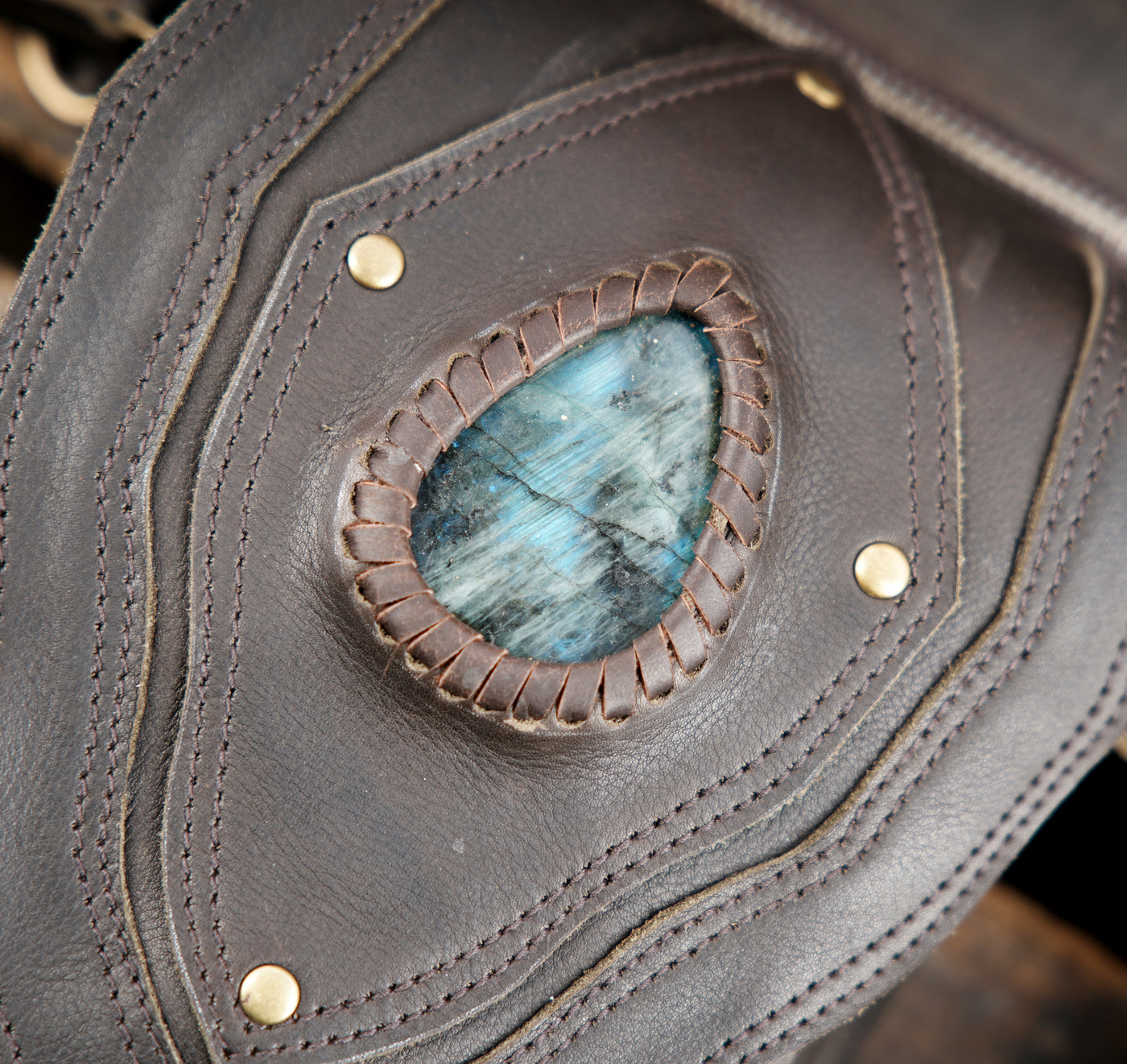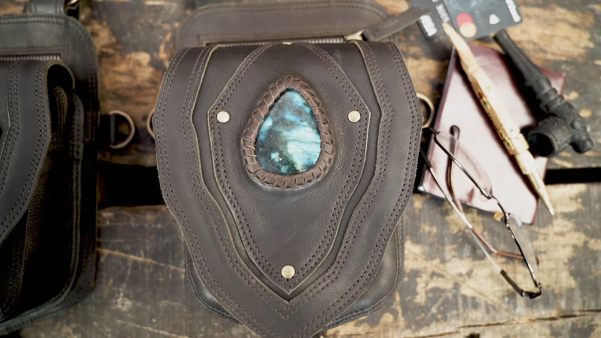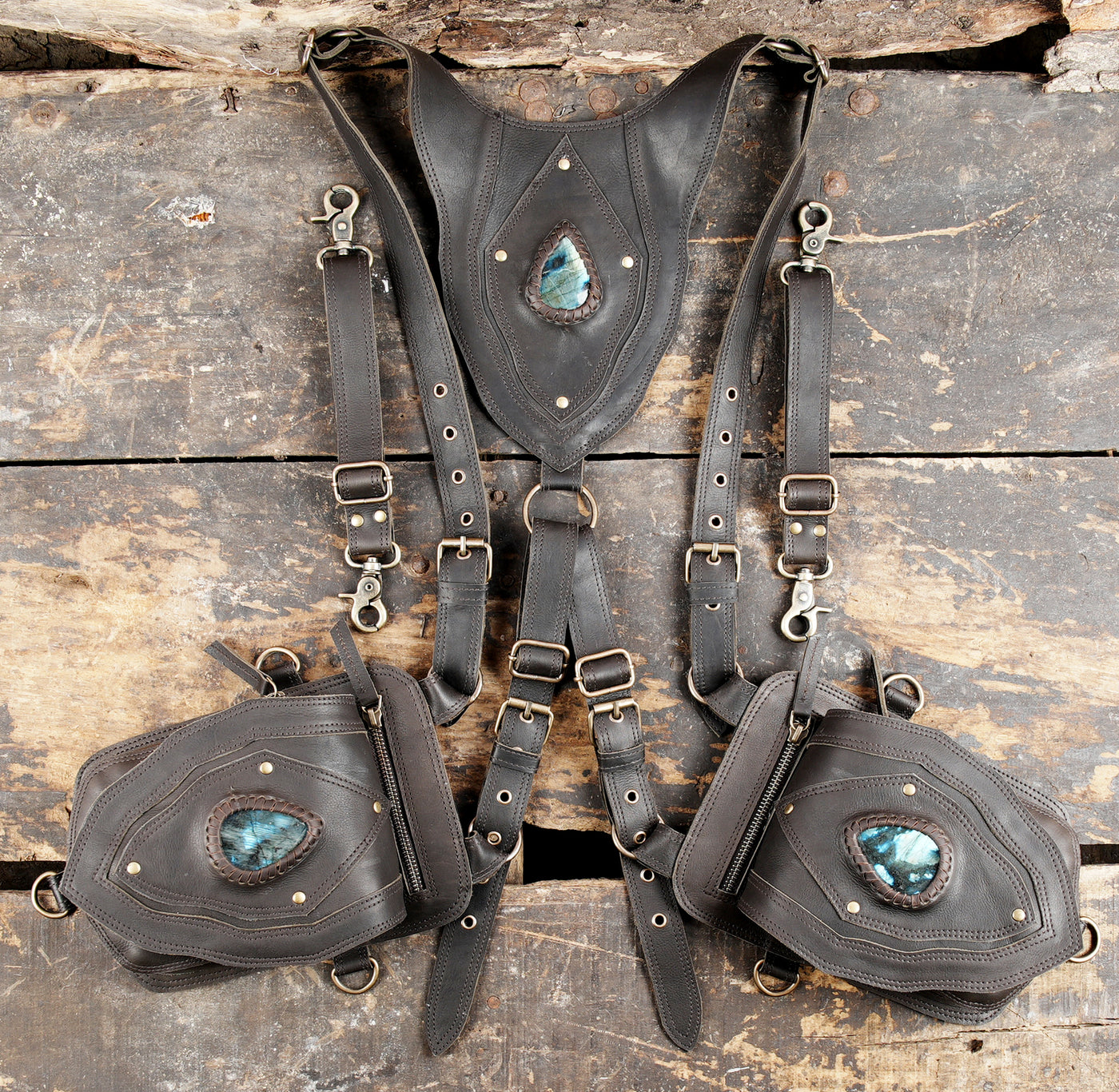 Crafted from premium black leather, this dual-pouch holster features a striking blue gemstone centerpiece on each pocket, highlighted by layered panel detailing and precise hand-stitching. The adjustable shoulder and side straps ensure a secure, customizable fit, while the zipper pockets provide safe storage for essentials. Designed for festivals, travel, outdoor adventures, and hands-free daily use, this unisex holster combines functionality with bold artistic craftsmanship.