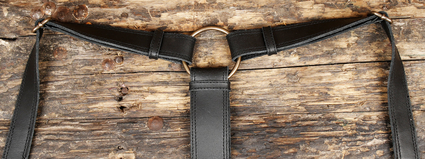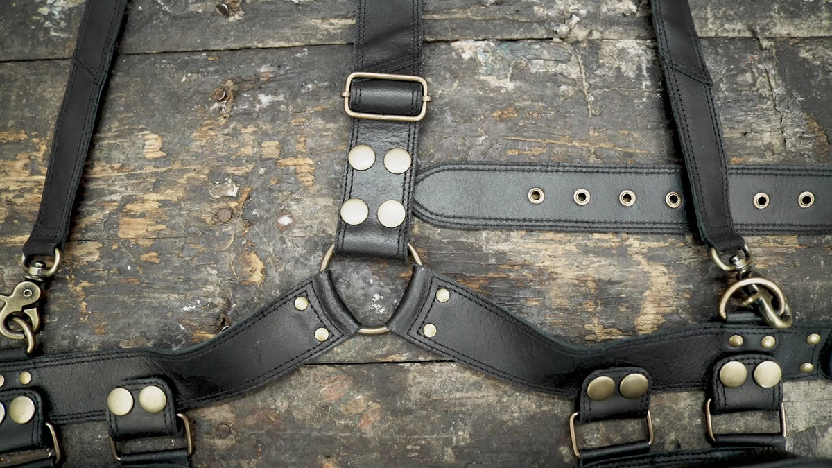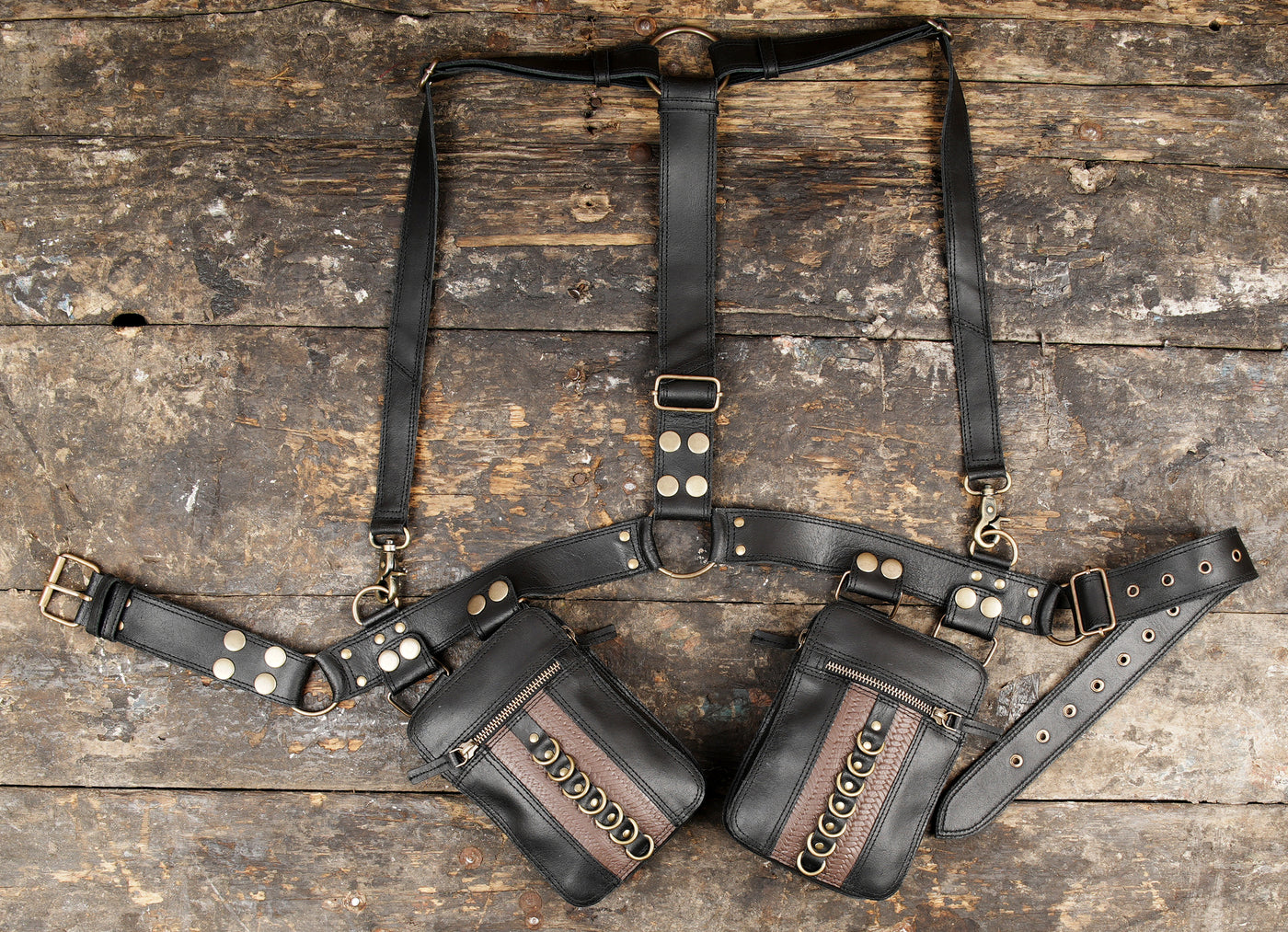Premium Leather Holster Harness with Dual Pouches || Steampunk Style Leather Holster Belt with Pouches (LT/AB/HLS/6115) - Black / Free Size / Antic Brass