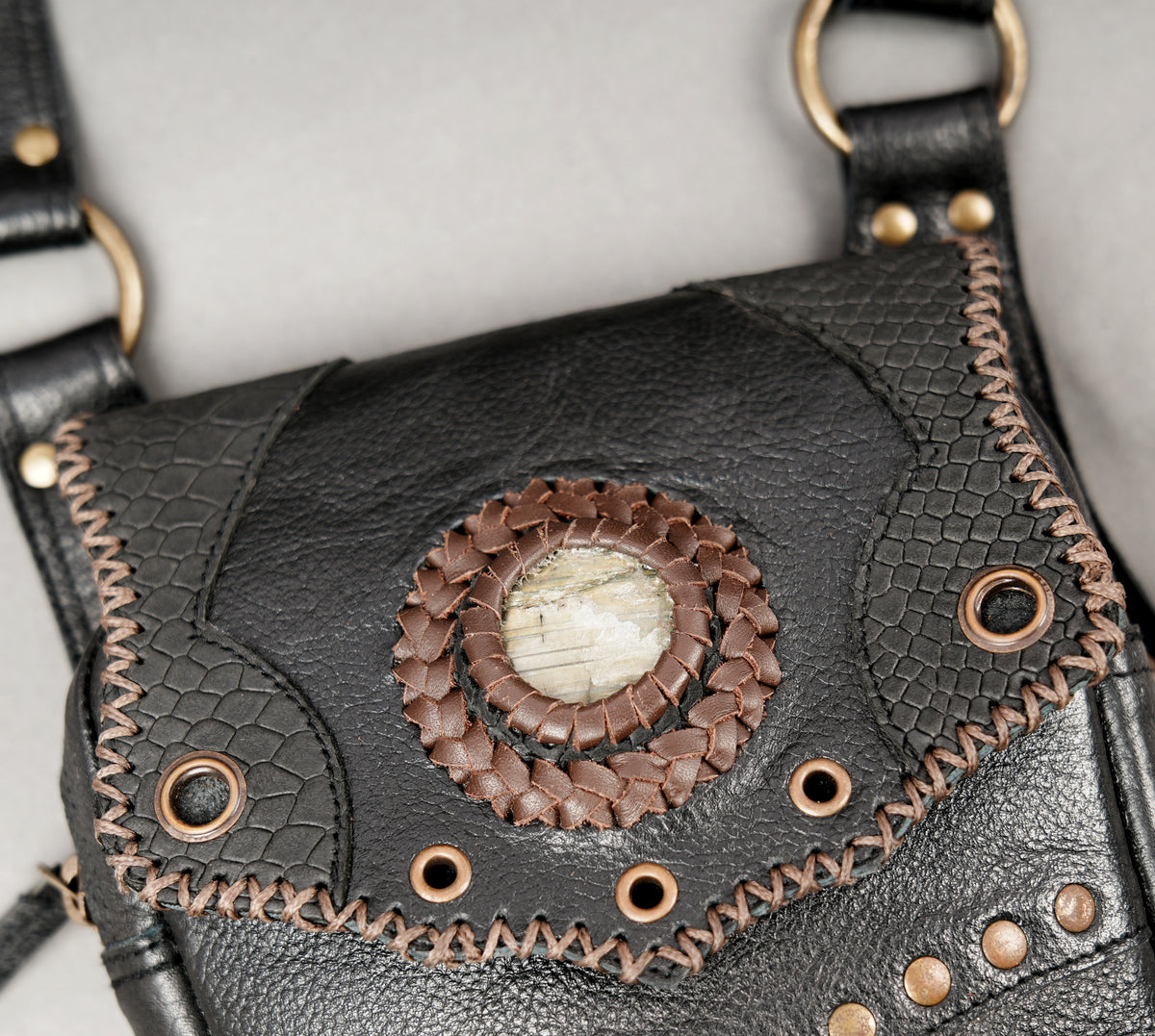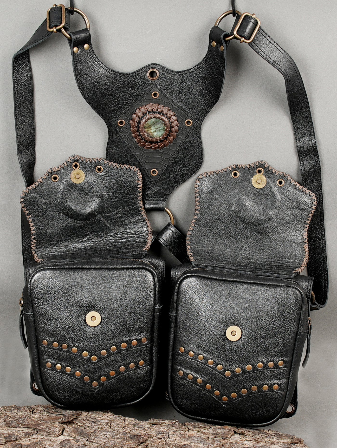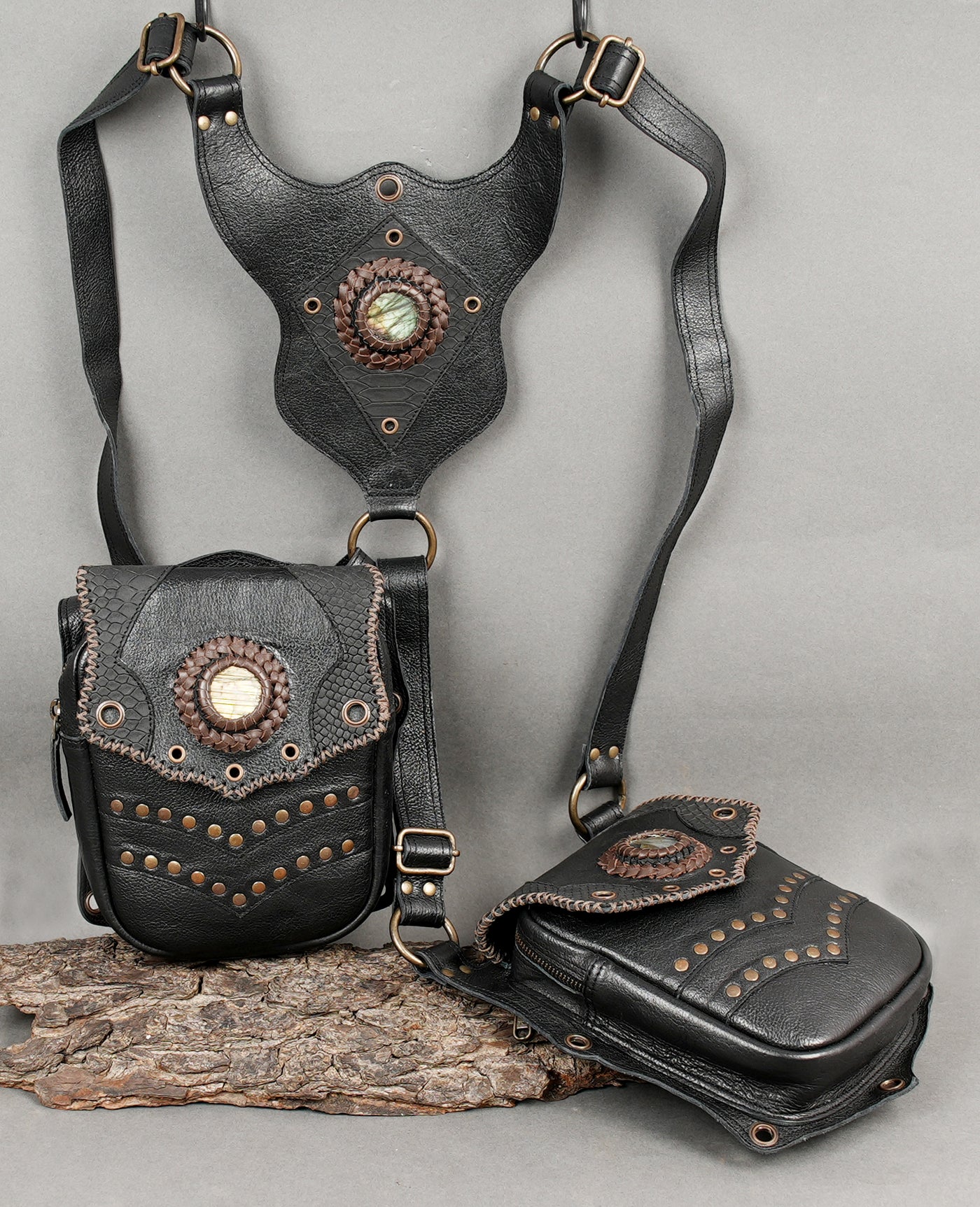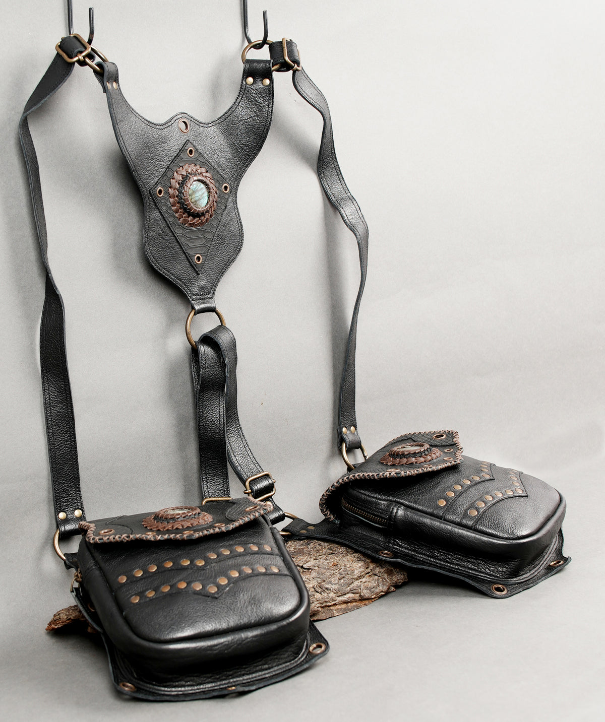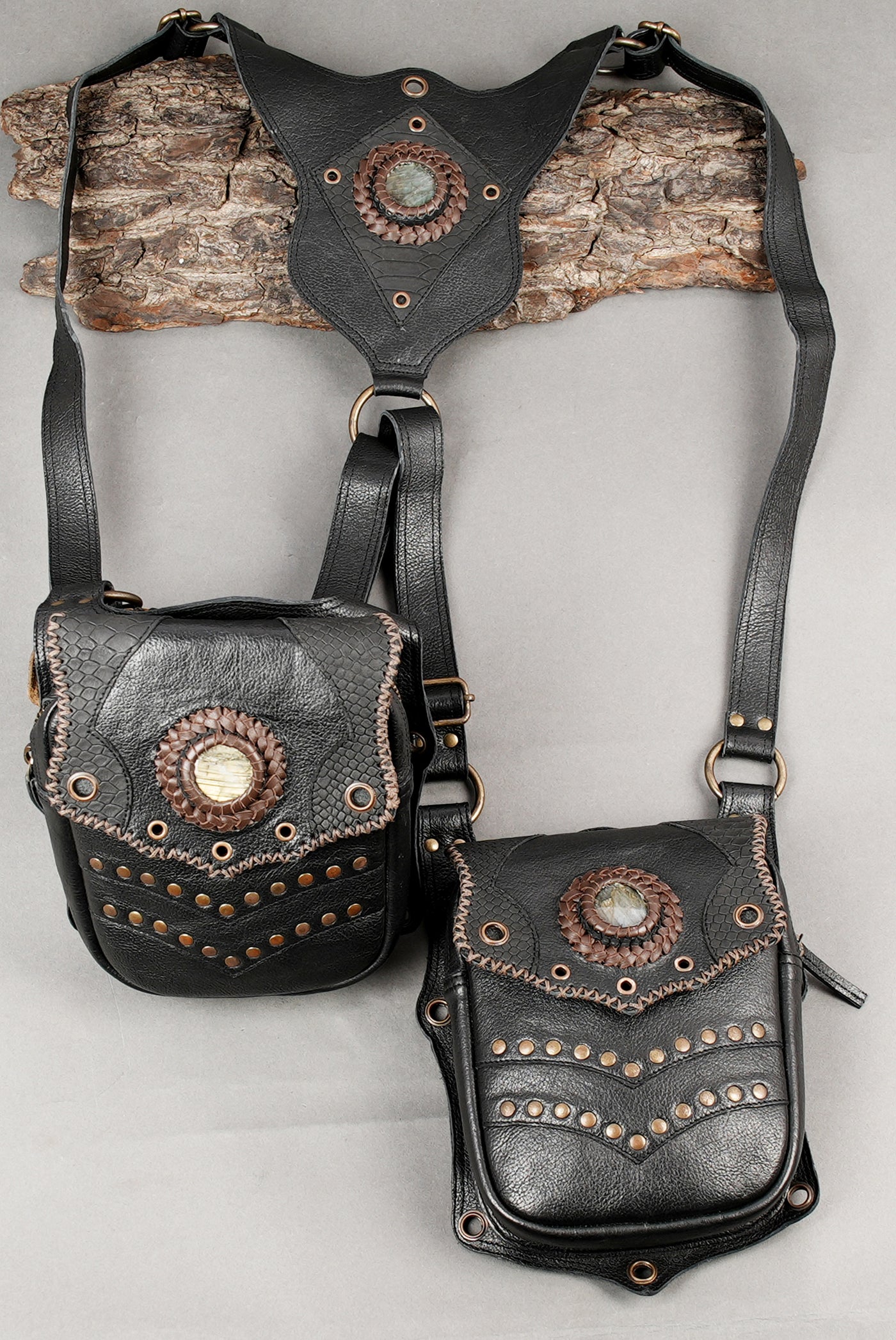 This leather holster is carefully handcrafted from quality leather with neat stitching and sturdy metal hardware for reliable, long-term use. Its dual pouch design provides practical space for carrying essentials like a phone or small accessories, while the decorative stone centerpiece, studs, and embossed details add a refined steampunk and gothic touch. Adjustable straps and secure buckles ensure a comfortable fit for different body types, making it a stylish and functional choice for festivals, cosplay, and themed occasions.