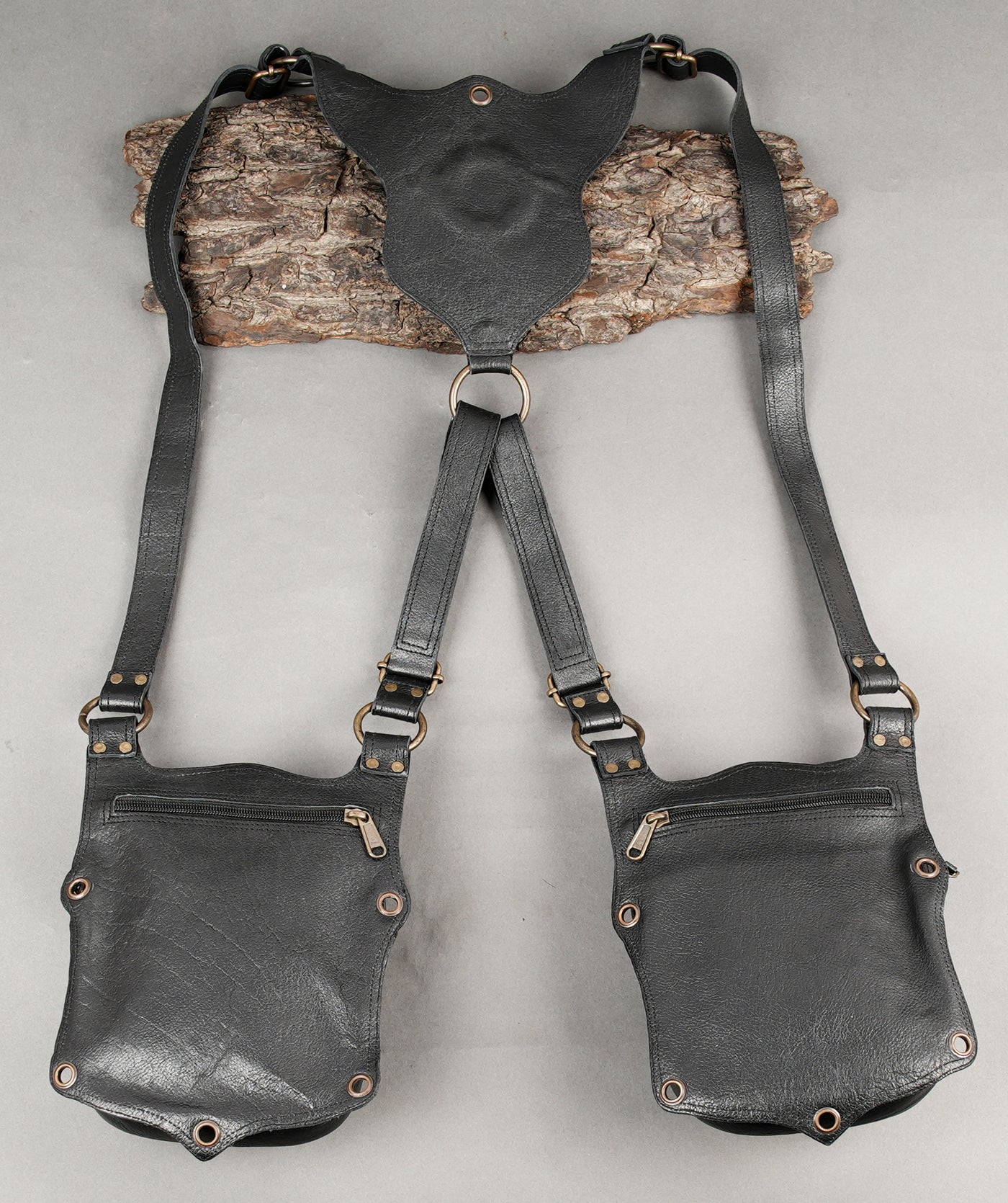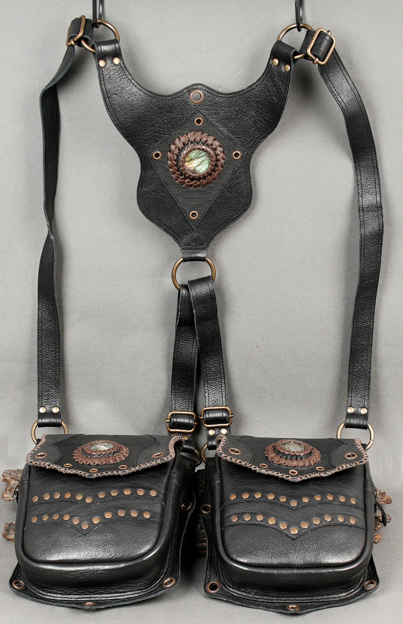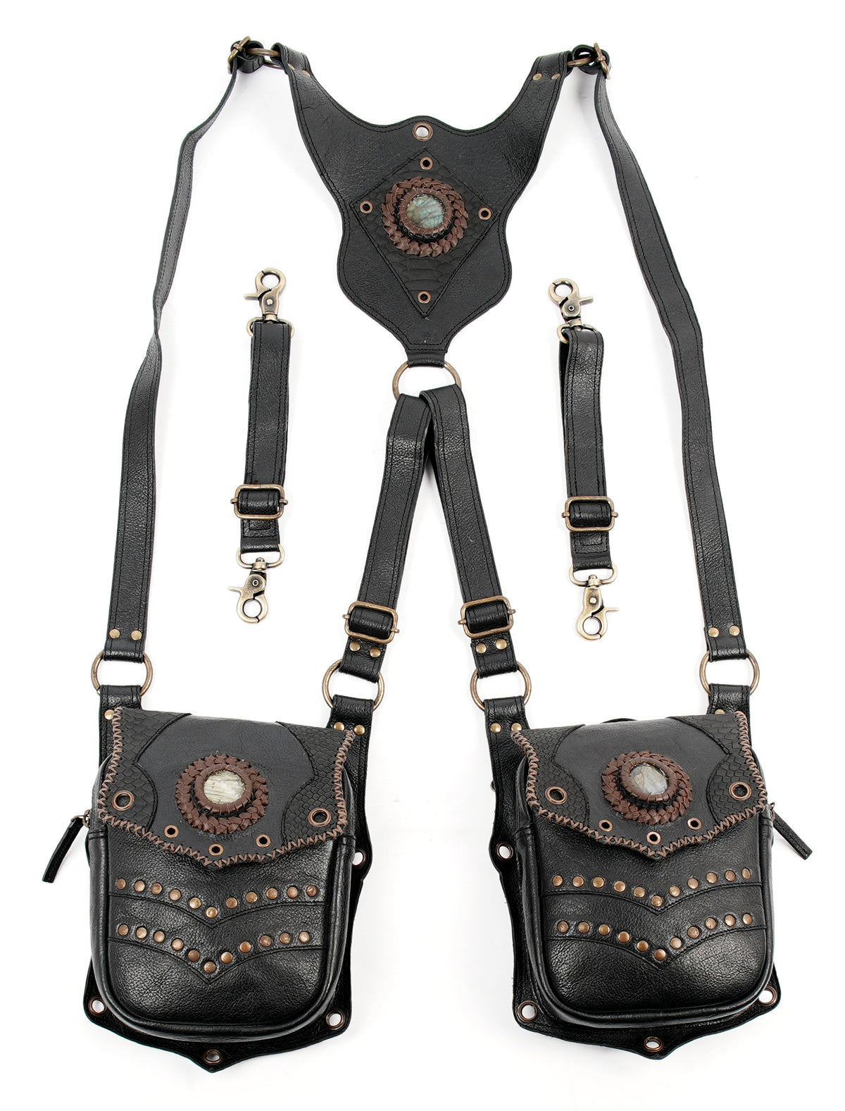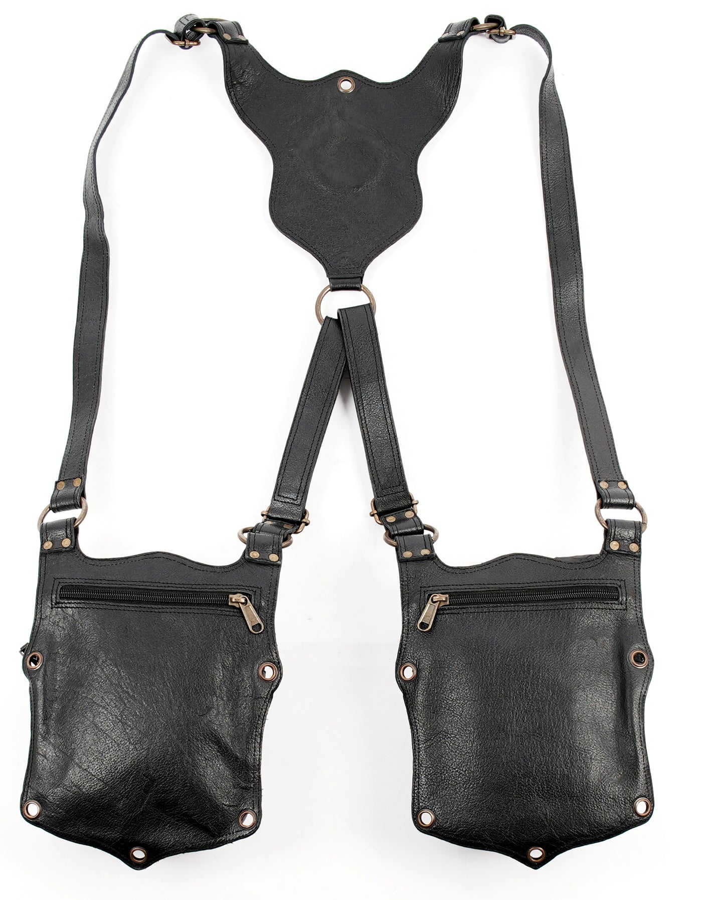 Premium Steampunk Dual Pouch Leather Holster Harness || Adjustable Leather Harness Holster for Festival and Cosplay Wear (LT/AB/HLS/6063) - Black / Free Sized / Antic Brass