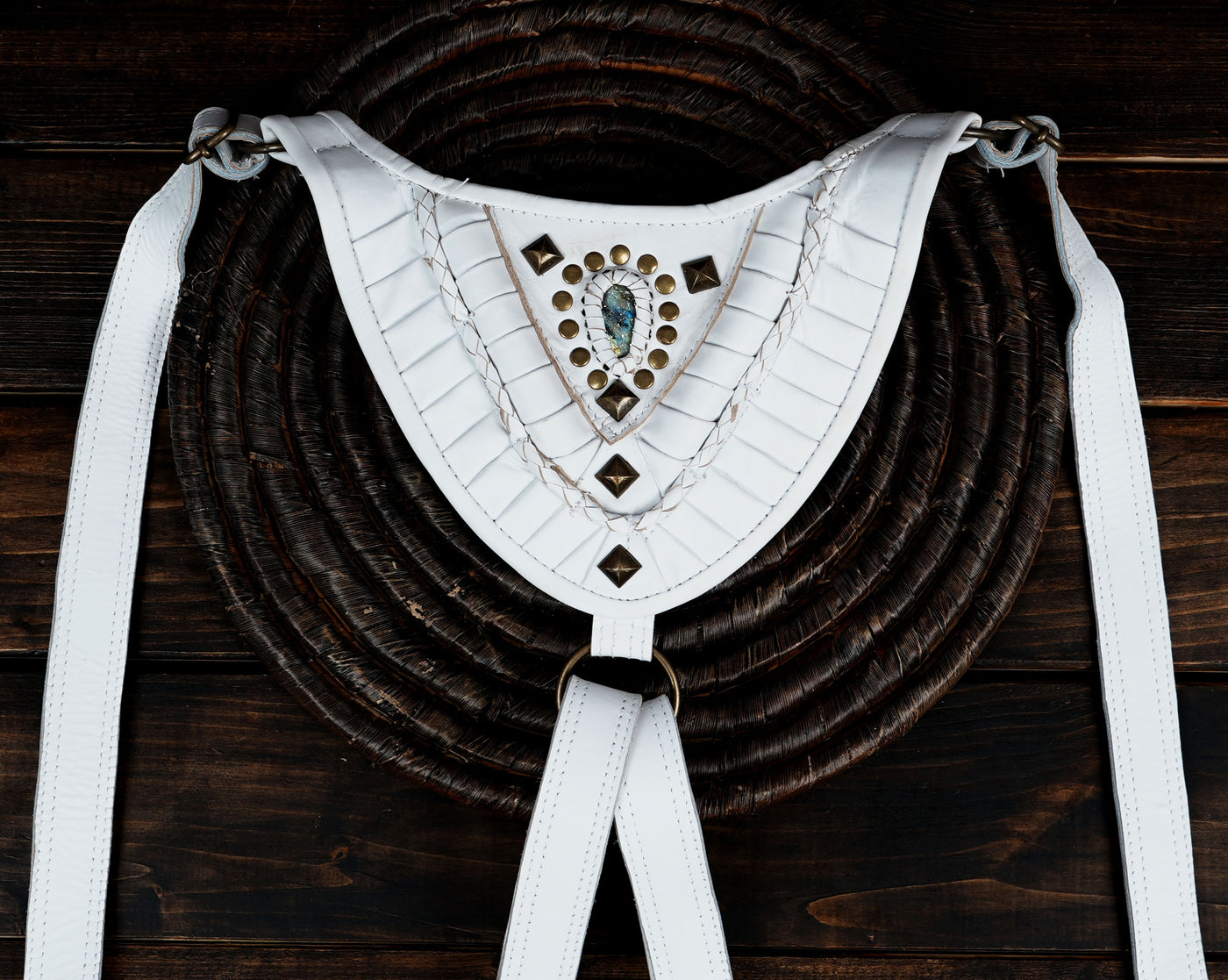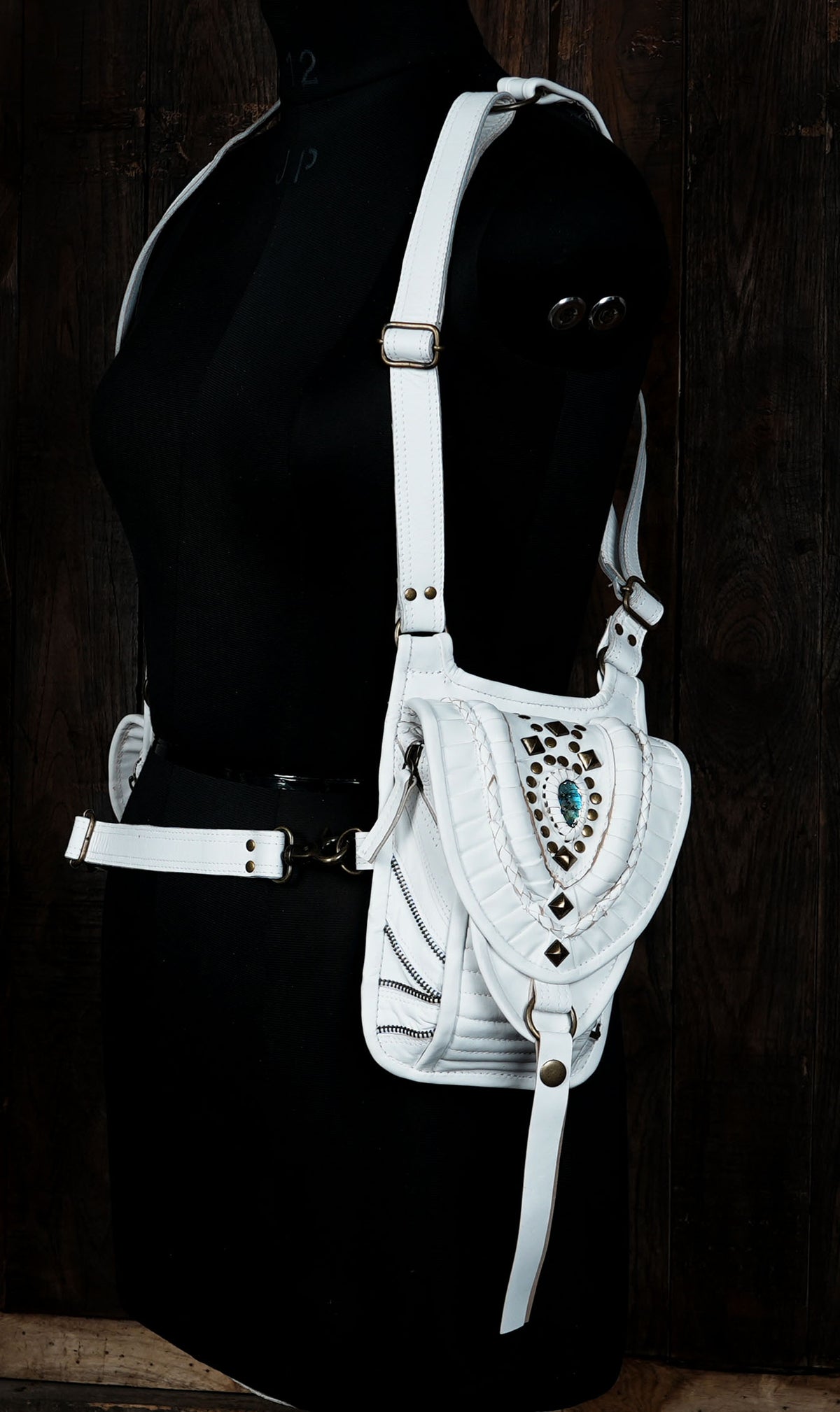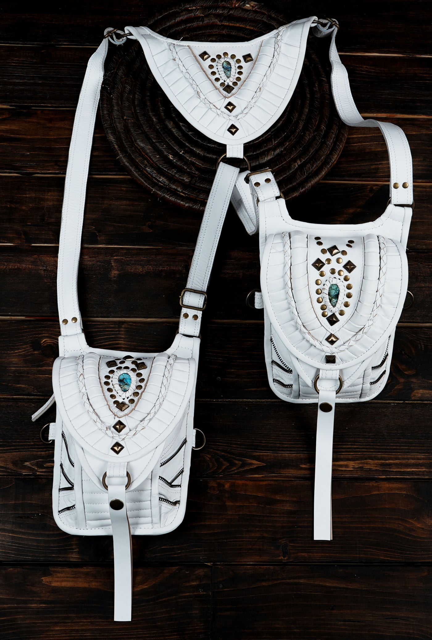 This handmade genuine leather holster is crafted from premium white leather with fine stitching and detailed finishing for a refined look. Designed for festivals, cosplay, travel, or everyday statement wear, it features a striking turquoise-style gemstone accent that adds a bold tribal touch. With its unique design and secure flap, snap, and strap closures, it beautifully blends style, function, and artistry while keeping your essentials safe on the move.