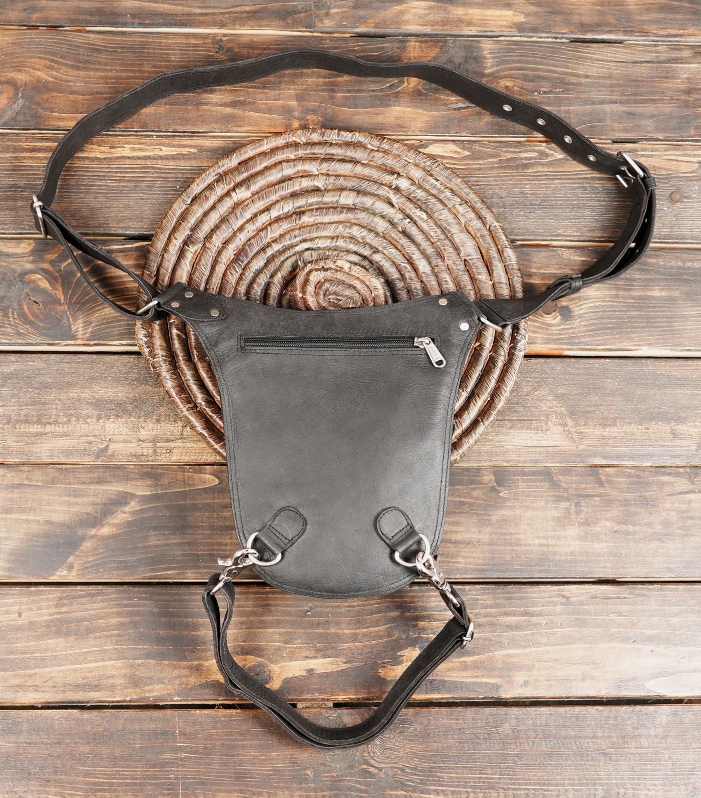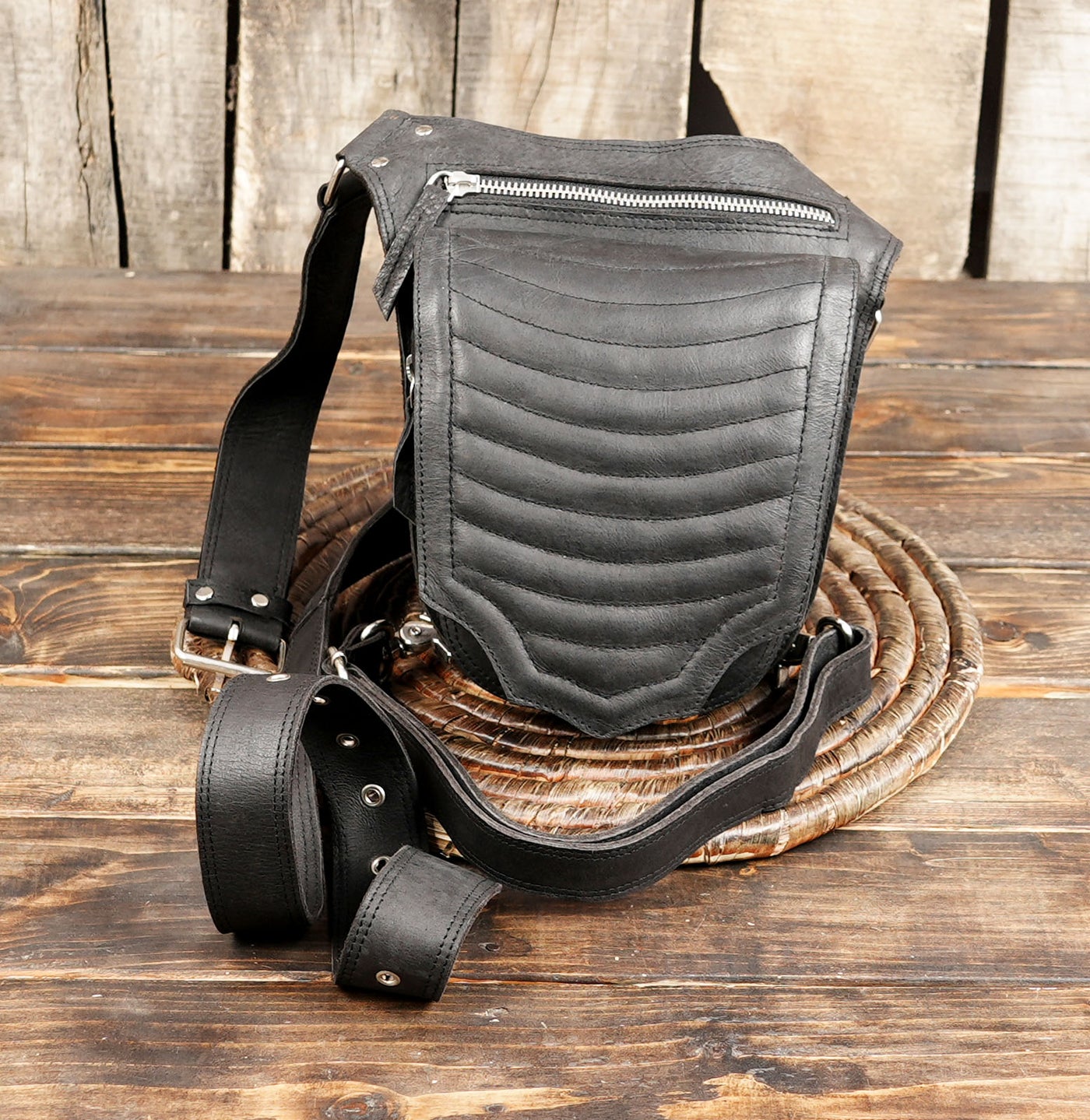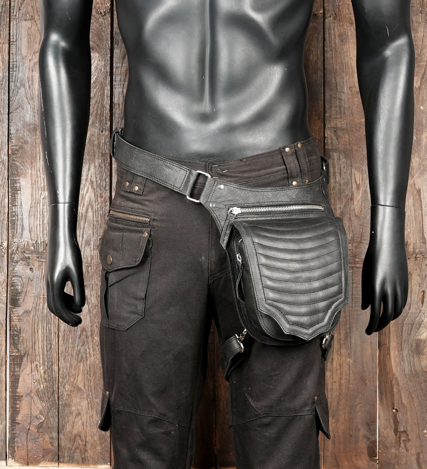 Handmade Steampunk Black Leather Waist & Thigh Belt | Festival Hip Bag for Unisex | Cosplay Hip Pouch with Zipper Pocket (LT/NS/WBTS/6025) - Black / S = 28 to 32