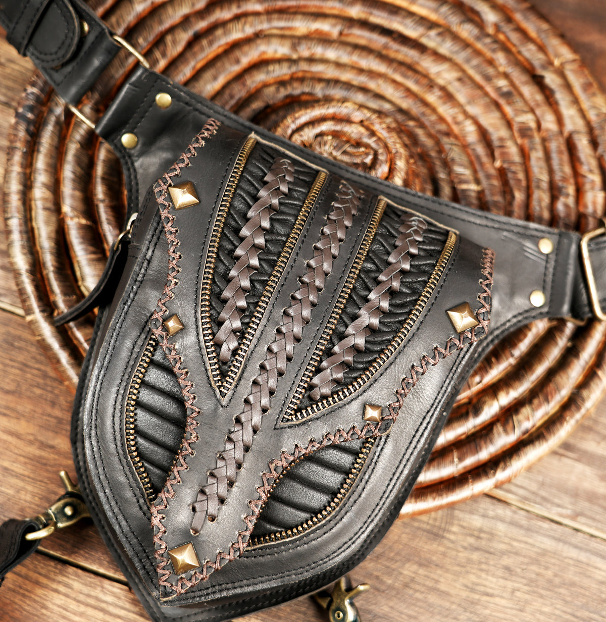 Handmade Leather Waist Thigh Belt with Braided Tribal Design || Boho Leather Waist Thigh Belt for Cosplay and Events (LT-AB-WBTS-6031) - Black / S - 28 TO 32 / Antic Brass