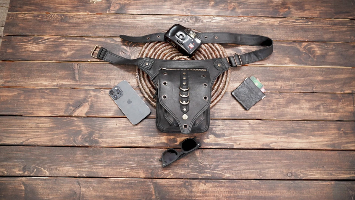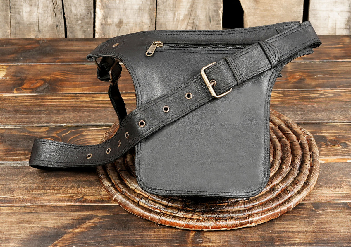 This piece is crafted from premium leather and built to feel strong and long lasting. The front flap closes securely with snap buttons and a zipper to keep your essentials protected. It’s finished with metal rings and rivets that add a rugged, edgy touch. The design keeps your hands free while giving you space for a phone, wallet, keys and other daily items. It works well for both men and women who like practical gear with a clean, stylish look.