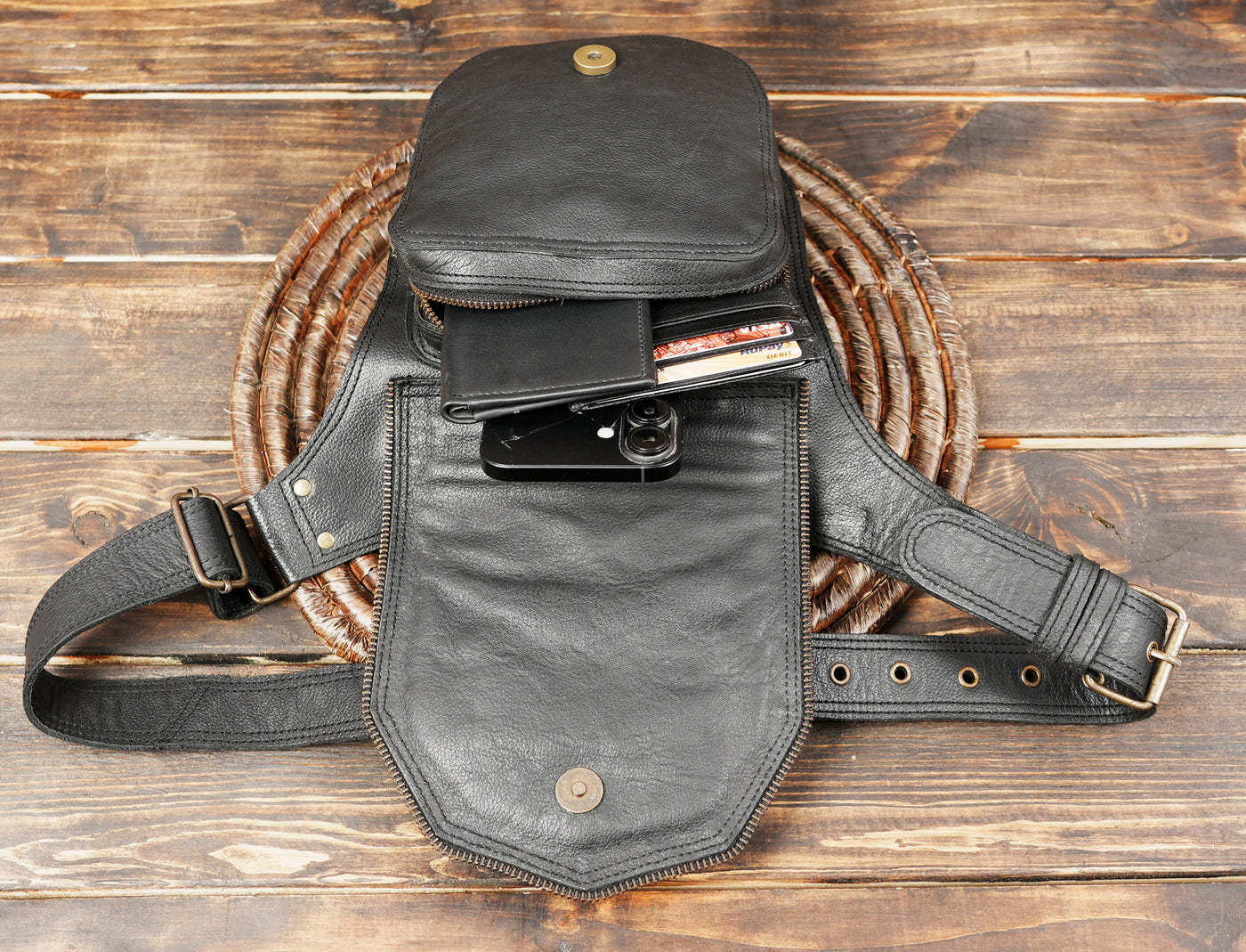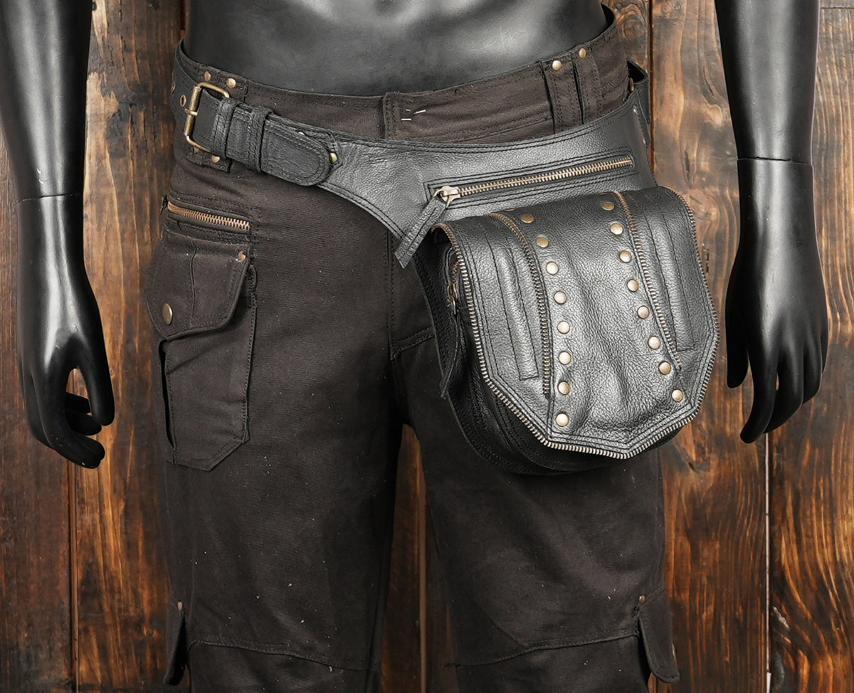 Premium Handmade Leather Utility Belt || Multi-Pocket Leather Festival Belt (LT-AB-WB-6052) - Black / S - 28 TO 32 / Antic Brass