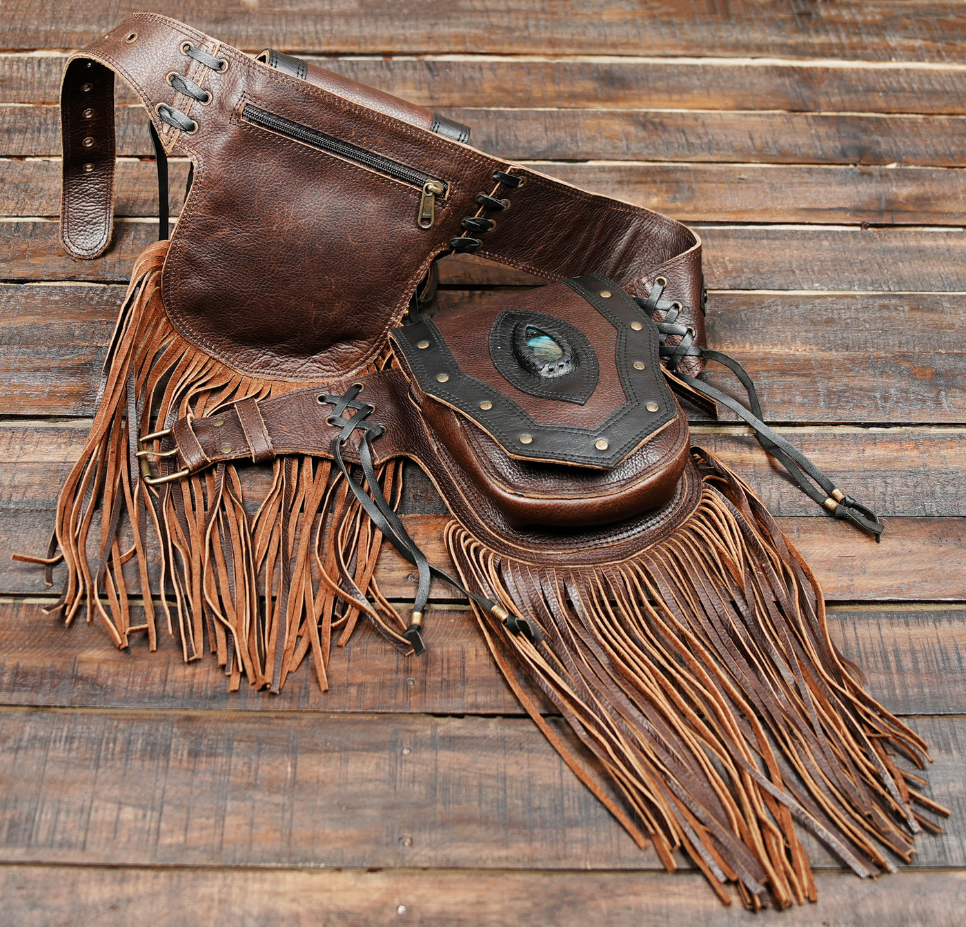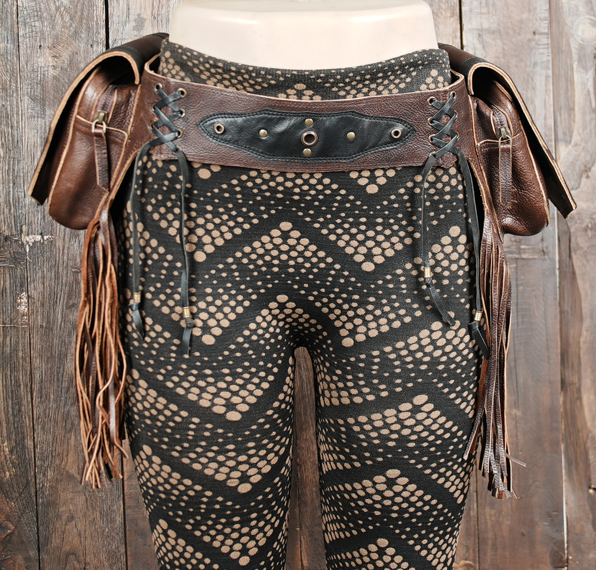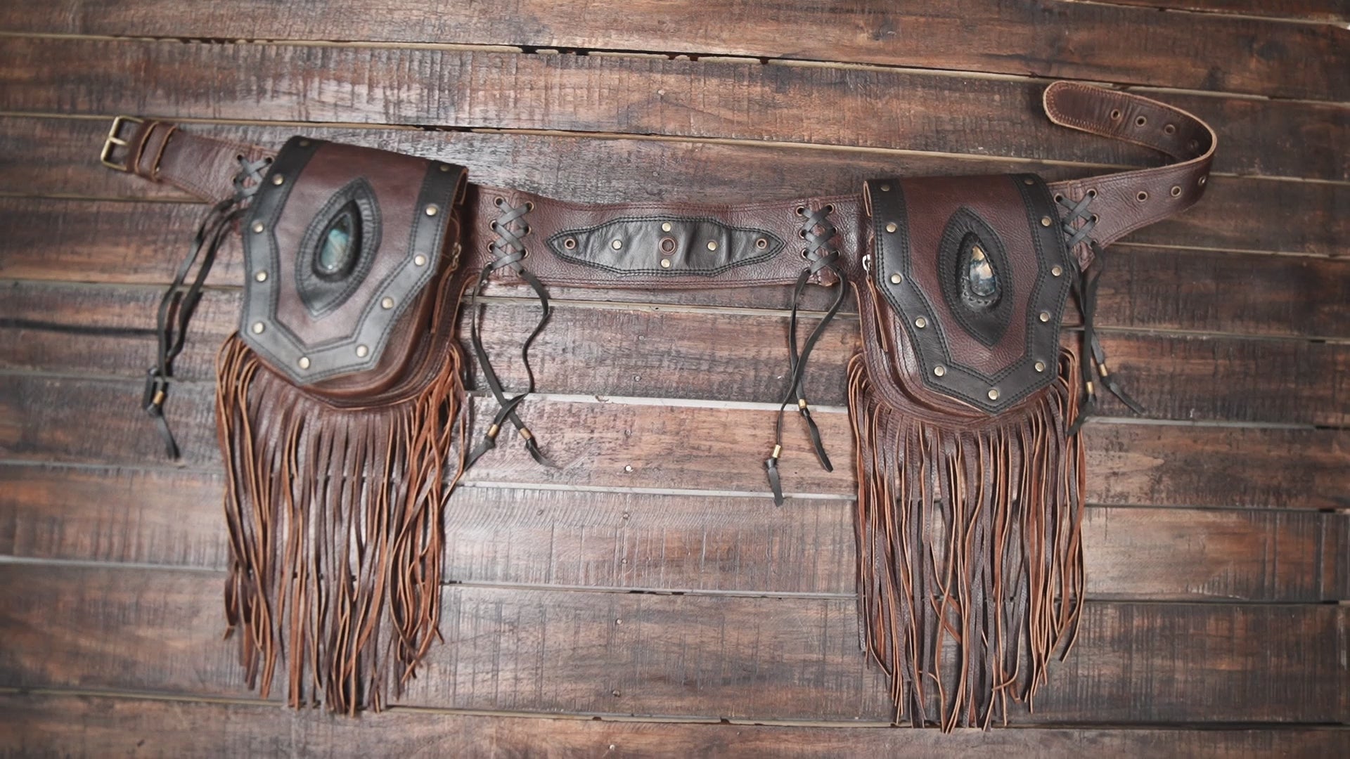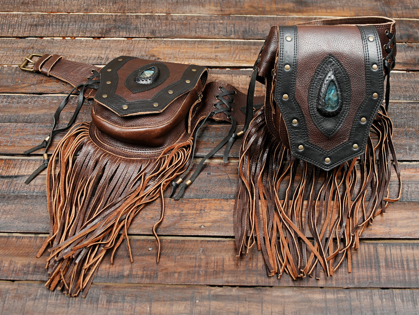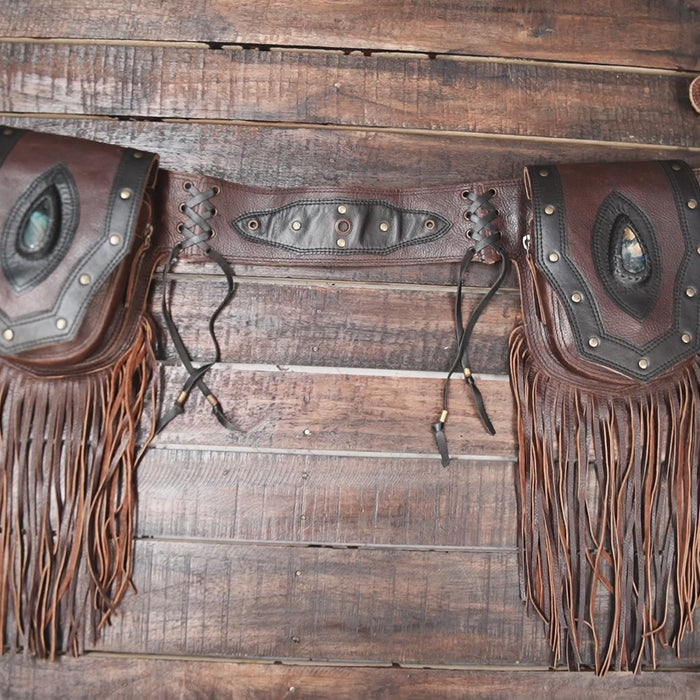 Leather Waist Bag with Gemstone Embellishments || Brown & Black Leather Belt with Dual Pouches (LT-AB-WB-6101) - Dark Brown / S – 28 TO 32 / Antic Brass