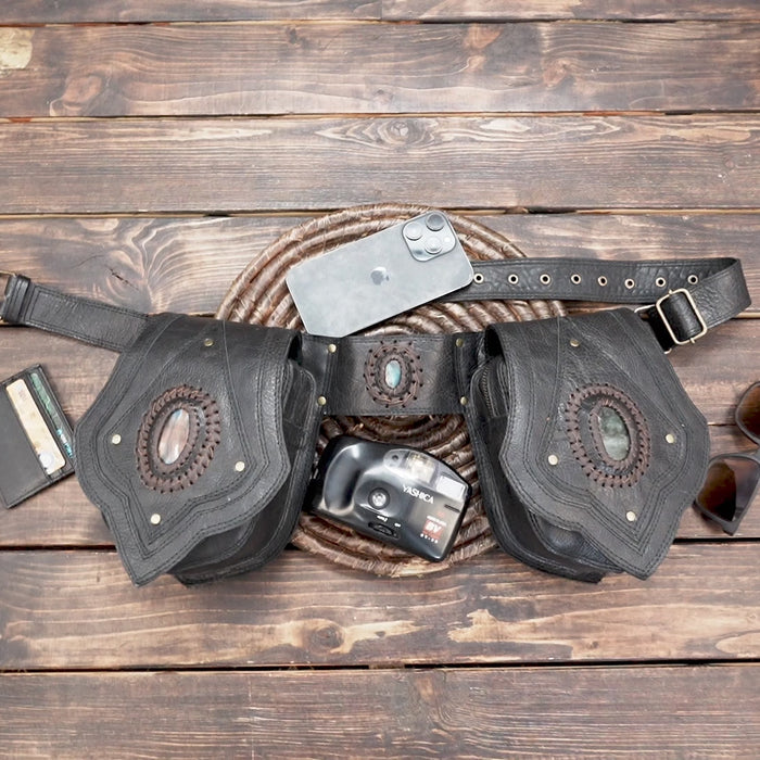 Handmade Black Tribal Leather Waist Belt with labradorite gemstone – Gothic Boho Hip Bag with Stone Accents (LT-AB-WB-6080) - Black / S - 28 TO 32 / Antic Brass