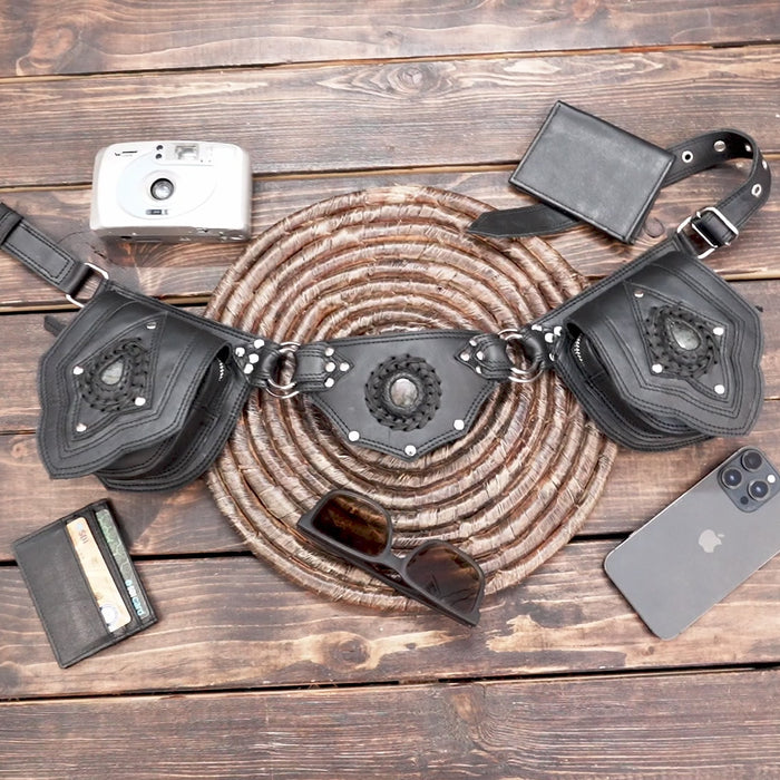 Handmade Black Leather Waist Belt with Gemstone Accents || Leather Waist Belt with Dual Storage Pouches and Metal Rings (LT-NS-WB-6046)