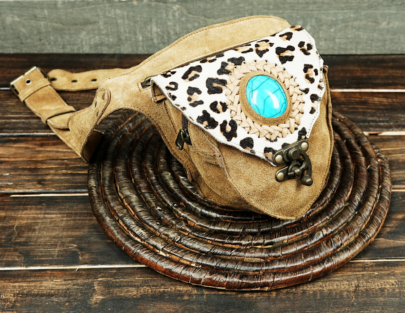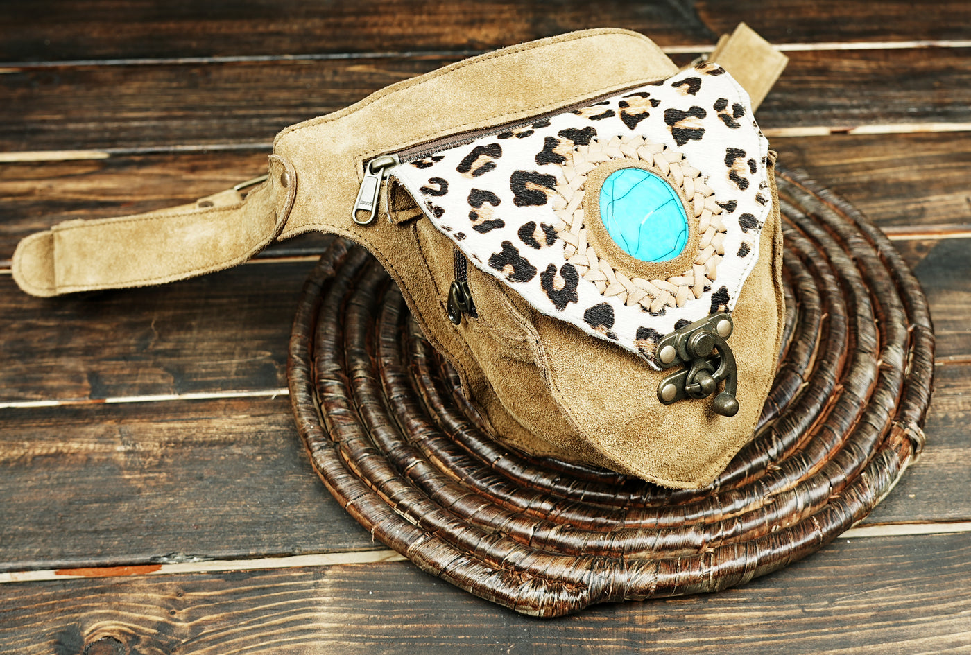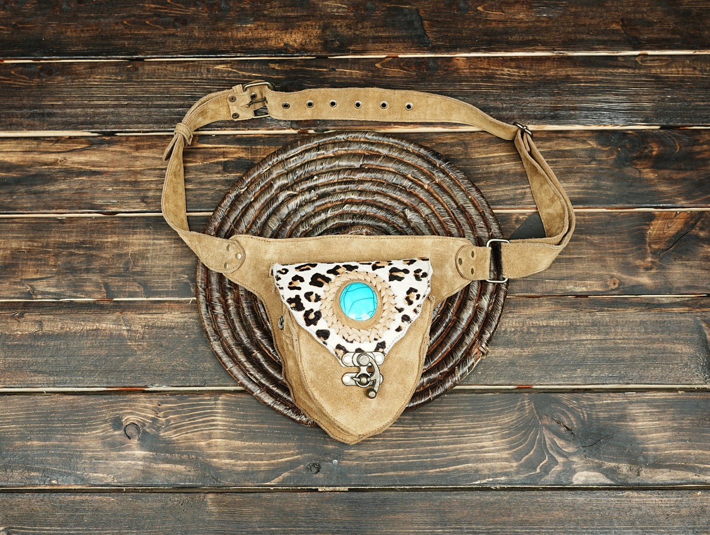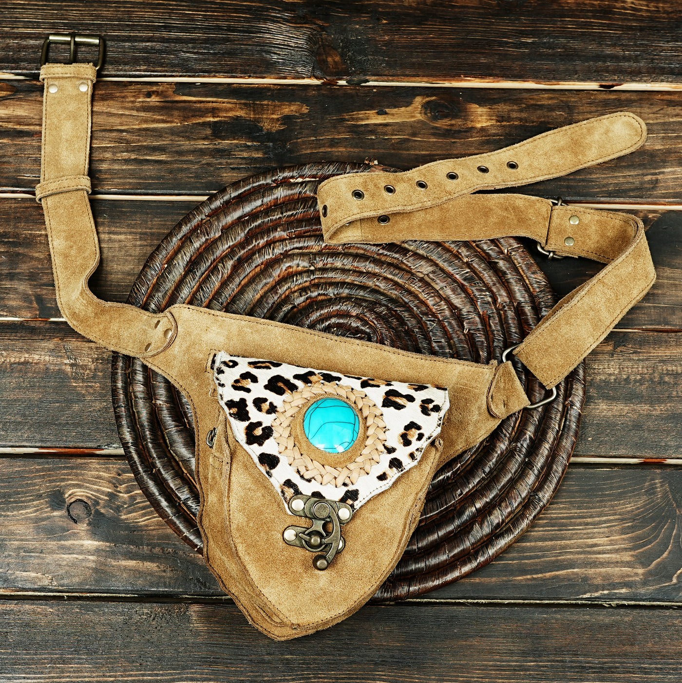 Handcrafted Suede Leather Waist Belt with Turquoise Gemstone || Boho Suede Leather Waist Belt (LT/AB/WB/6193) - Light Brown / S = 28 to 32 / Antic Brass