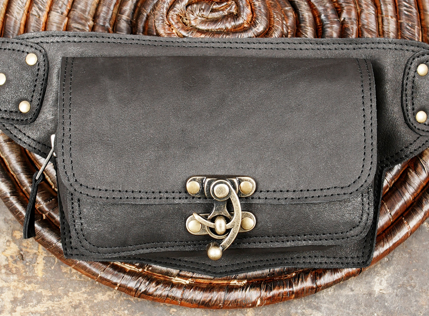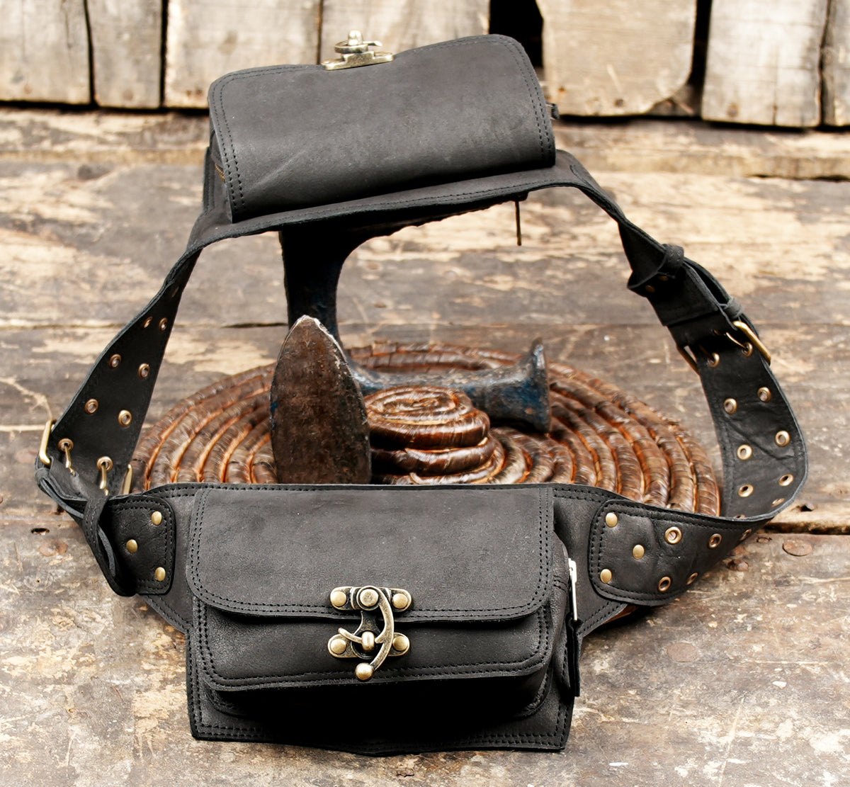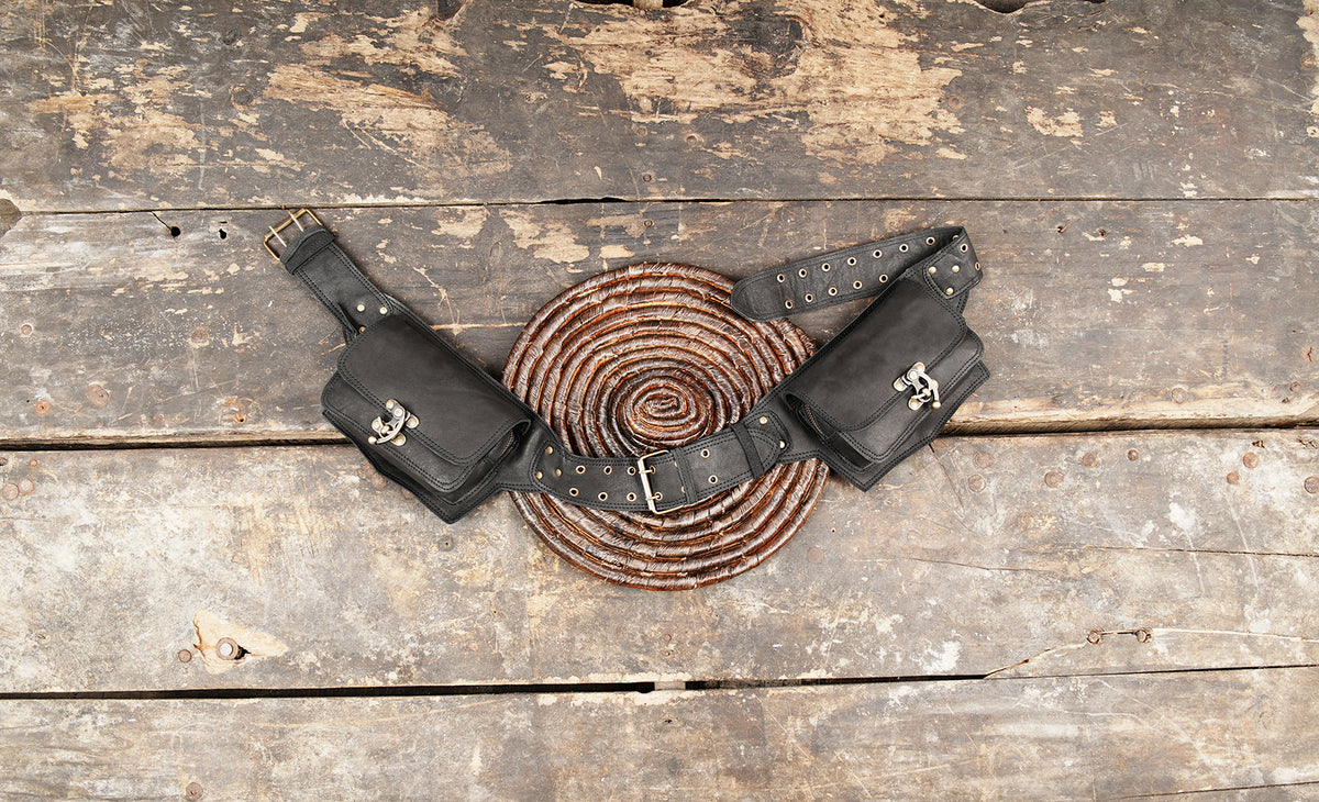 Handmade Black Leather Waist Belt with Dual Utility Pouches – Festival & Travel Ready (LT-AB-WB-6188) - Black / S = 28 to 32