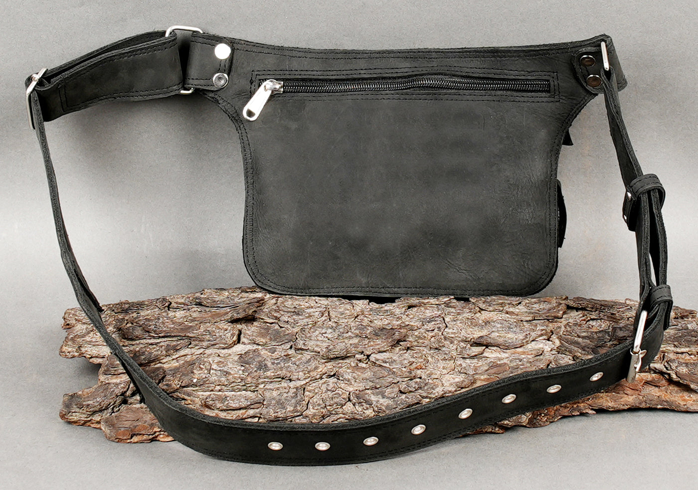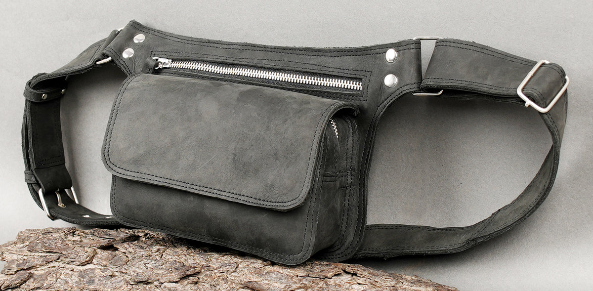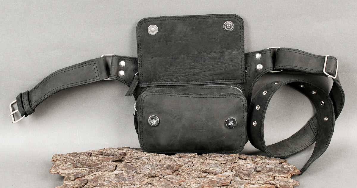 Handmade Black Leather Waist Belt with Zippered Utility Pouch || Black Leather Waist Belt Bag for Everyday Carry (LT/NS/WB/6033) - Black / S = 28 to 32 / Antic Brass