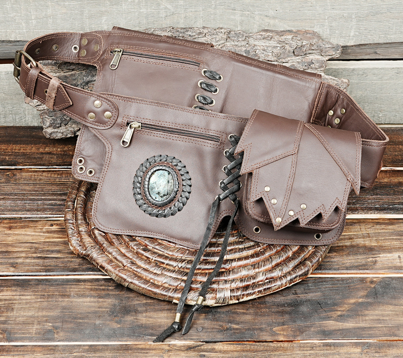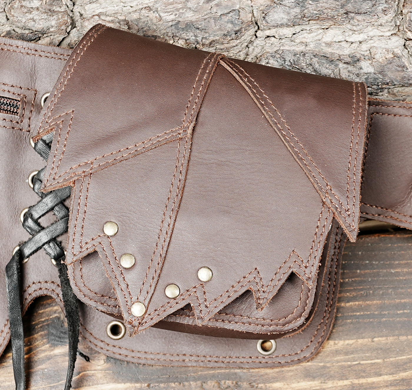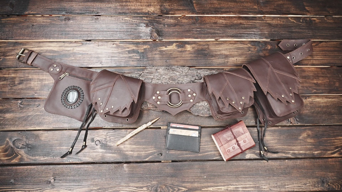 Handmade Brown Leather Waist Belt with Multiple Pouches || Handcrafted Leather Waist Belt with Functional Storage Pouches (LT-AB-WB-6165) - Dark Brown / S – 28 TO 32 / Antic Brass