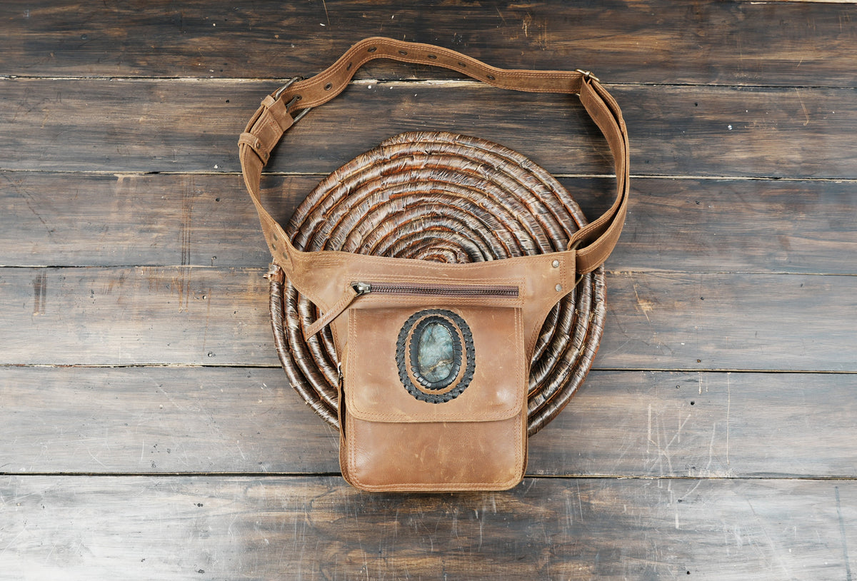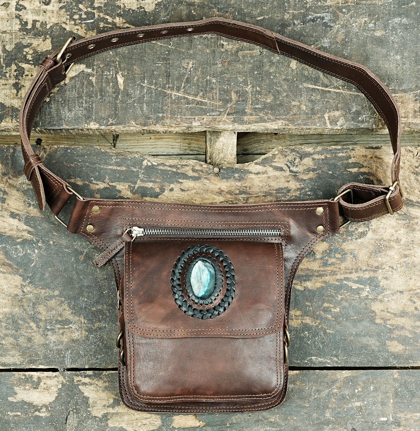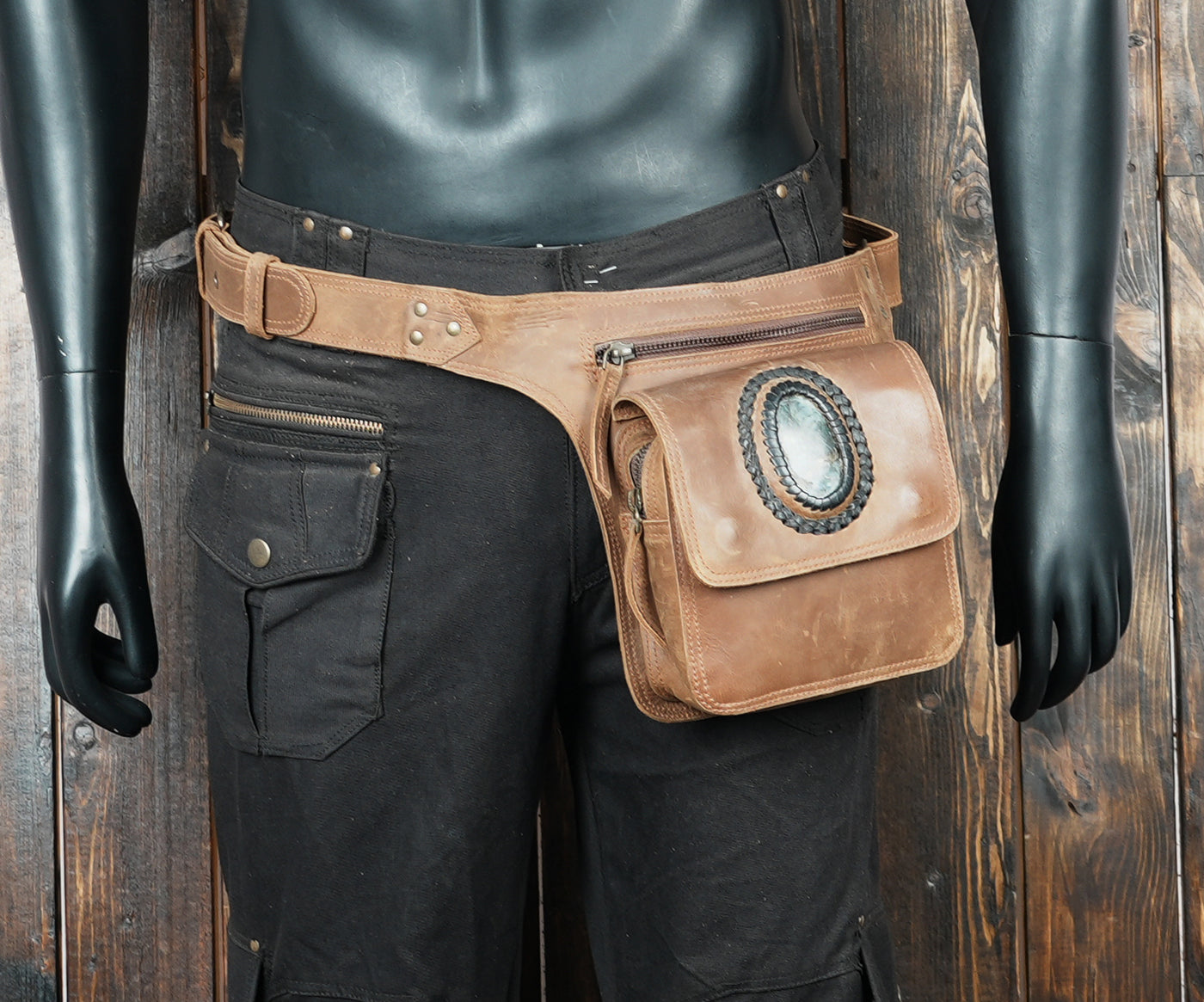Handmade Brown Leather Waist Belt – Utility Bag with Gemstone Accent (LT-AB-WB-6021) - Brown / S = 28 to 32 / Antic Brass